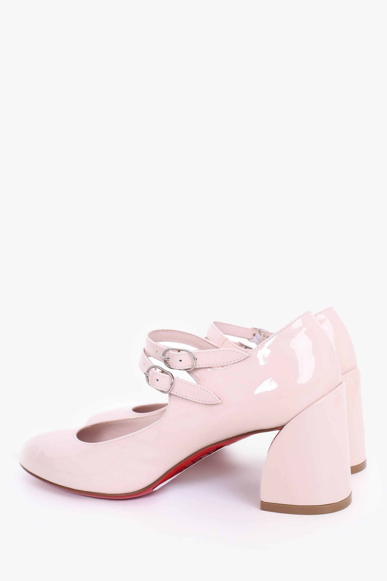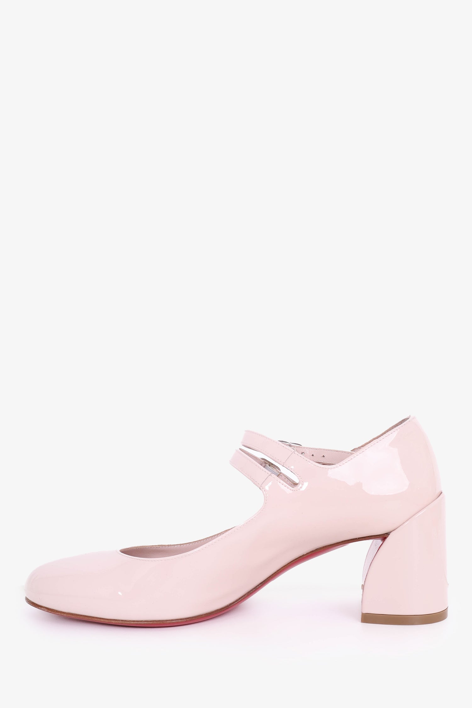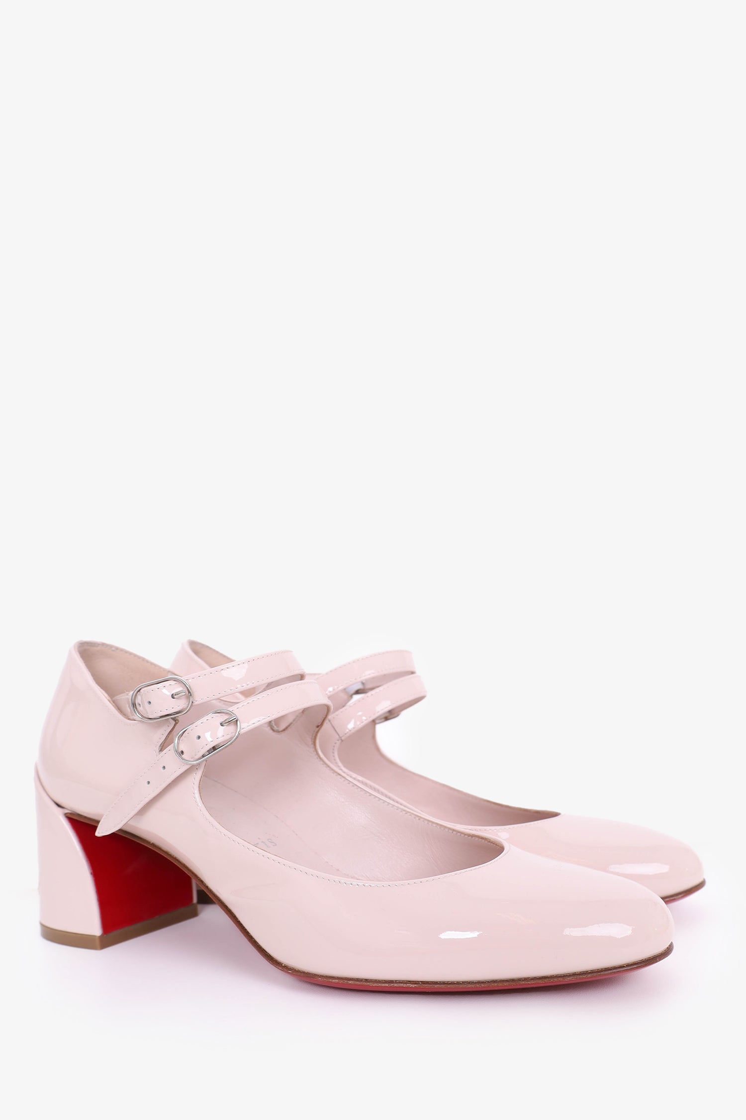 Refresh availabilityChristian Louboutin Beige Patent Miss Jane 55 mm Mary Janes. Ankle strap closure. Block heel. Round toe. Tonal stitching.