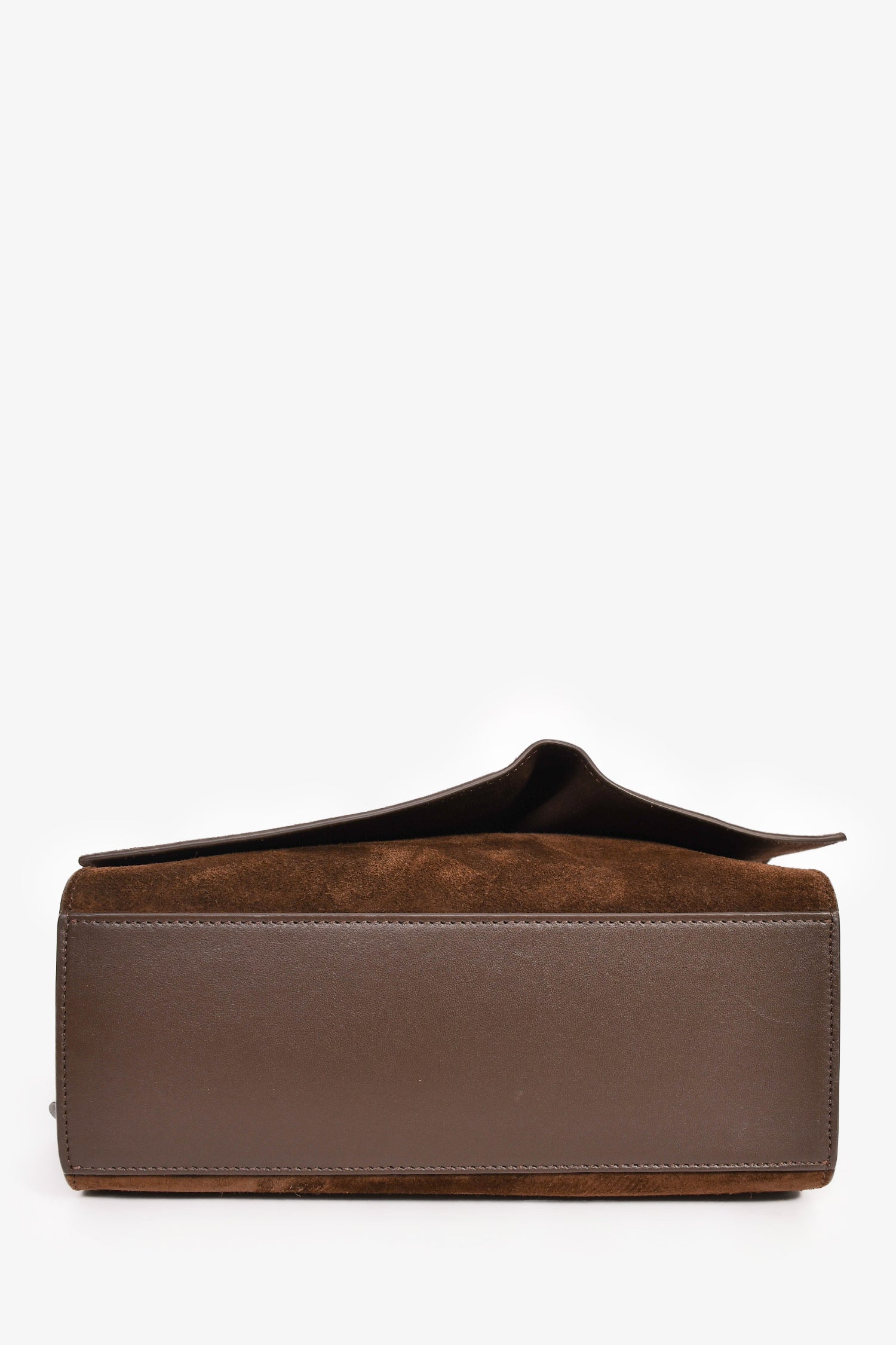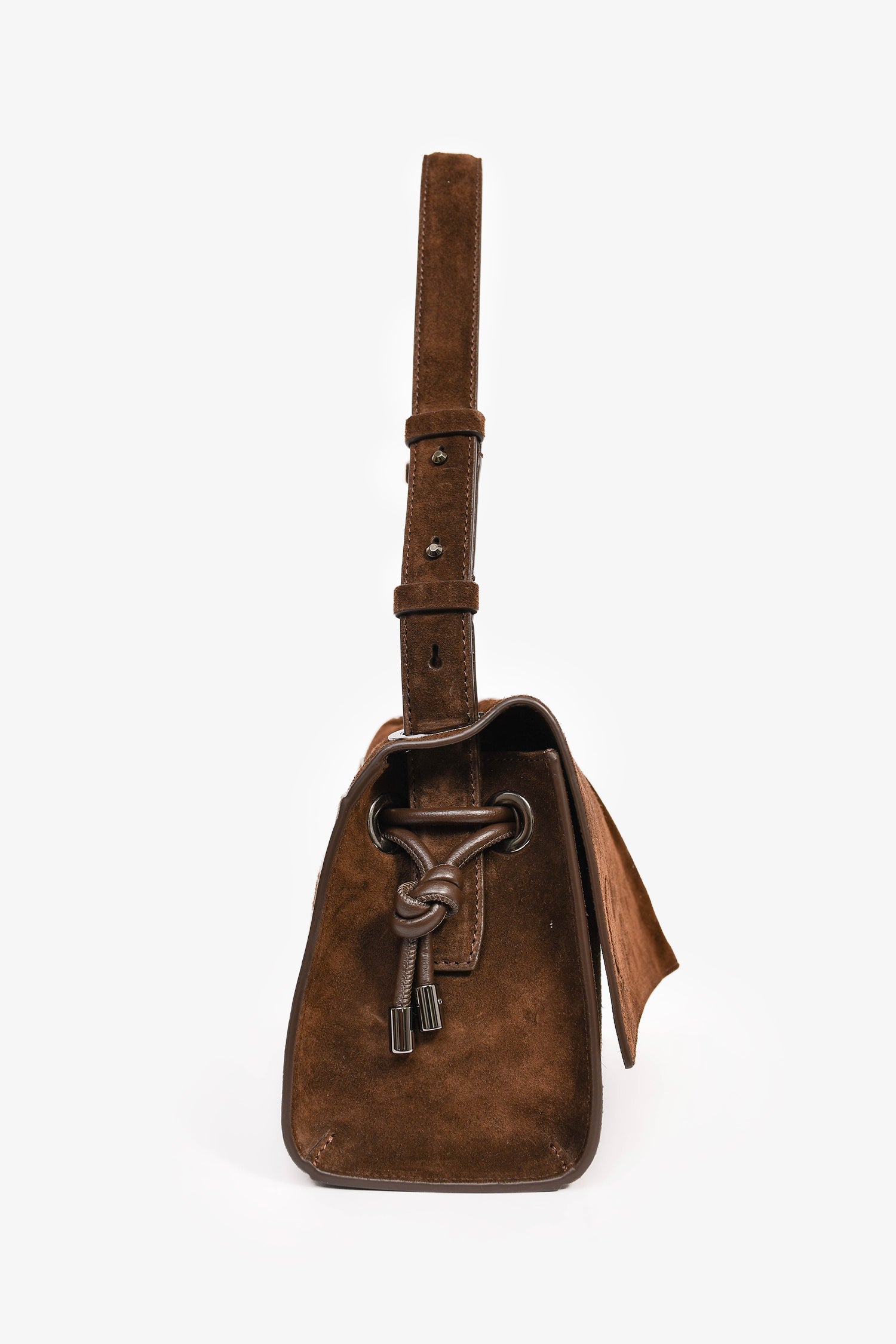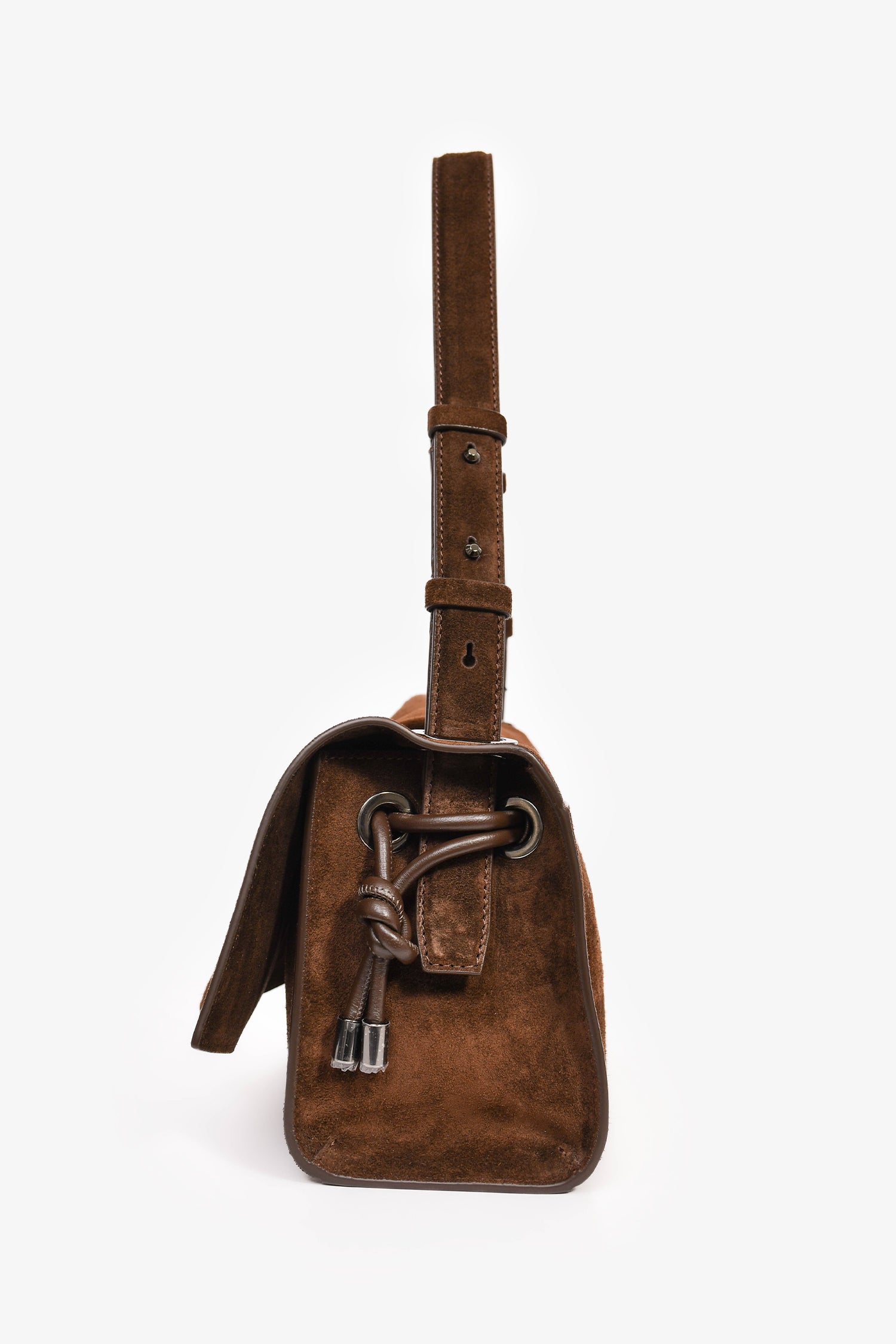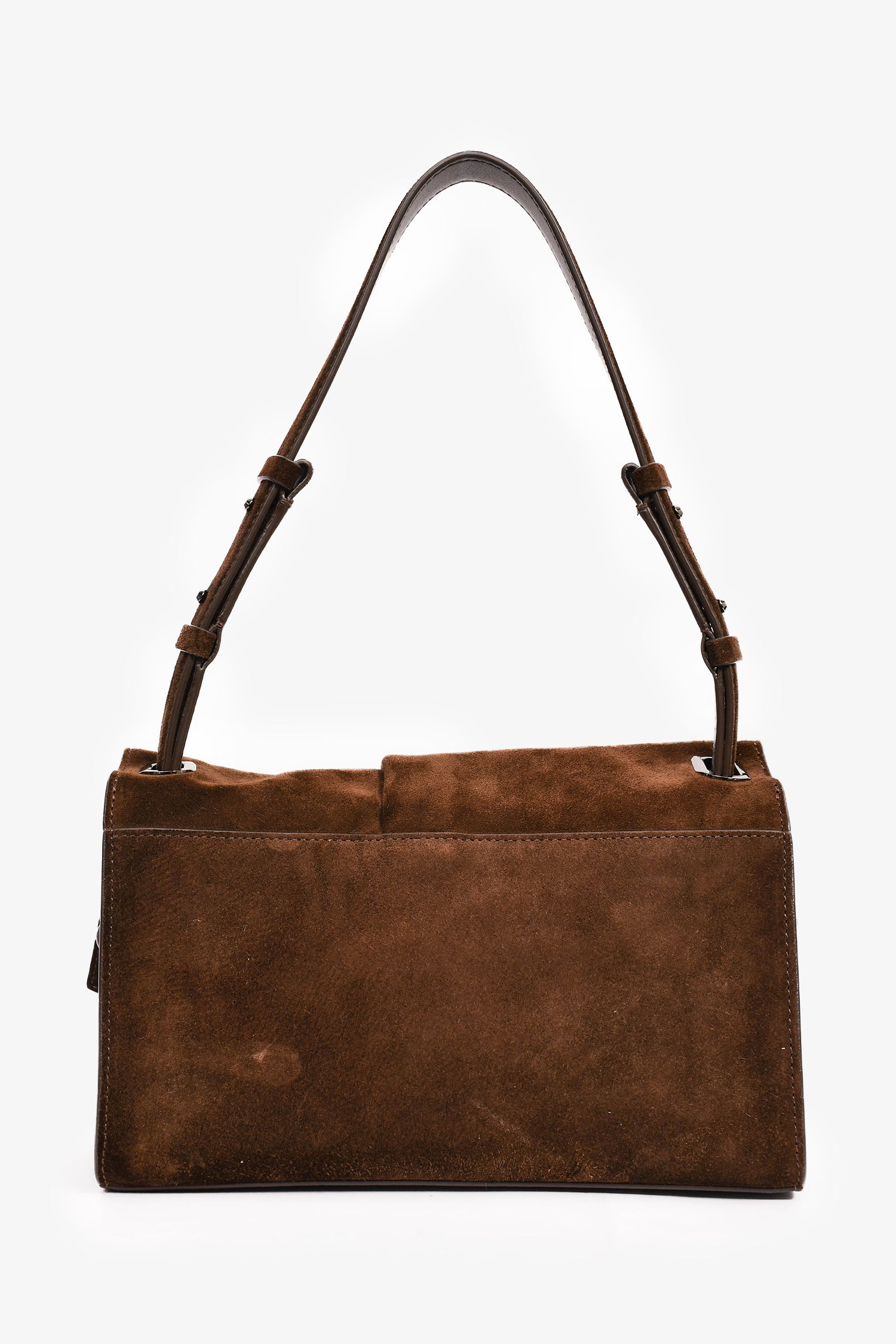 Refresh availabilityChristian Louboutin Brown Suede Baggy Small Shoulder Bag. Fold-over flap. Silver-tone hardware. Adjustable shoulder strap. Interior leather pouch. Zipped wall compartment. Tonal stitching.