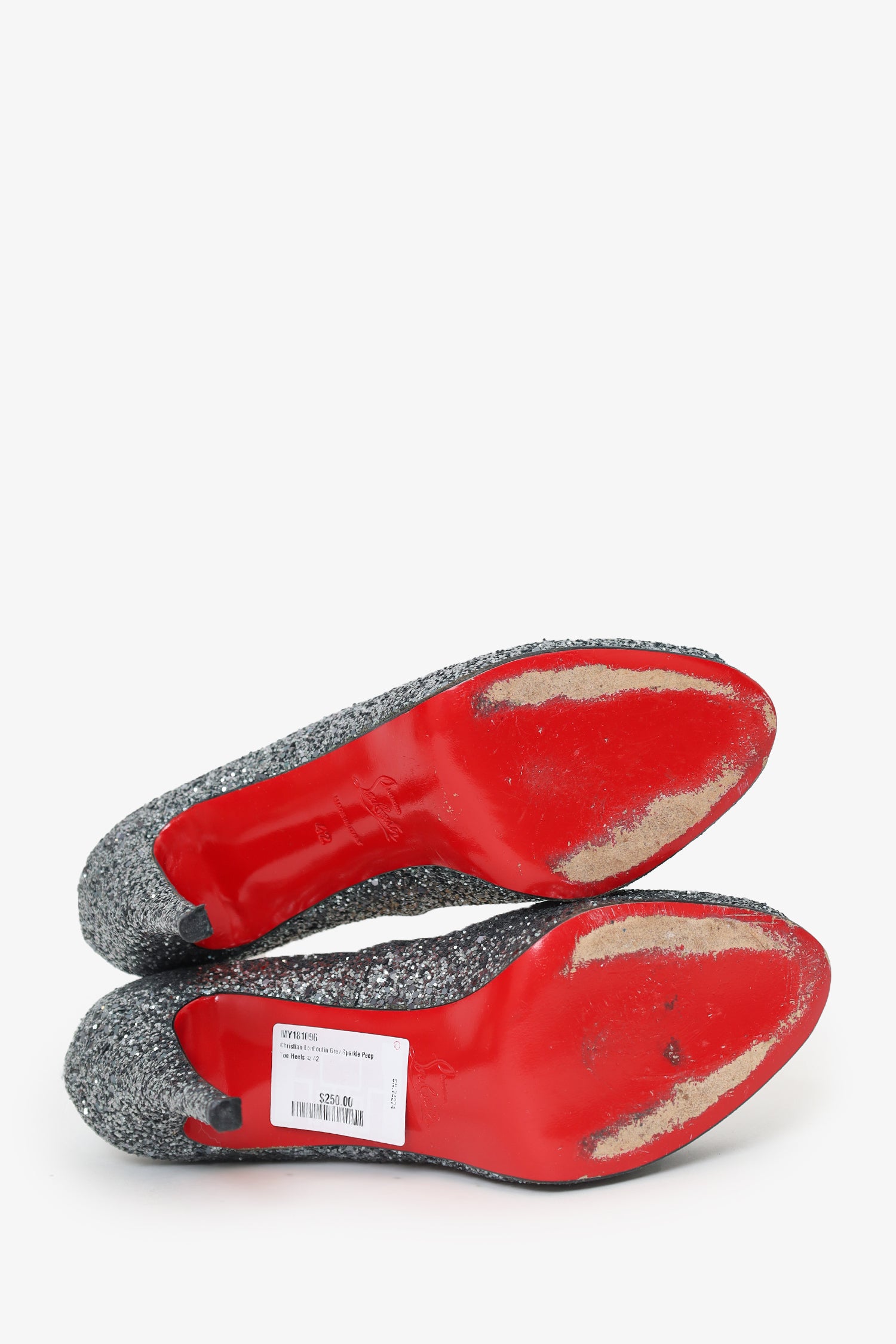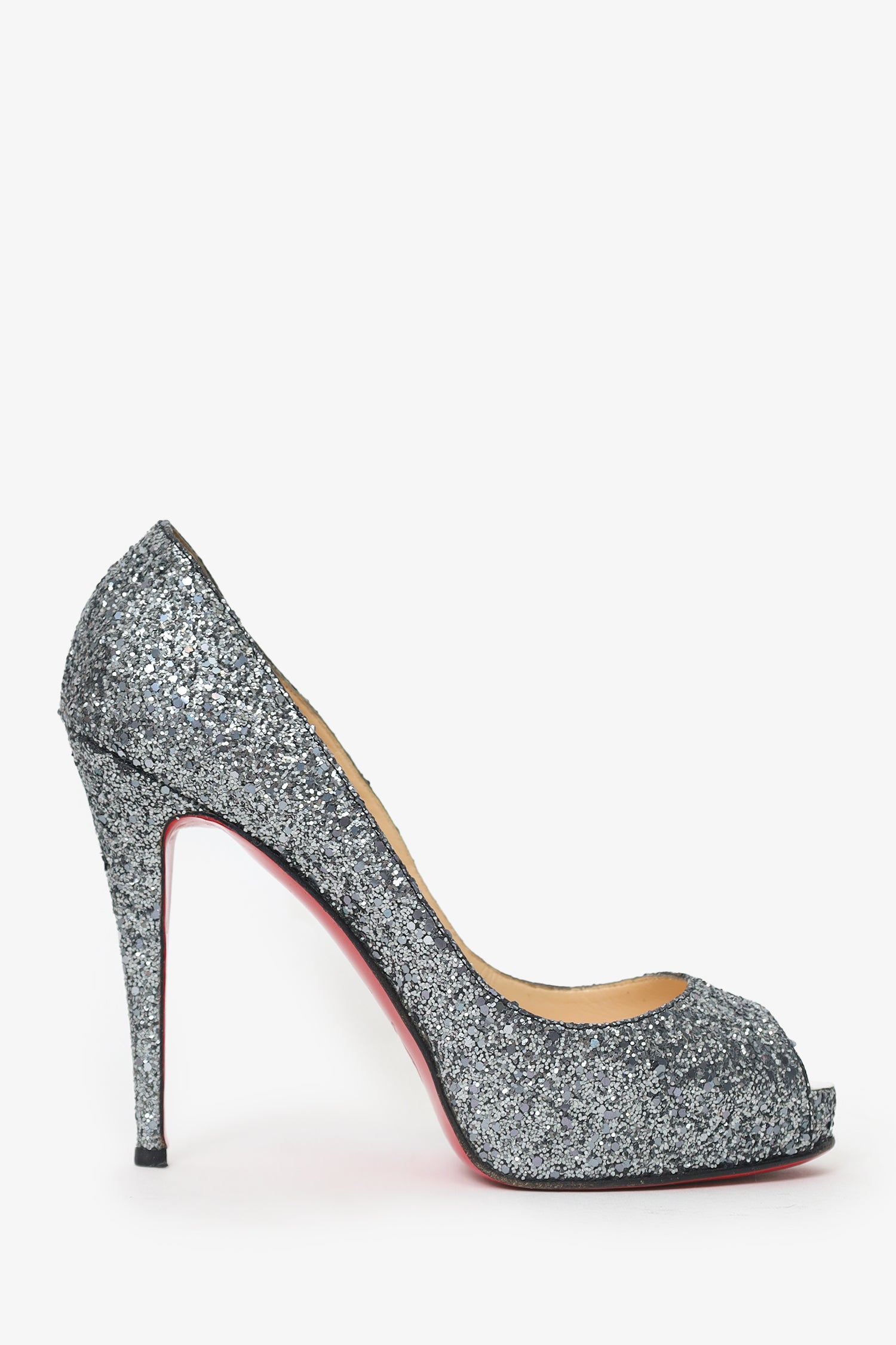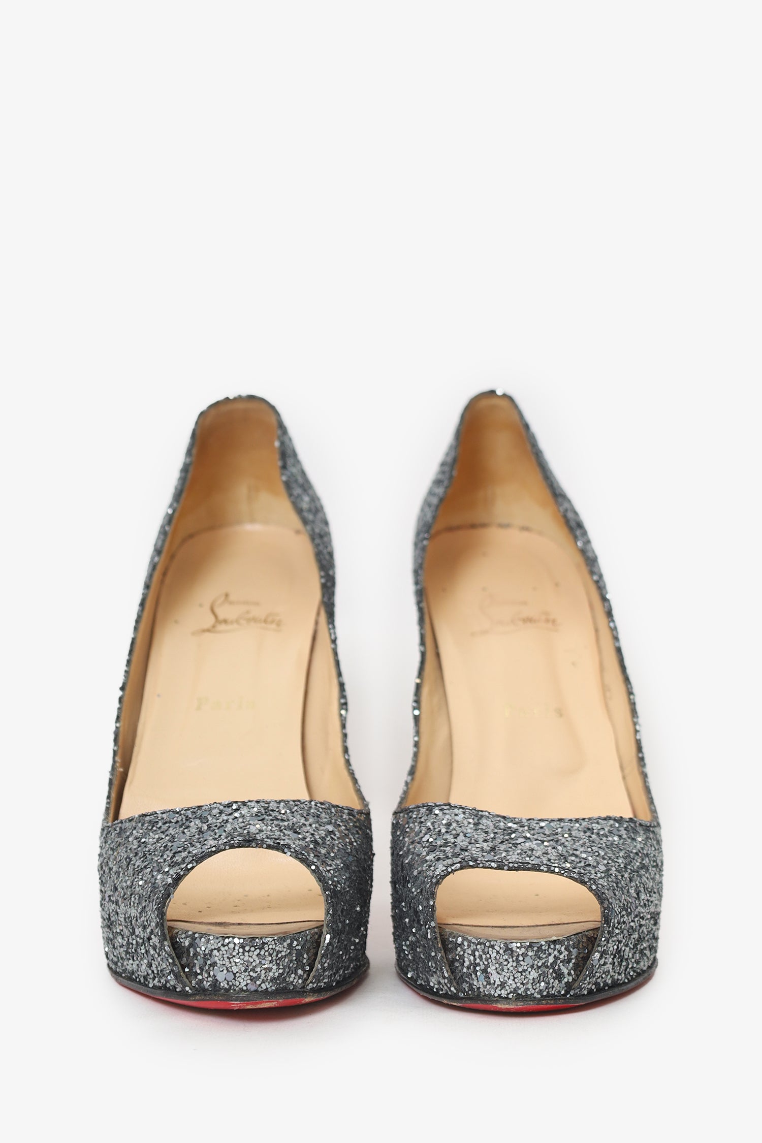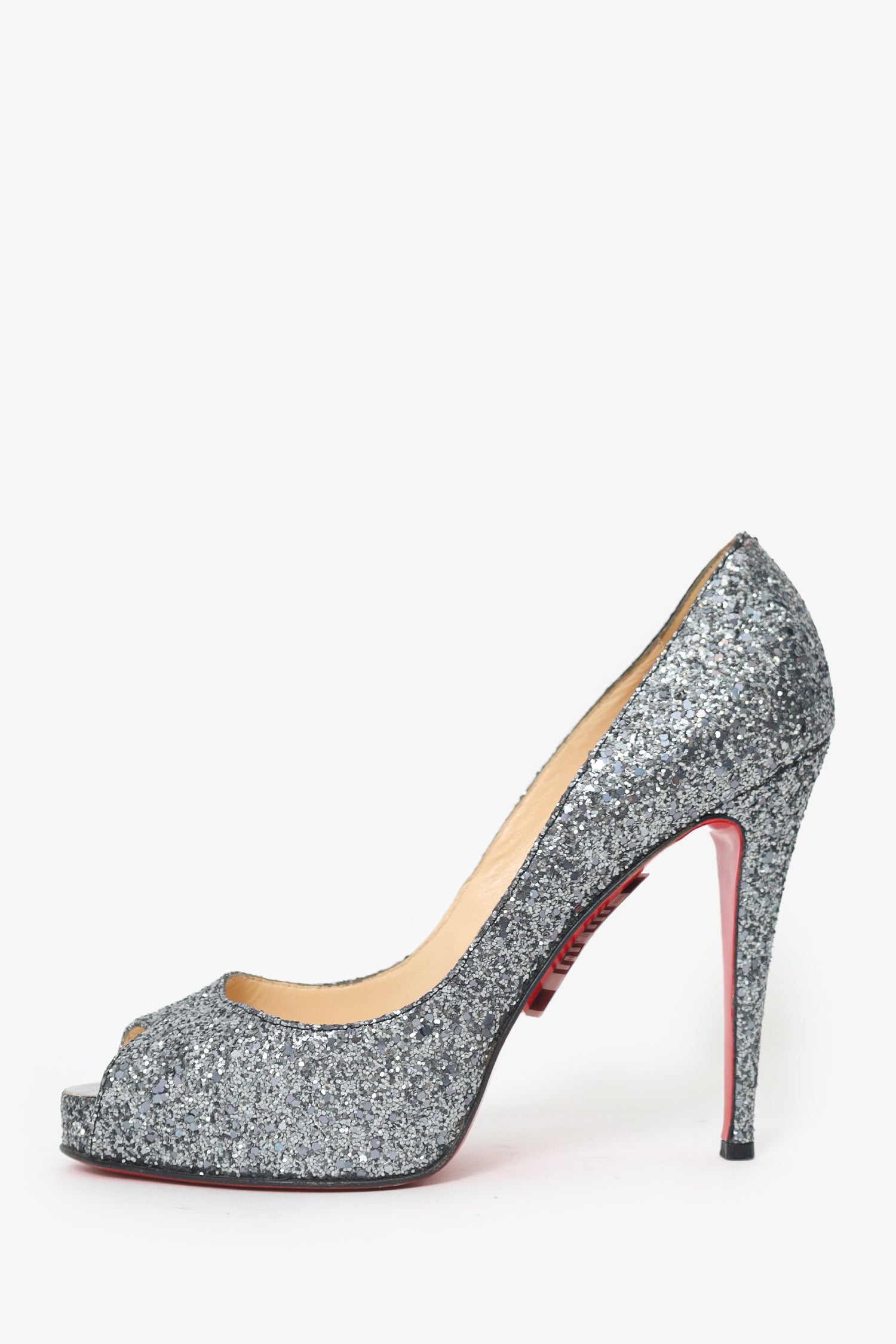 Refresh availabilityChristian Louboutin Grey Sparkle Peep Toe Heels. Slip-on. Round open-toe. Lined interior. Tonal stitching.