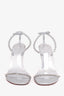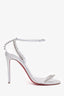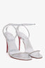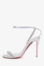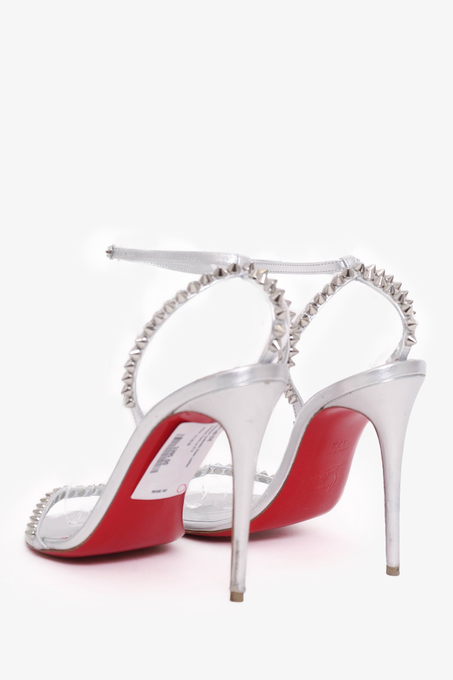 Refresh availabilityChristian Louboutin Silver Leather Studded Heels. Single ankle pull-through buckle strap closure. Open round toe. Silver-tone hardware. Tonal stitching.