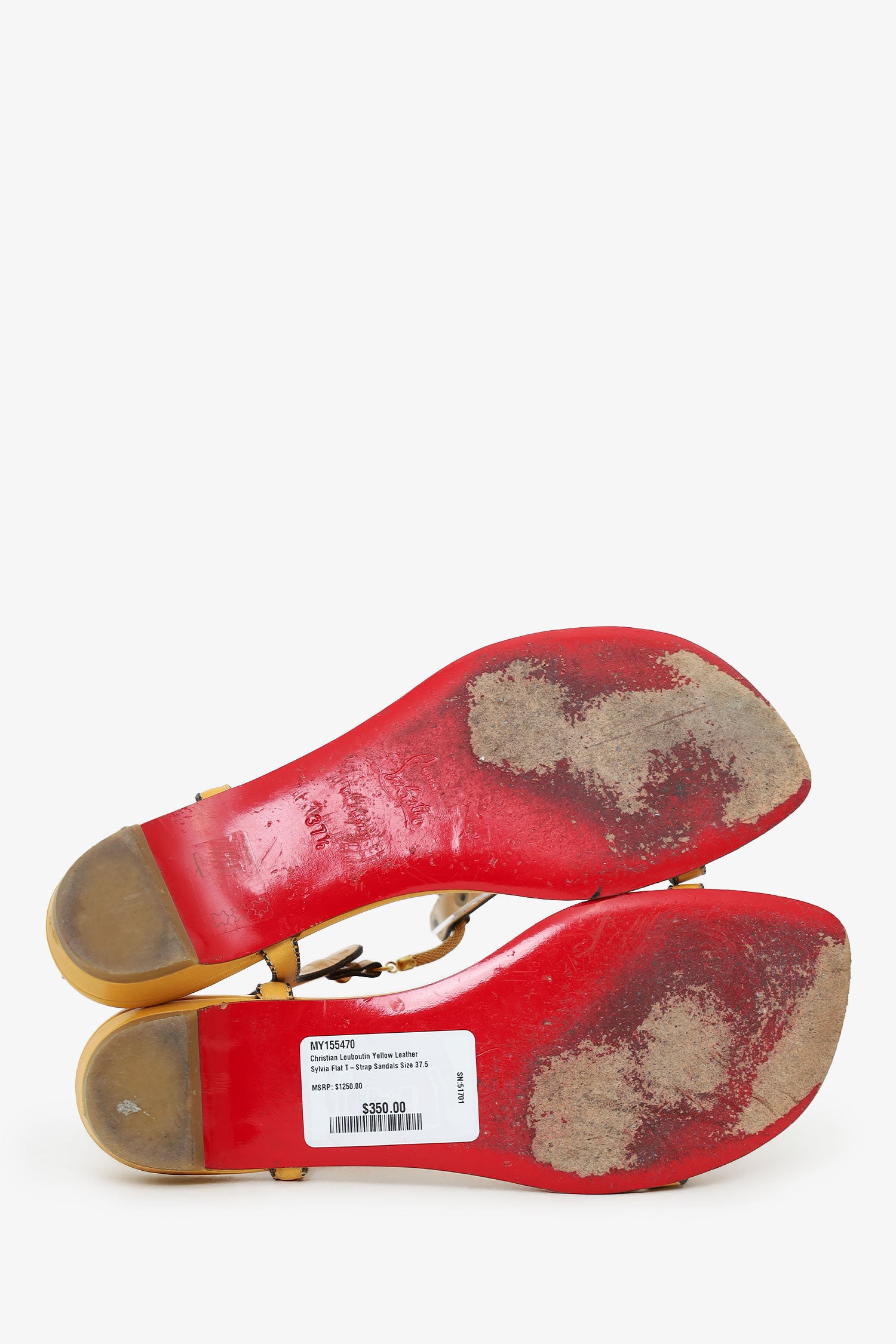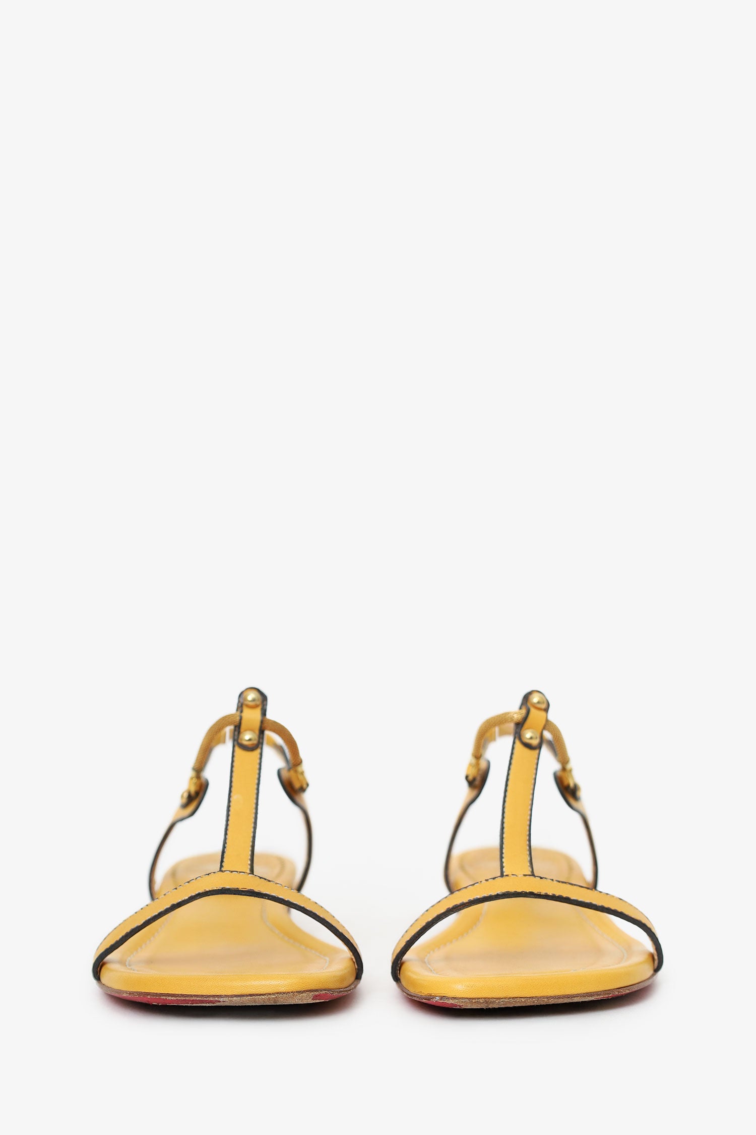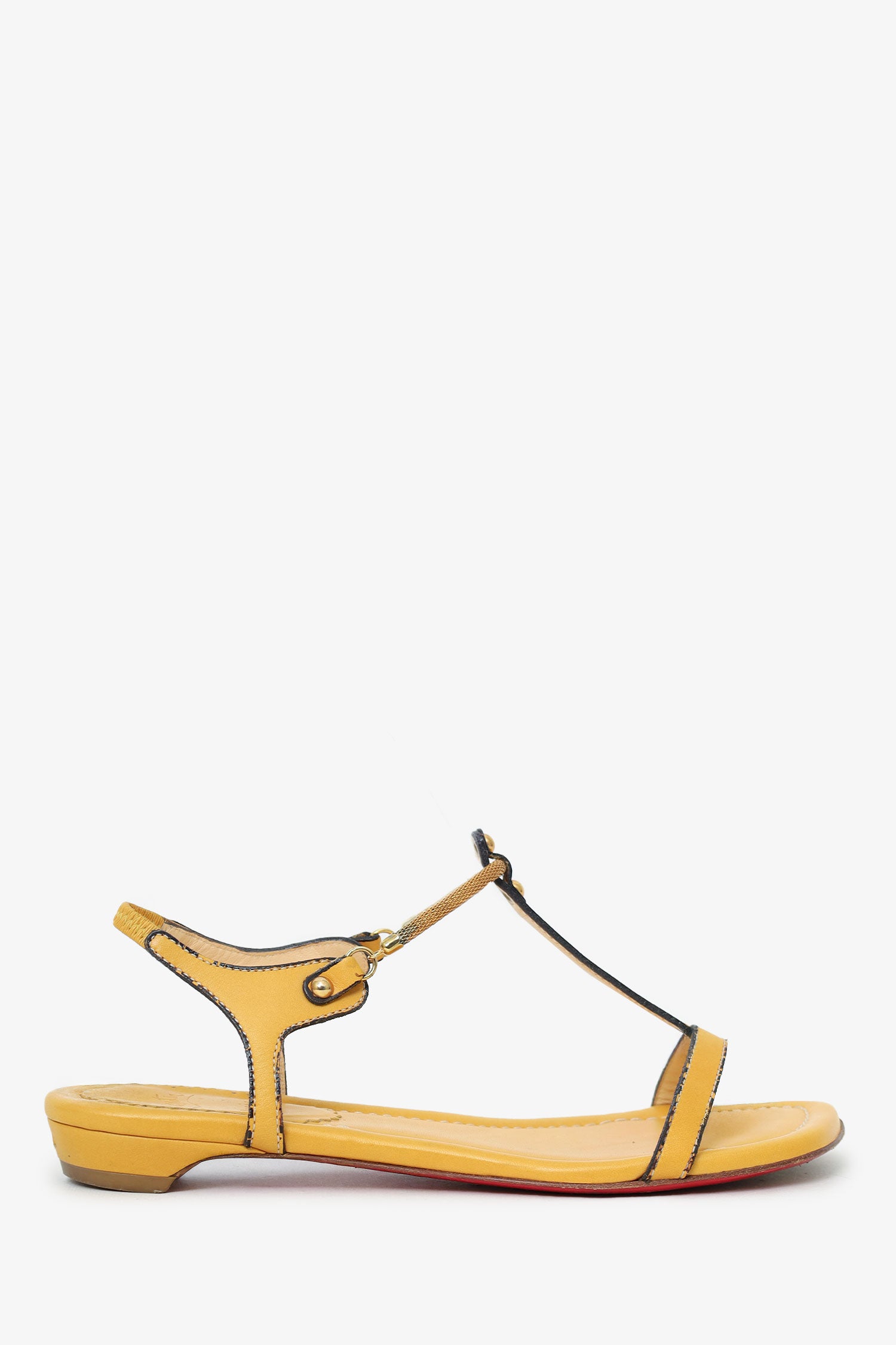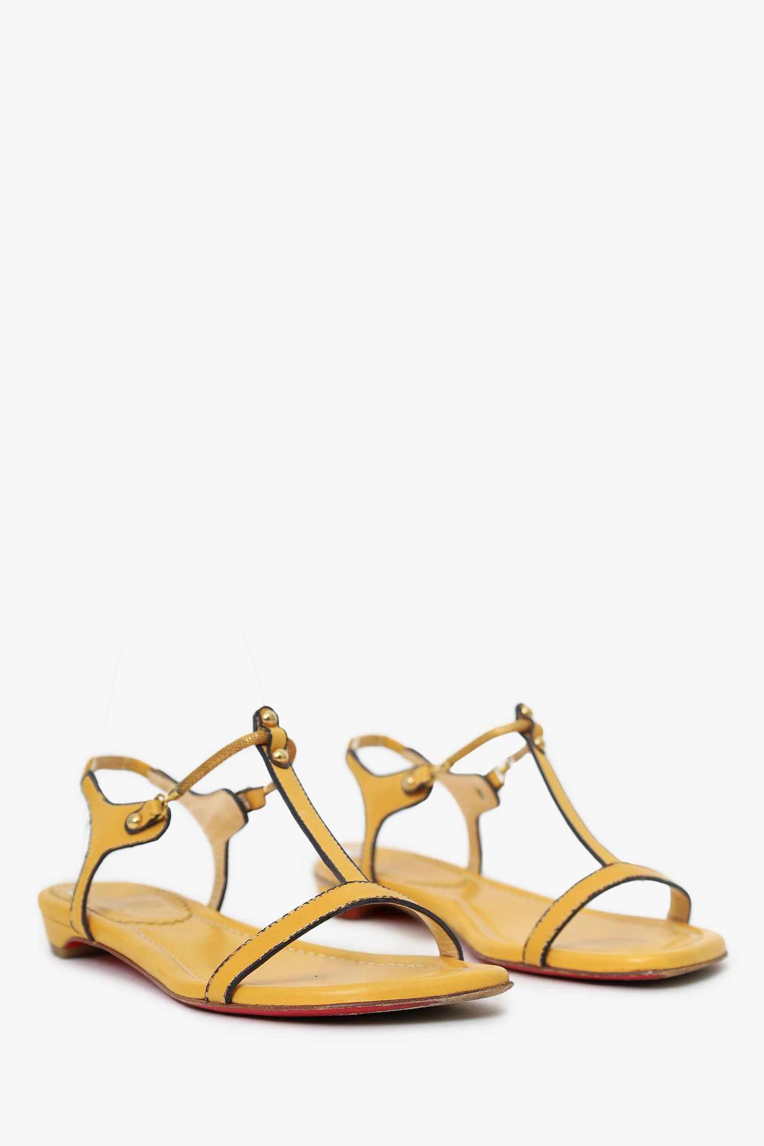 Refresh availabilityChristian Louboutin Yellow Leather Sylvia Flat T-Strap Sandals. Slip-on. Elasticated rear strap. Open square toe. Gold-tone hardware. Tonal stitching.