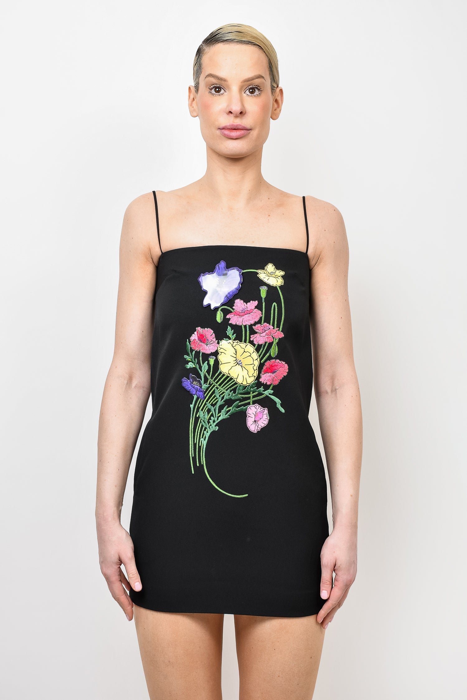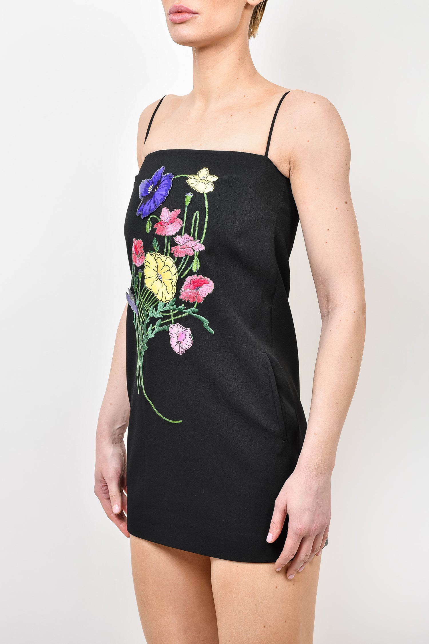 Refresh availabilityChristopher Kane Black Floral Embroidered Mini Dress. Adjustable spaghetti straps. Hidden zip closure at rear. Plastic flower embellishments. Tonal stitching.