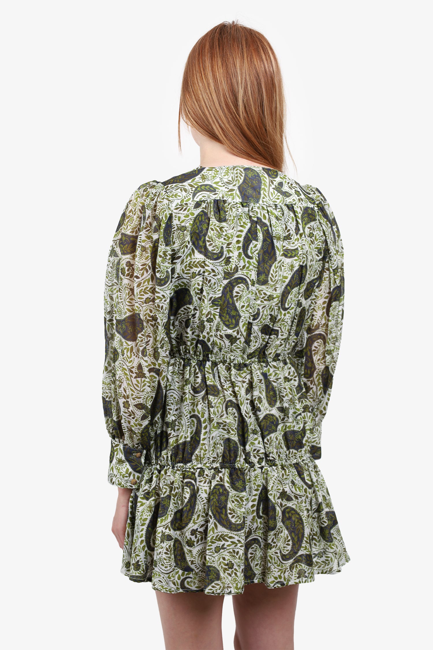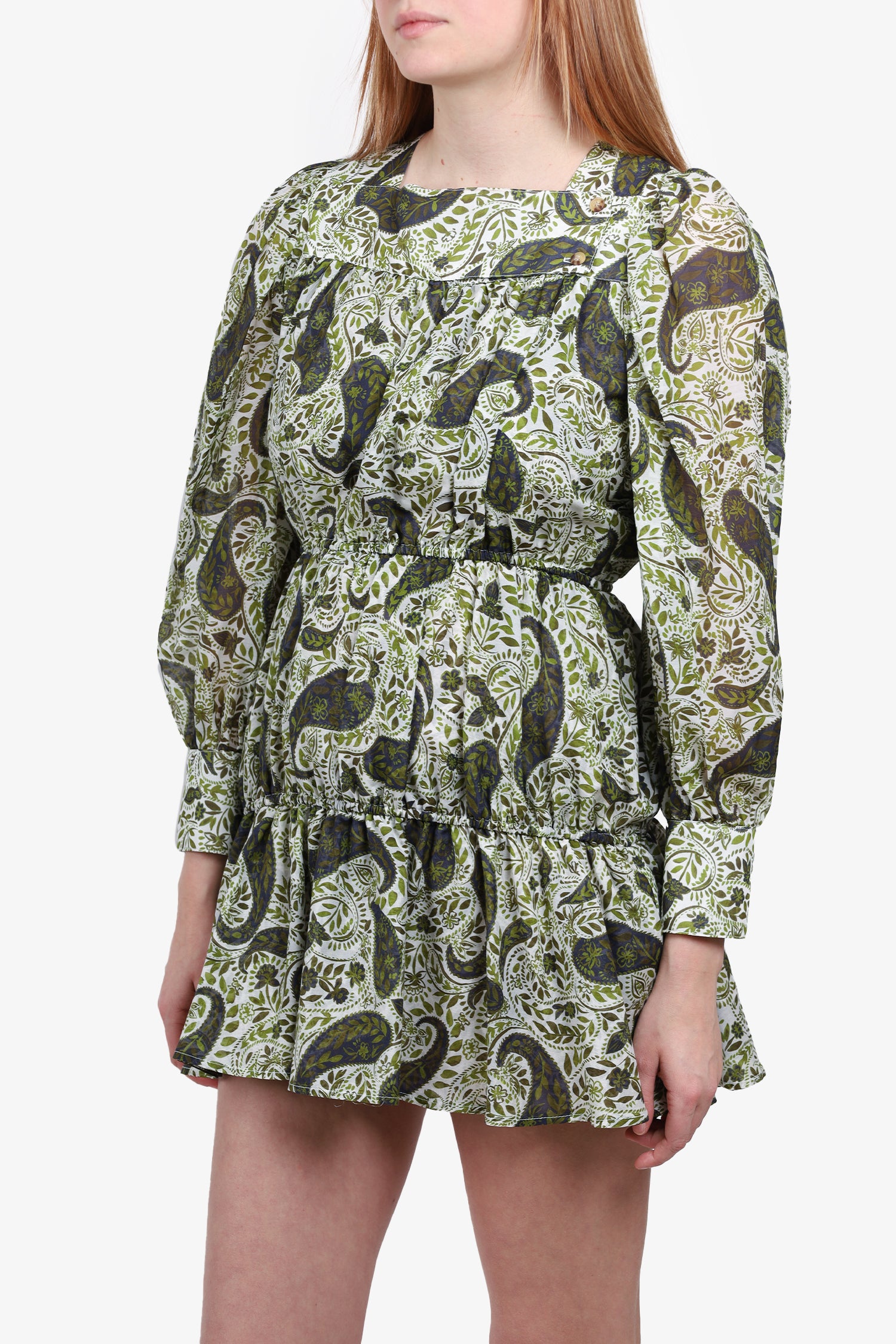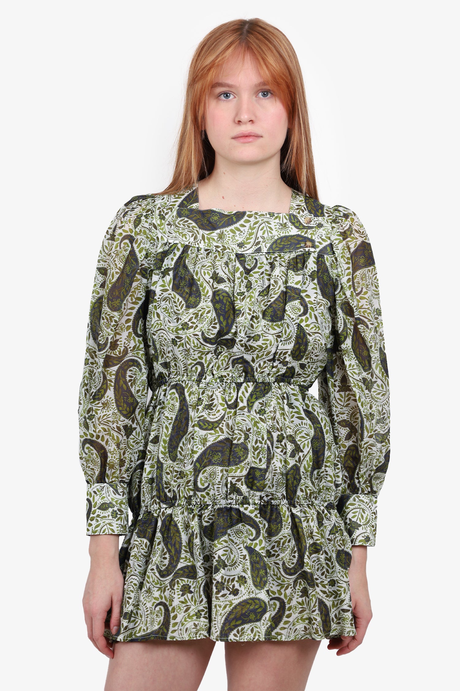 Refresh availabilityCiao Lucia White/Green Floral Long-Sleeve Mini Dress. Front button closure. Unlined. Tonal stitching.