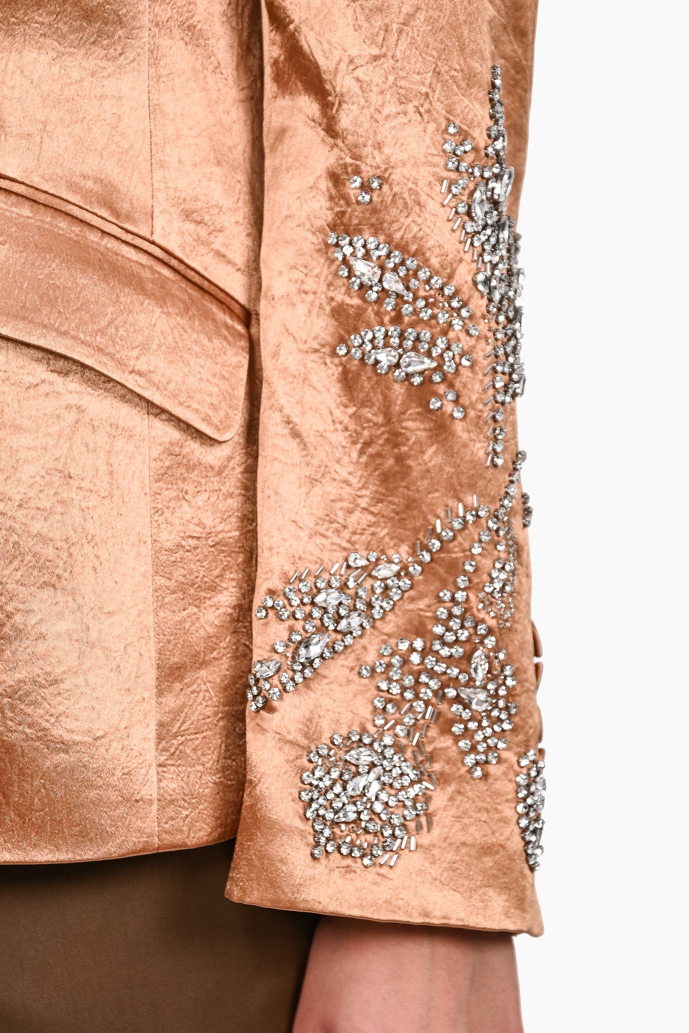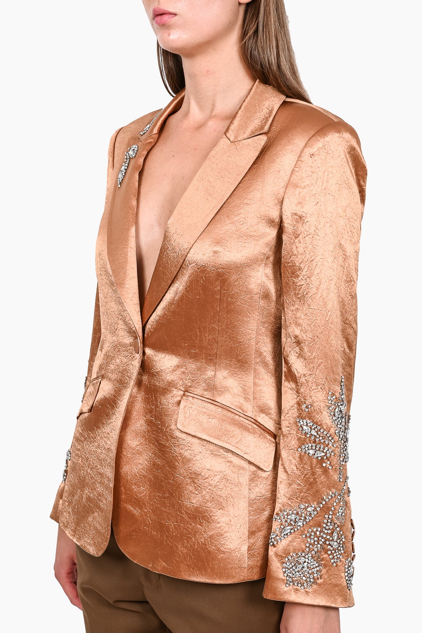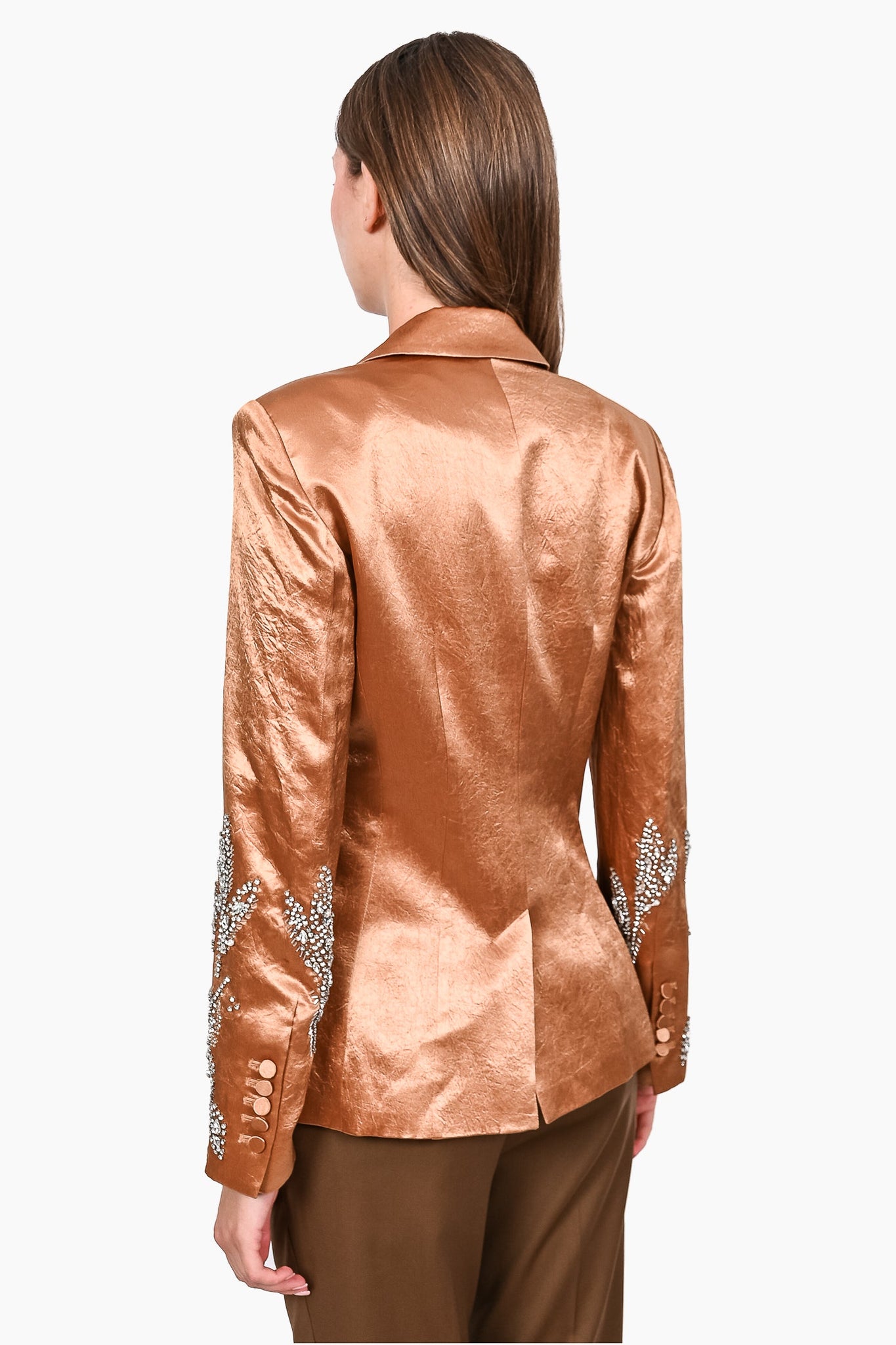 Refresh availabilityCinq A Sept Brown Satin Blazer with Crystal Detail On Sleeves. Single front button closure. Front pockets. Lined. Padded shoulders. Tonal stitching.