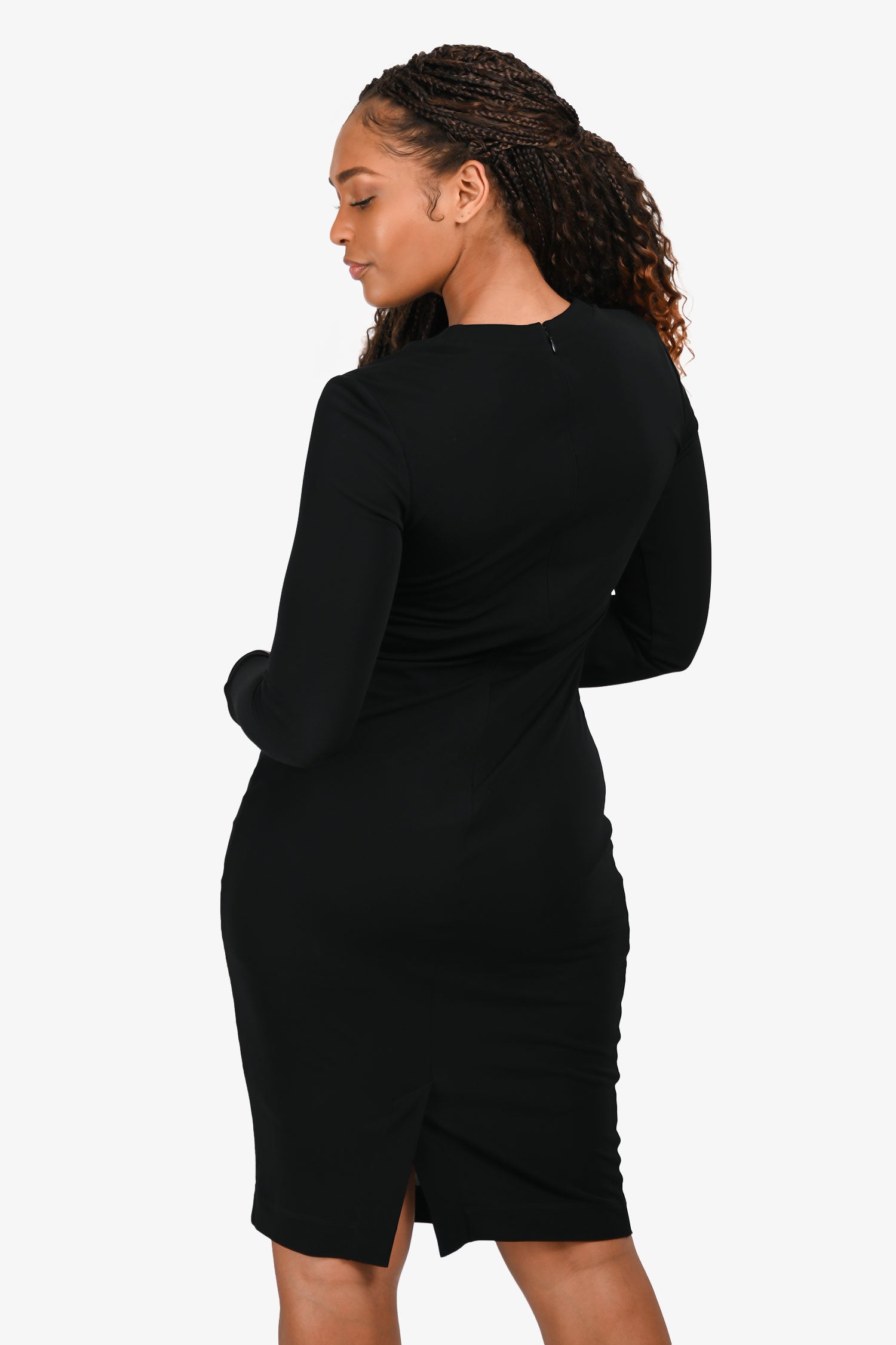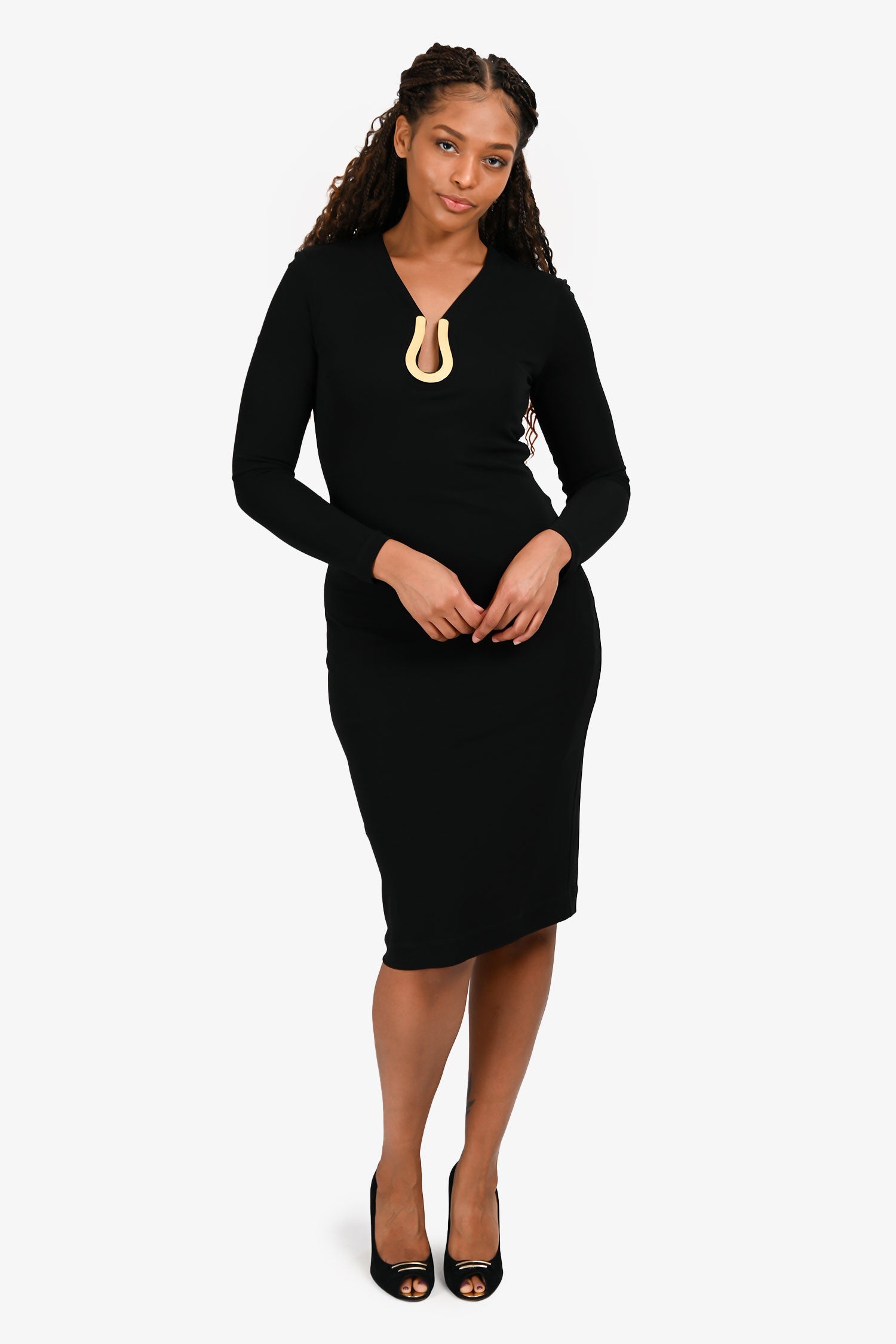 Refresh availabilityClass Roberto Cavalli Black Gold Tone Hardware Long Sleeve Midi Dress. Slip-on. Round neckline with cutout detail. Rear zip and hook clasp closure. Fully lined. Gold-tone hardware. Tonal stitching.