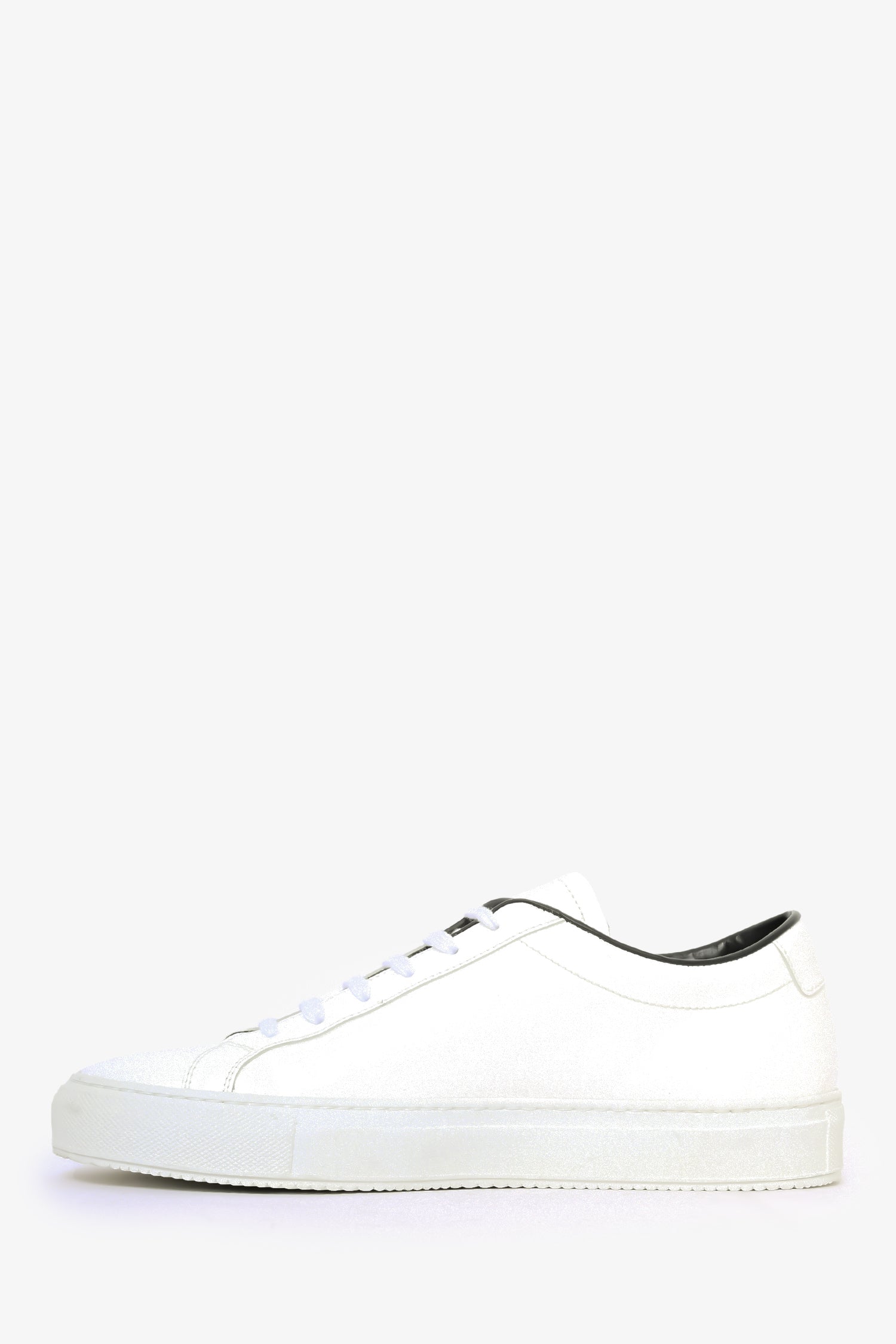 Refresh availabilityCommon Projects White Patent Leather Low Top Sneakers with Black Trim. Round toe. Lace-up closure. Glossy finish.