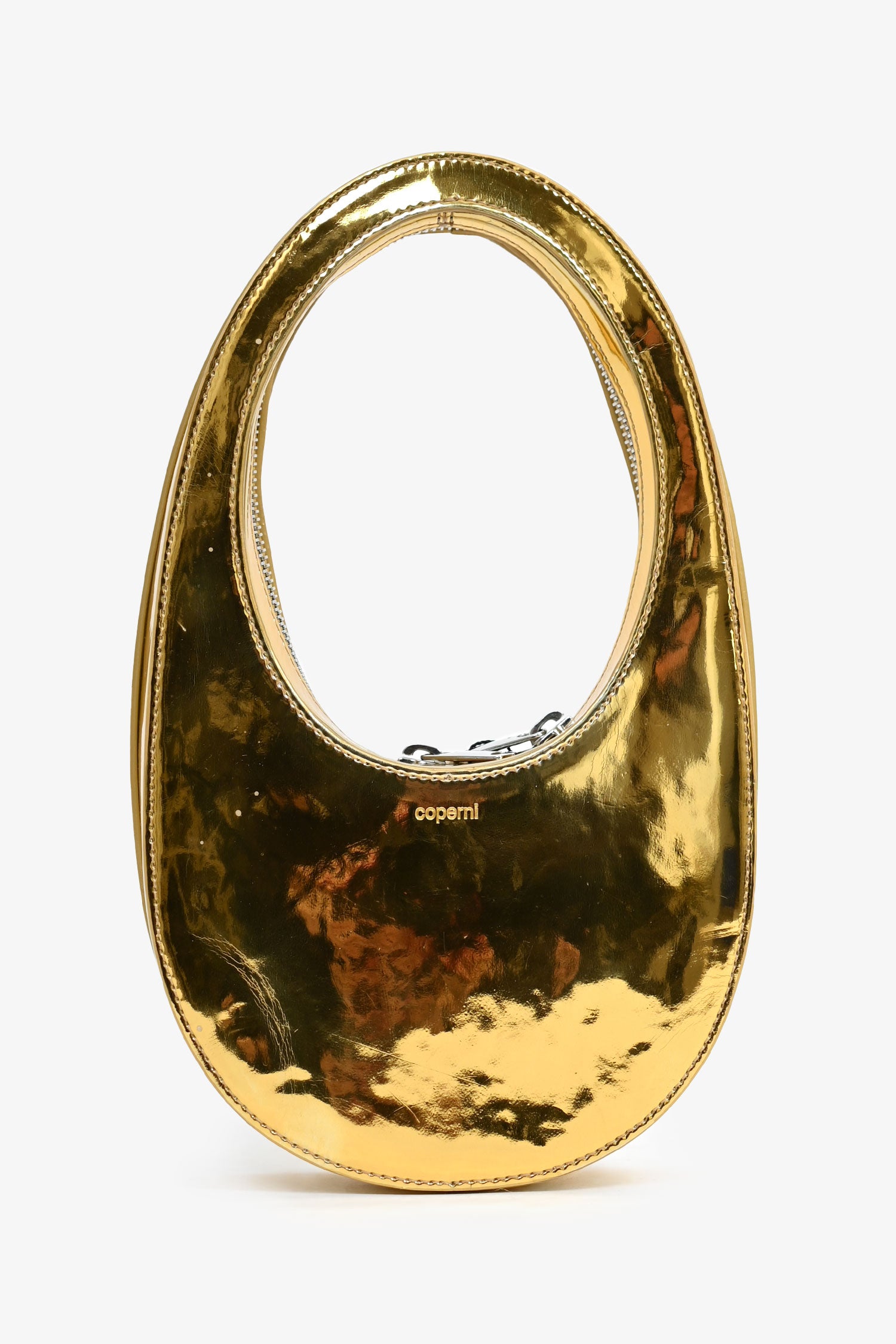 Refresh availabilityCoperni Metallic Gold Faux Patent Leather Mini 'Swipe' Top Handle Bag. Top double-zipper closure. Silver-toned hardware. Tonal stitching.