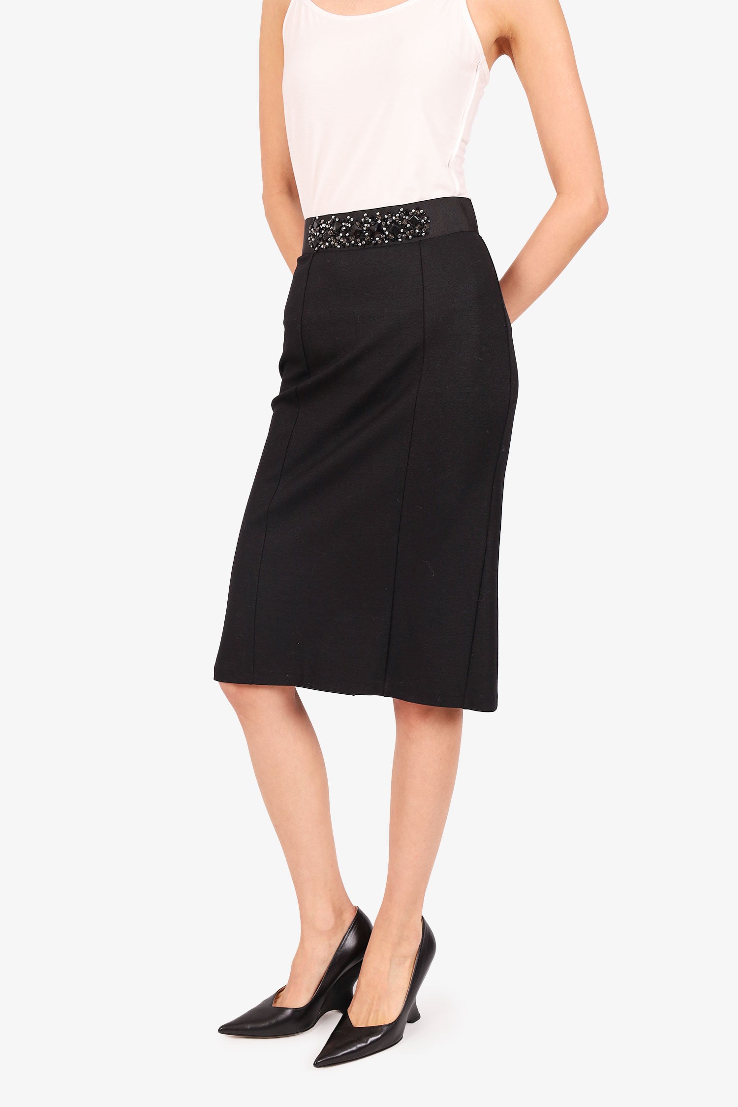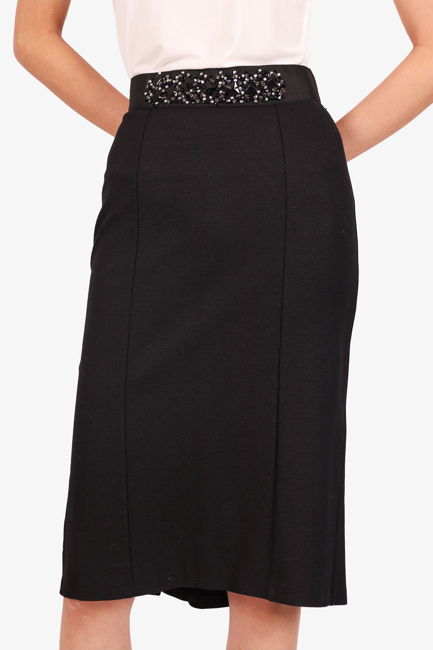 Refresh availabilityD&G Dolce & Gabbana Black Crystal Embellished Midi Skirt. Elasticated waist. Rear zip closure. Silver-tone hardware. Unlined. Tonal stitching.