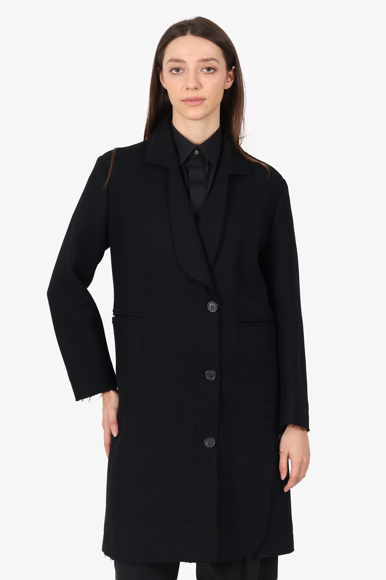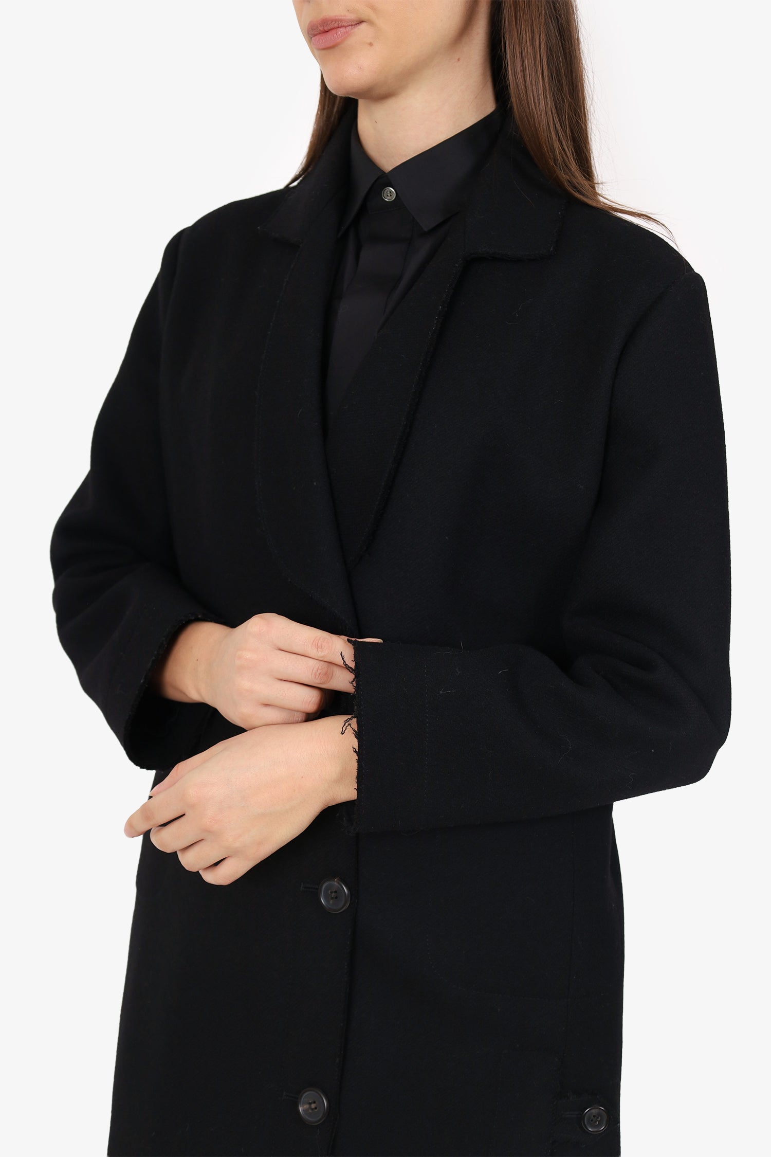 Refresh availabilityDerek Lam Black Wool/Cashmere Double Breasted Frayed Edge Coat. Pull-on. Collared neckline. Front button-up closure. 2 exterior front slip pocket. Lined interior. Tonal stitching.