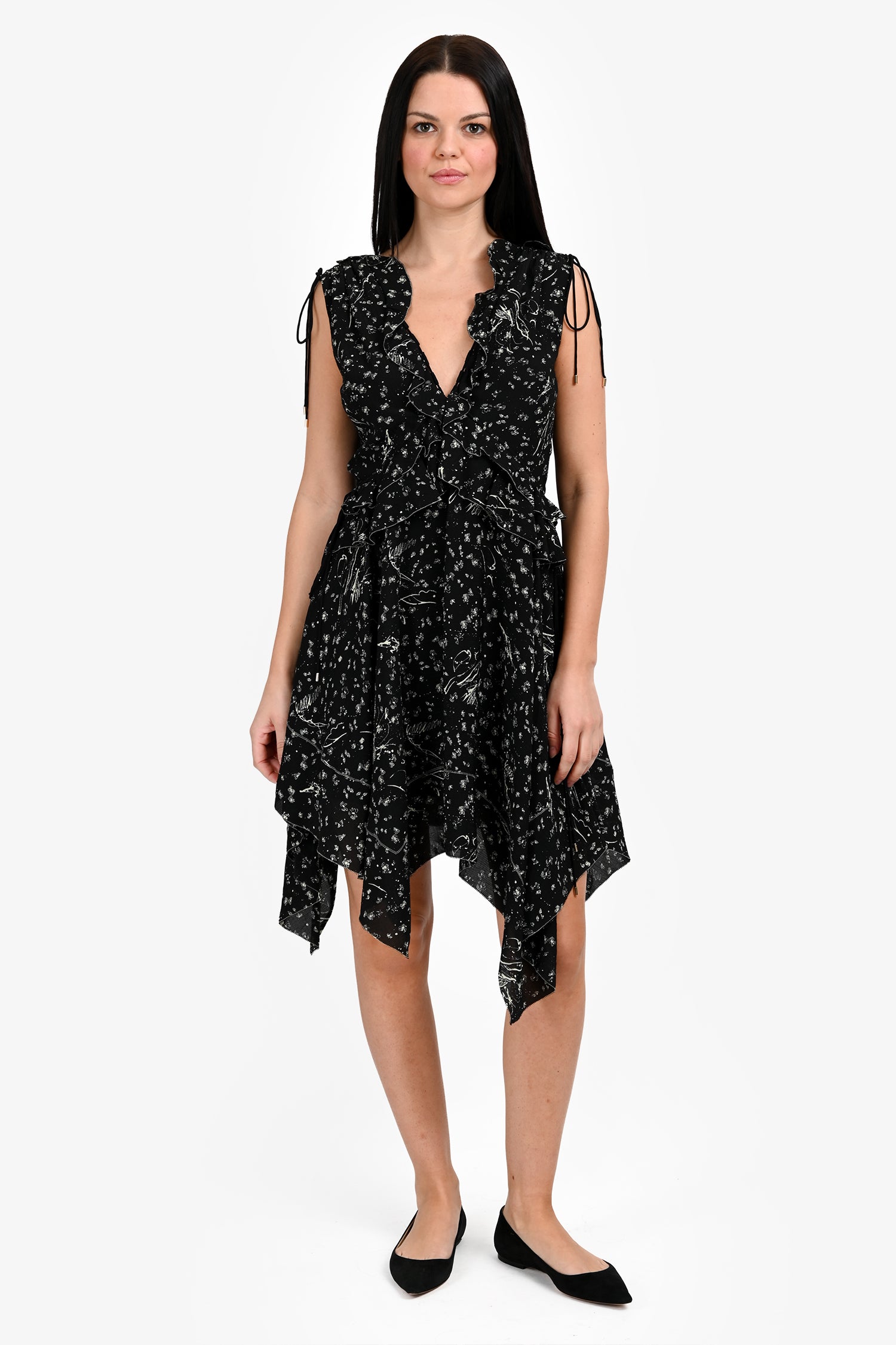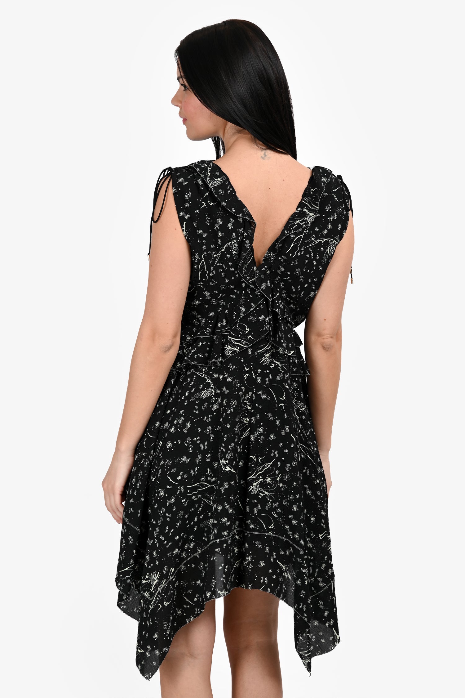 Refresh availabilityDerek Lam 10 Crosby Black and Mint Floral V-Neck Dress. V-neckline. Rear zip and hook clasp closure. Adjustable tie detail at the shoulders and the side seams. Fully lined interior. Gold-tone hardware. Tonal stitching.