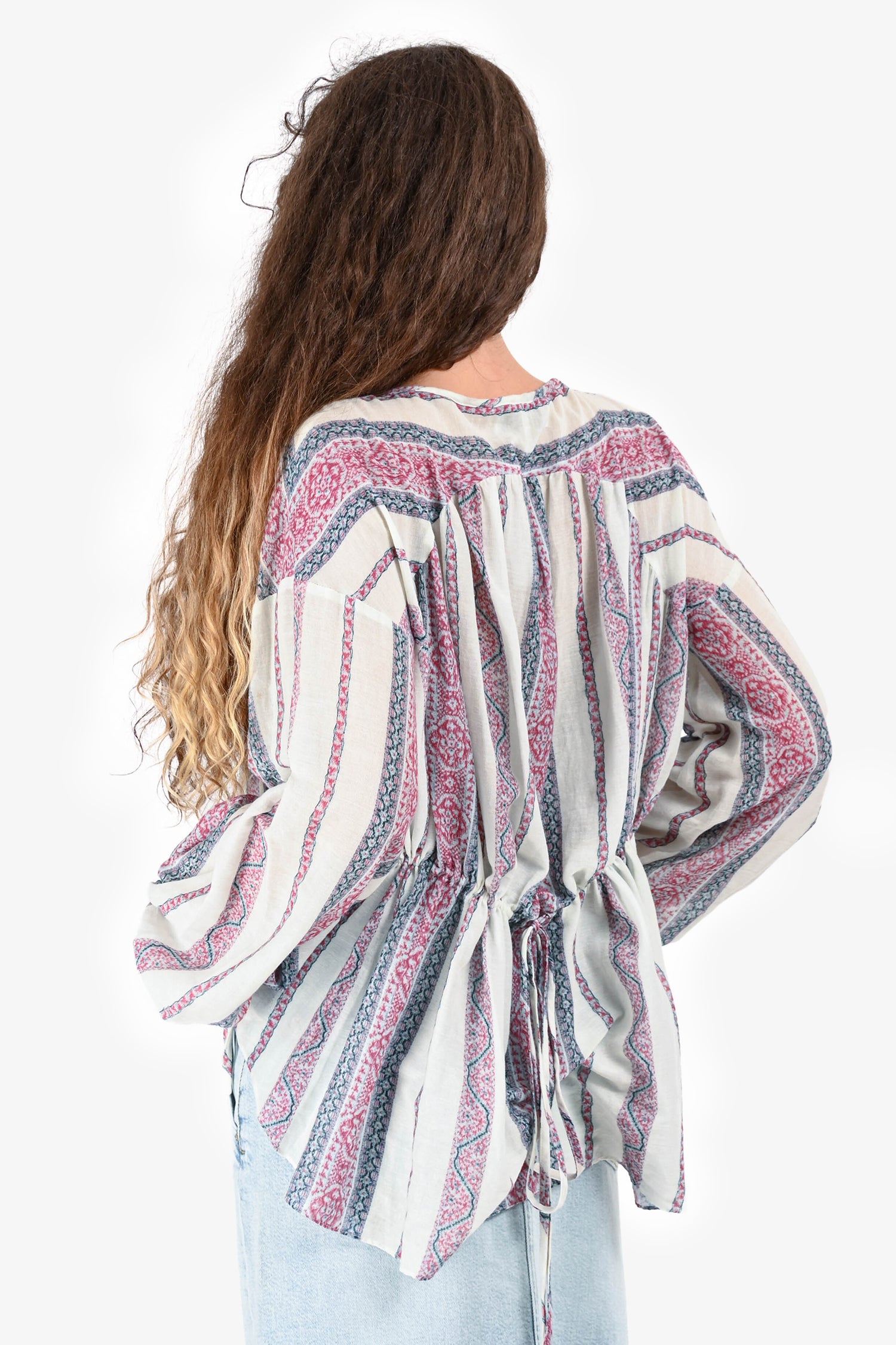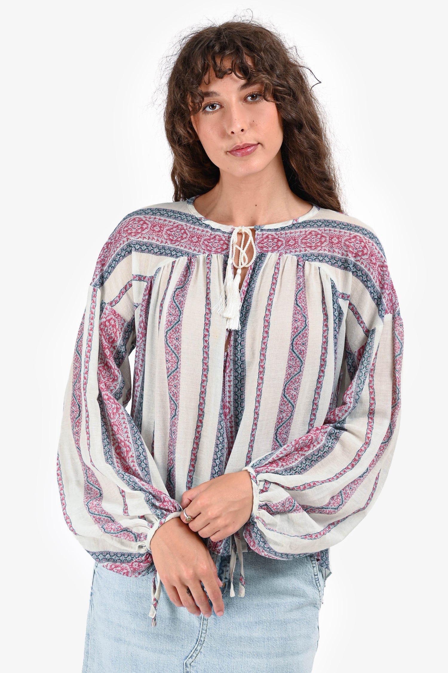 Refresh availabilityDerek Lam Crosby Blue/Pink Striped V Neck Tassel Blouse. V-neckline with tassel tie detail. Long sleeves with tie detail. Cinched back waist with adjustable drawstring. Tonal stitching.