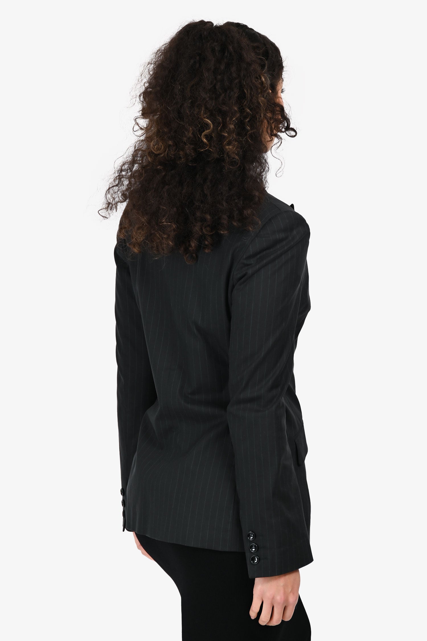 Refresh availabilityD&G Dolce & Gabbana Grey/Blue Pinstriped Blazer. Slip-on. Front button-up closure. Notched lapel neckline. Padded shoulders. Cuffs with button-up closures. 2 exterior flap pockets. Fully lined. Tonal stitching.