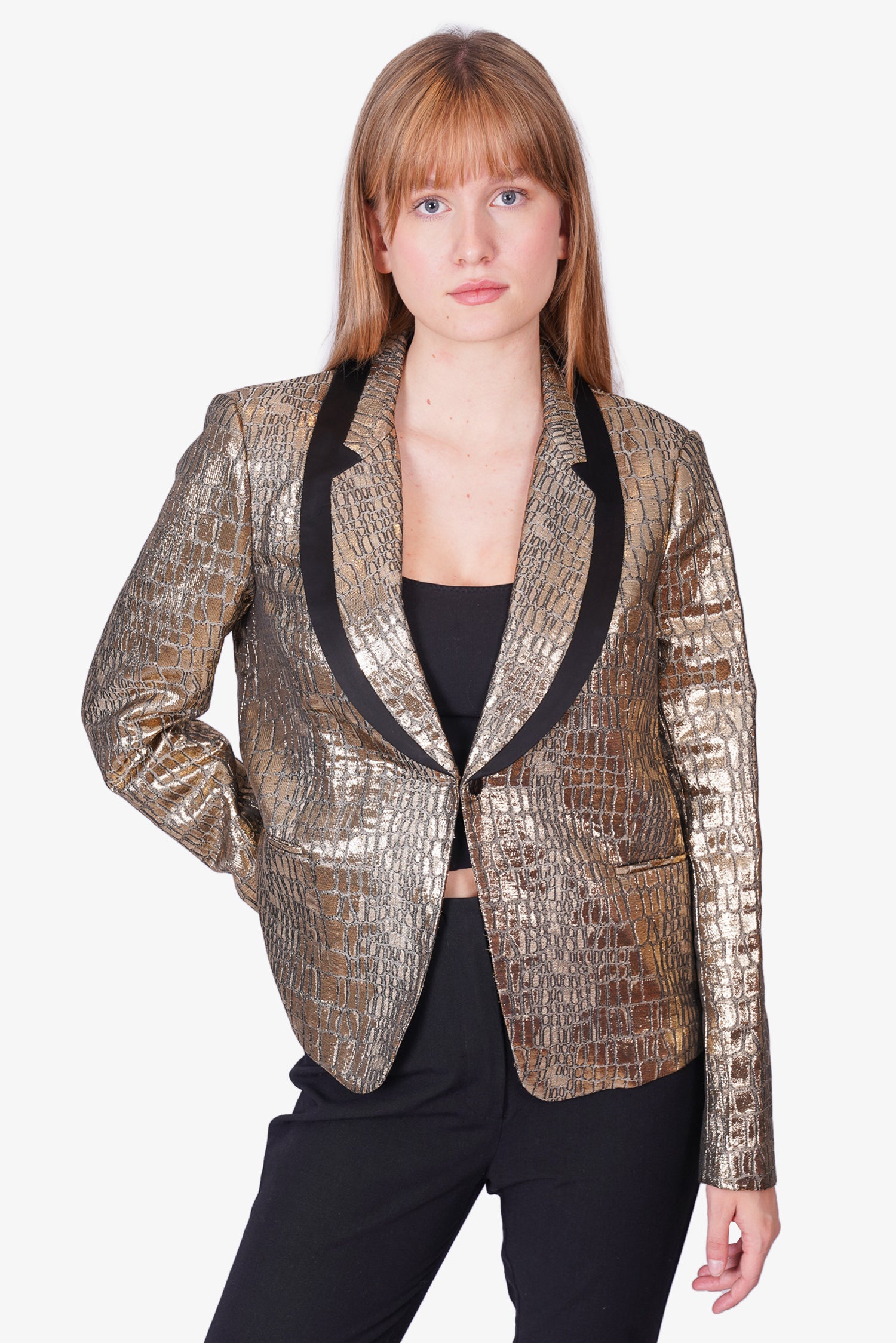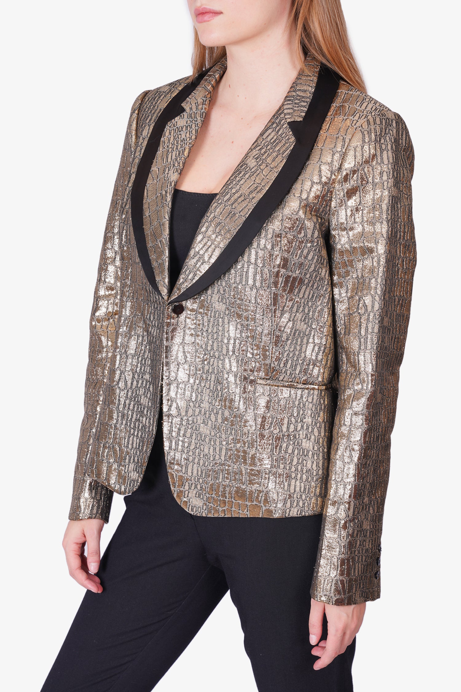Refresh availabilityDiane Von Furstenberg Gold Animal Print Tuxedo Blazer. Collared neckline. Front button up closure. Interior lining. Tonal stitching.