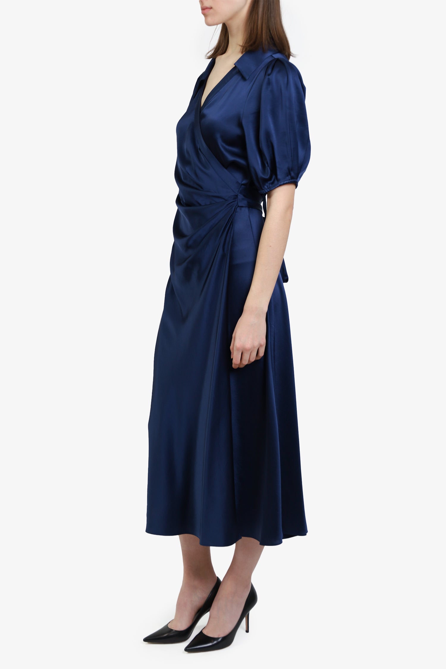 Refresh availabilityDiane von Furstenberg Navy S/S Wrap Dress. Open neckline with collared detailing. Front wrap around closure. Puffed sleeves. Tonal stitching.