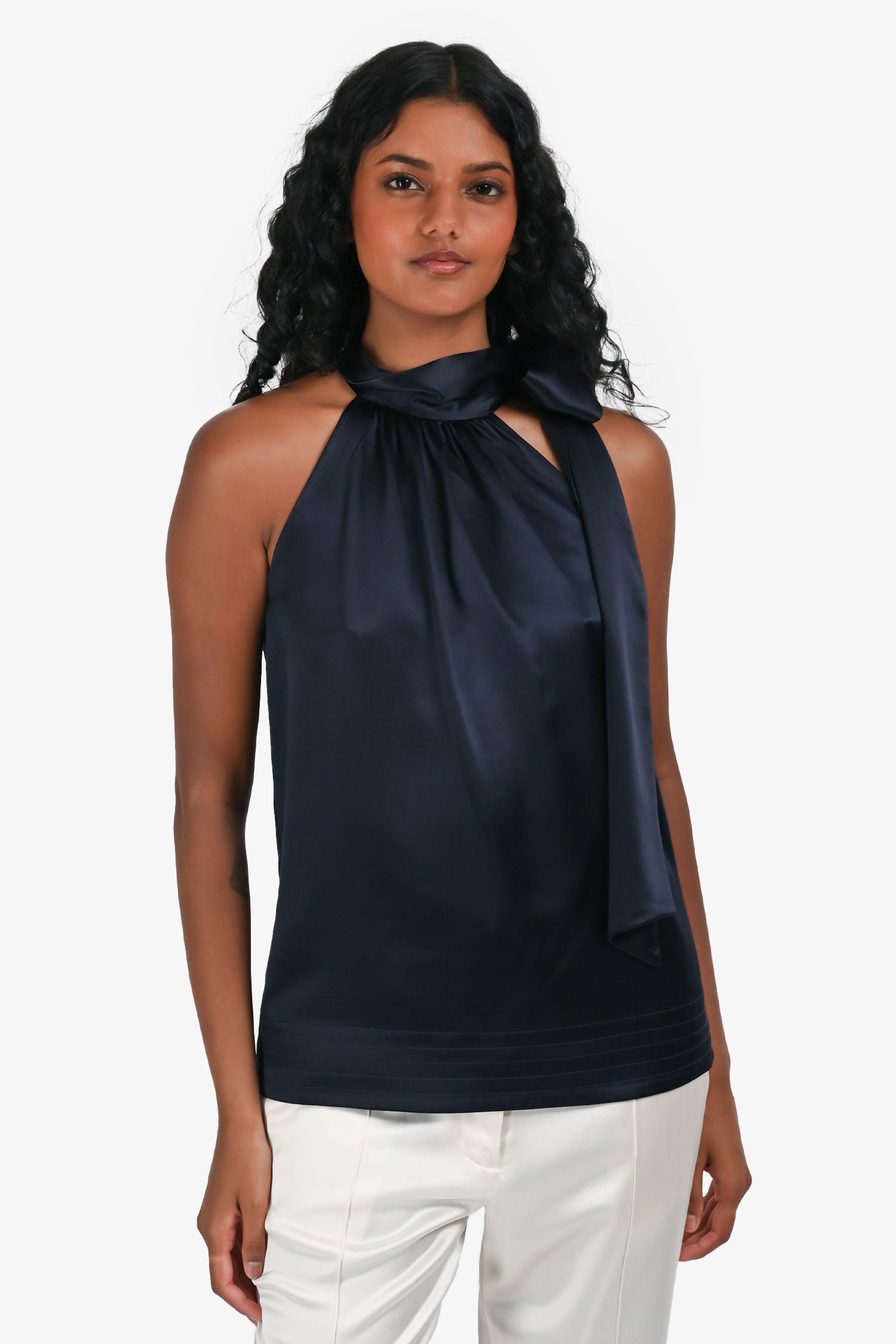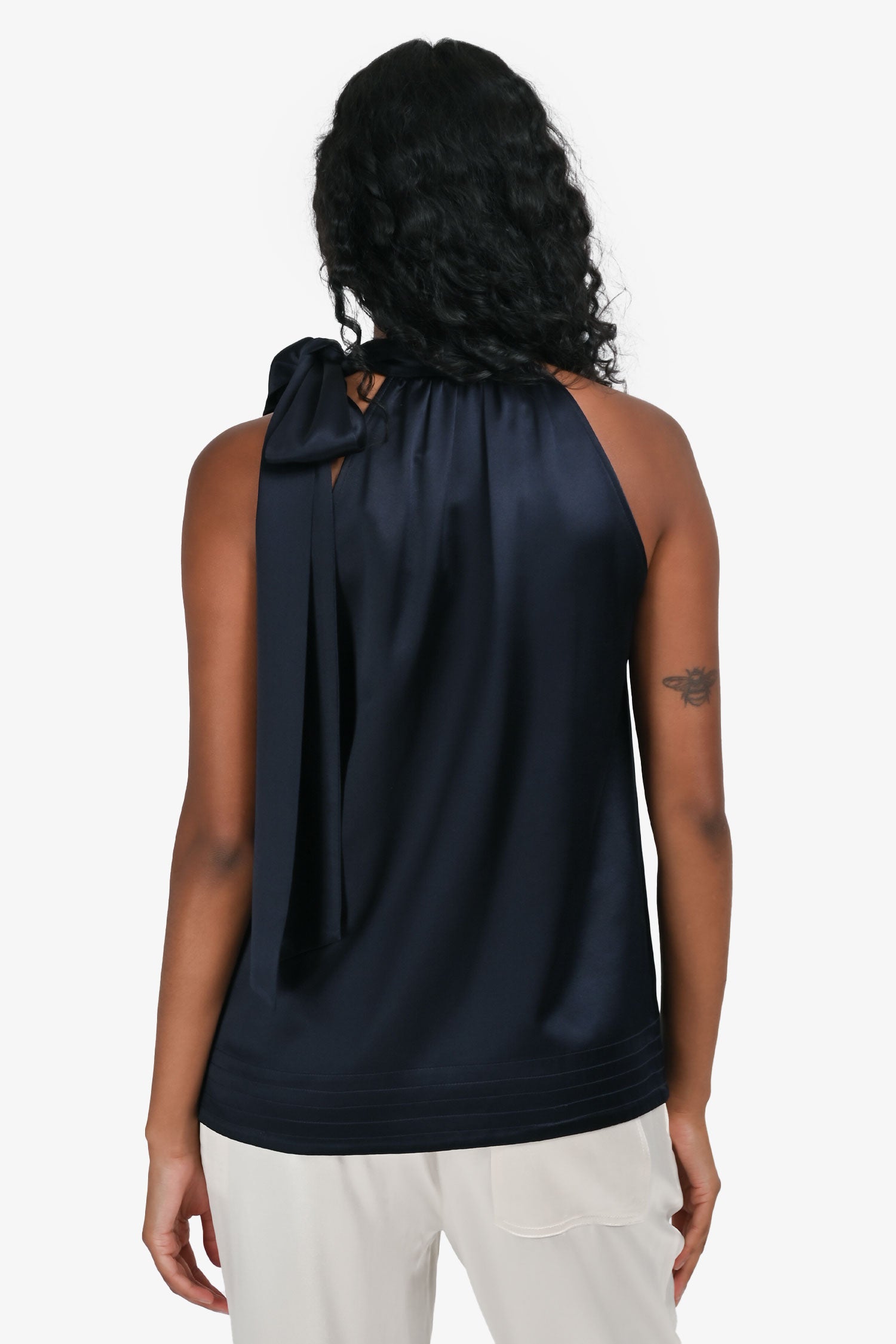 Refresh availabilityDiane von Furstenberg Navy Silk Bow Detailed Sleeveless Top. Crew neckline with straps to tie bow. Sleeveless design. Lightweight silk fabric. Tonal stitching.