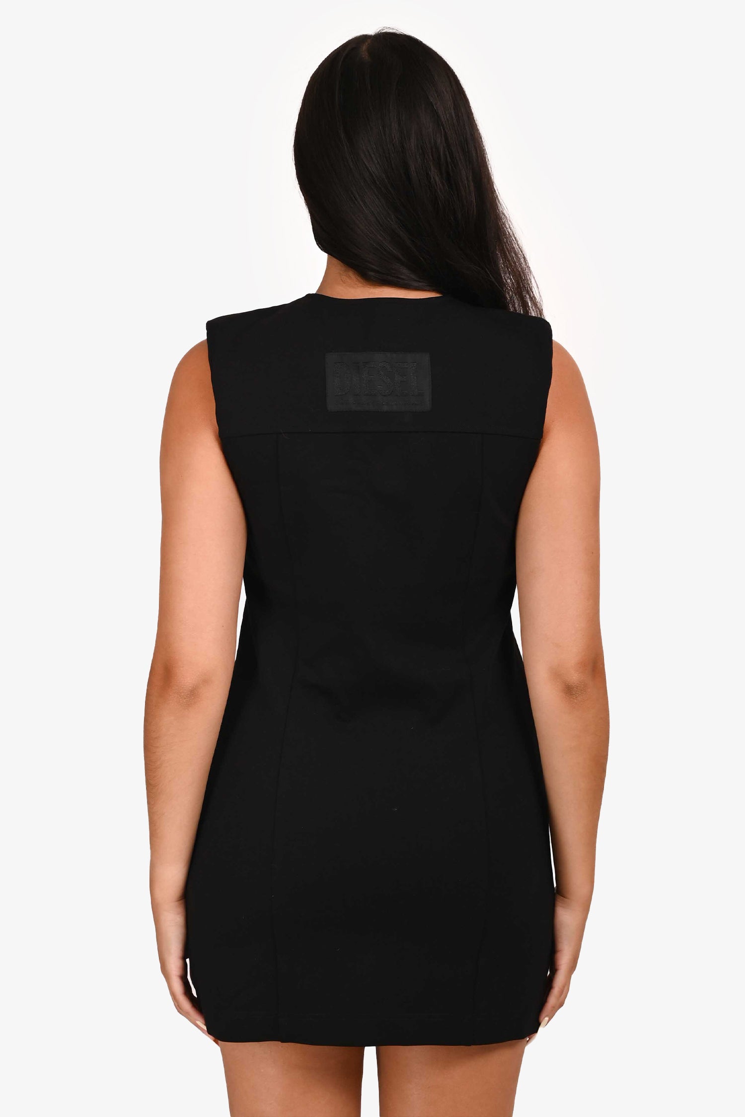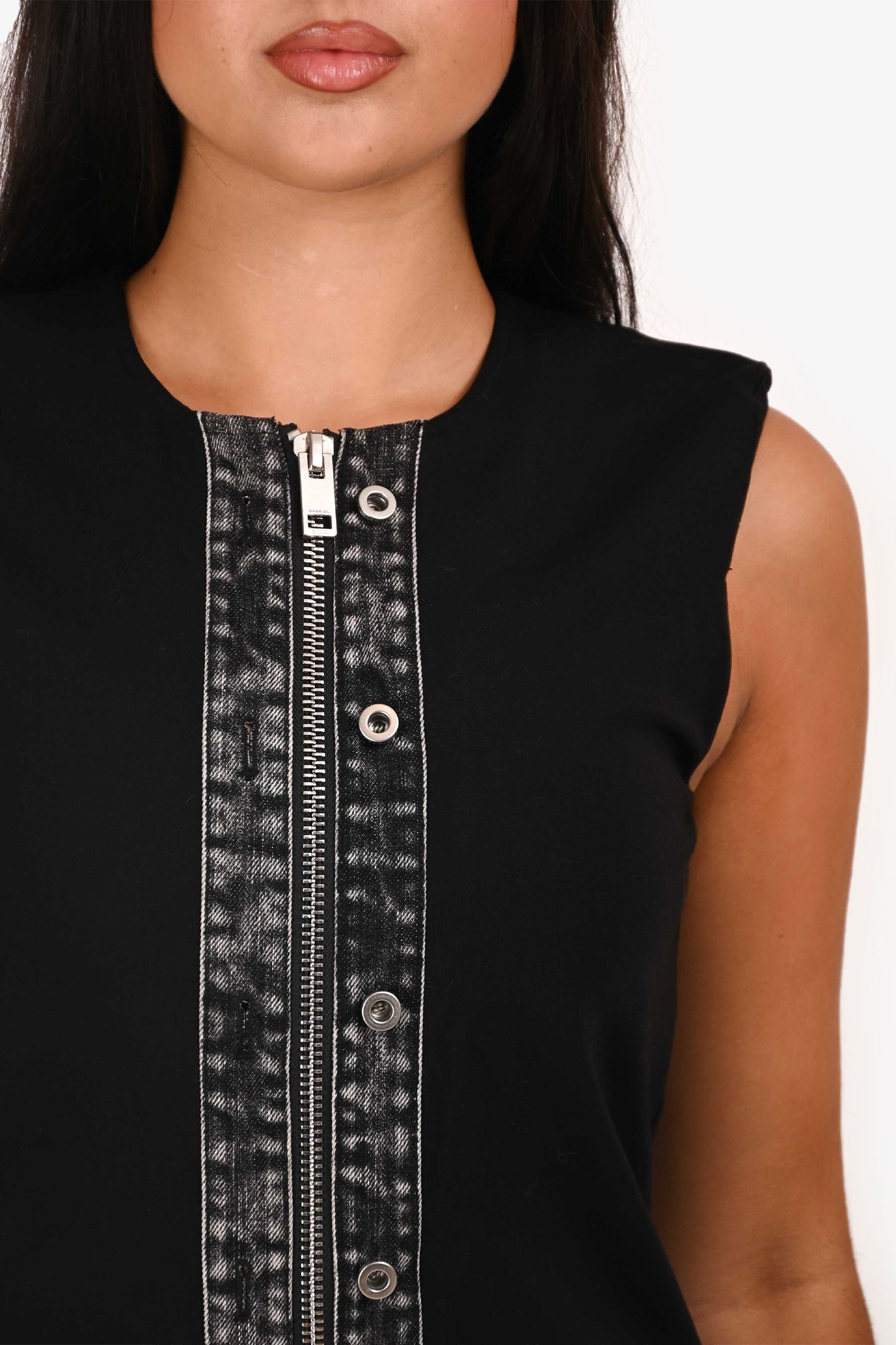 Refresh availabilityDiesel Black Knit/Denim Sleeveless Zip Up Dress. Front two-way zipper closure with denim placket. Front button detail. Two contrast denim pockets with a zipper closure. Patch logo detailing on the back. Silver-tone hardware. Tonal stitching.