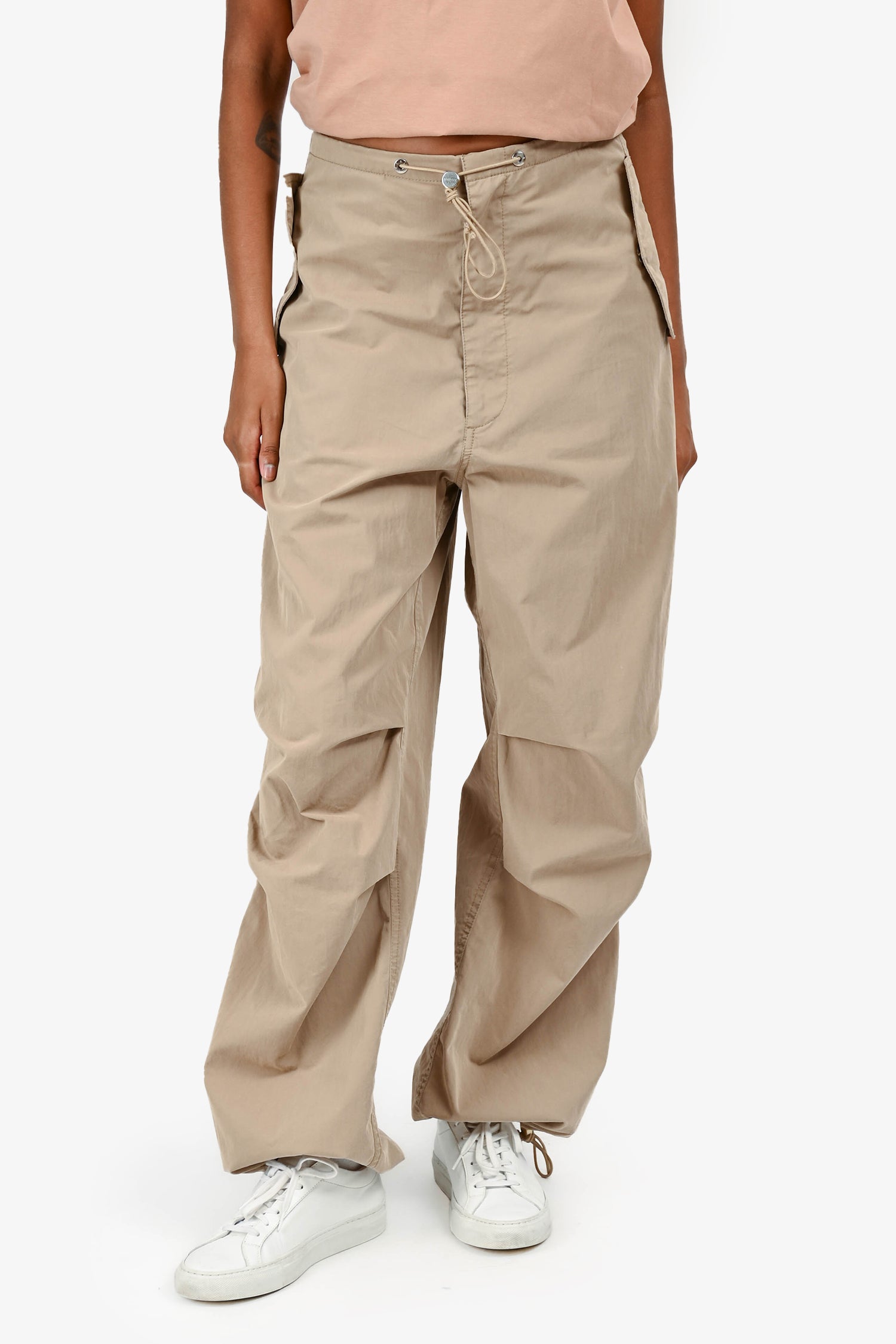 Refresh availabilityDion Lee Tan Cotton Cargo Pant. Side and back flap pockets. Zip fly with button closure. Drawstring on the waist and hem Tonal stitching.