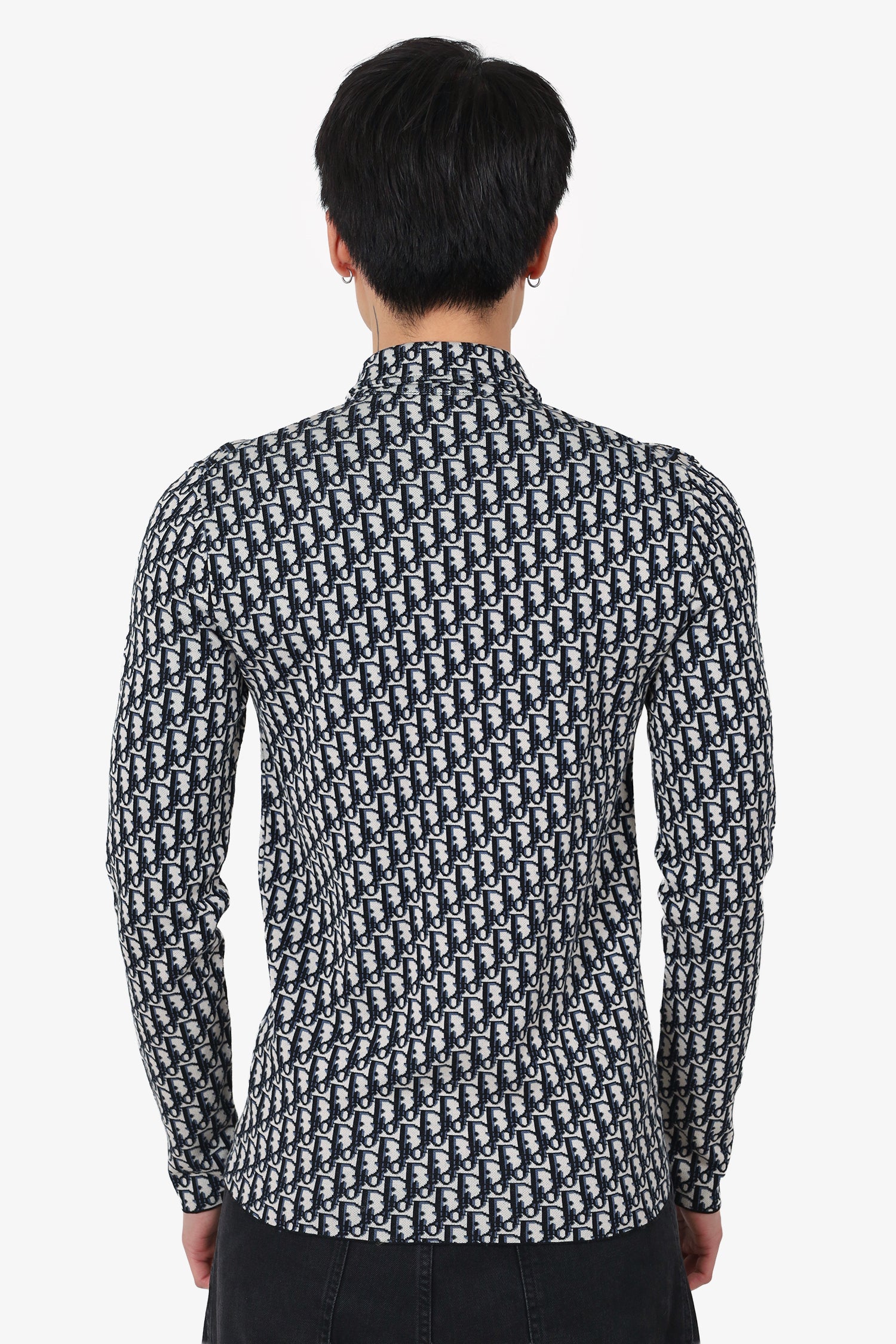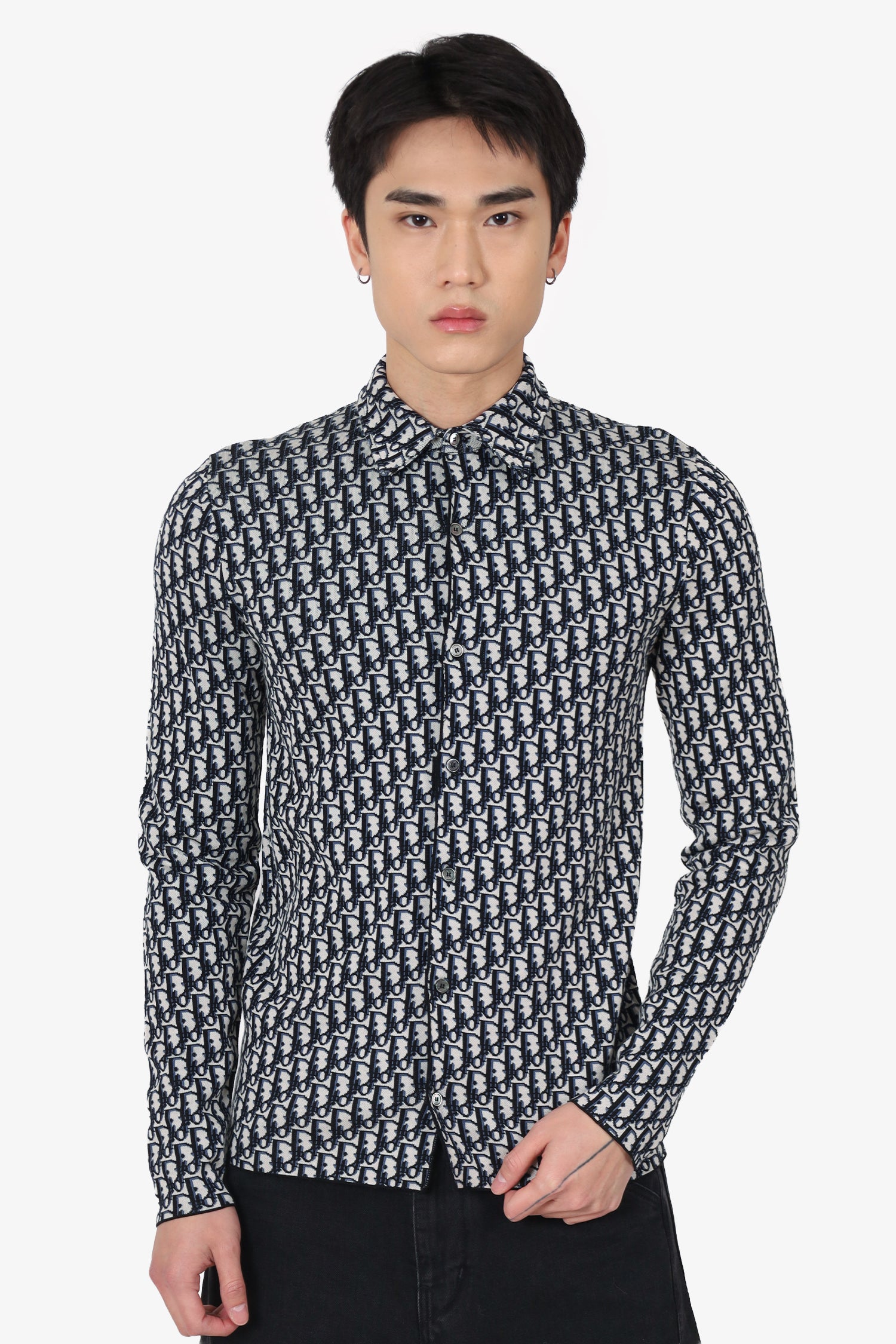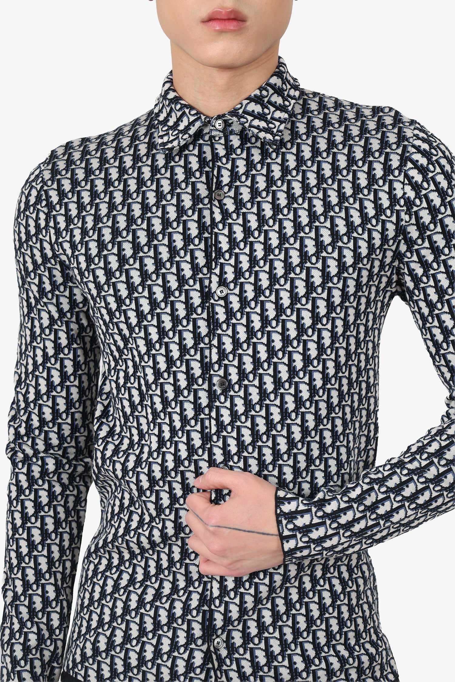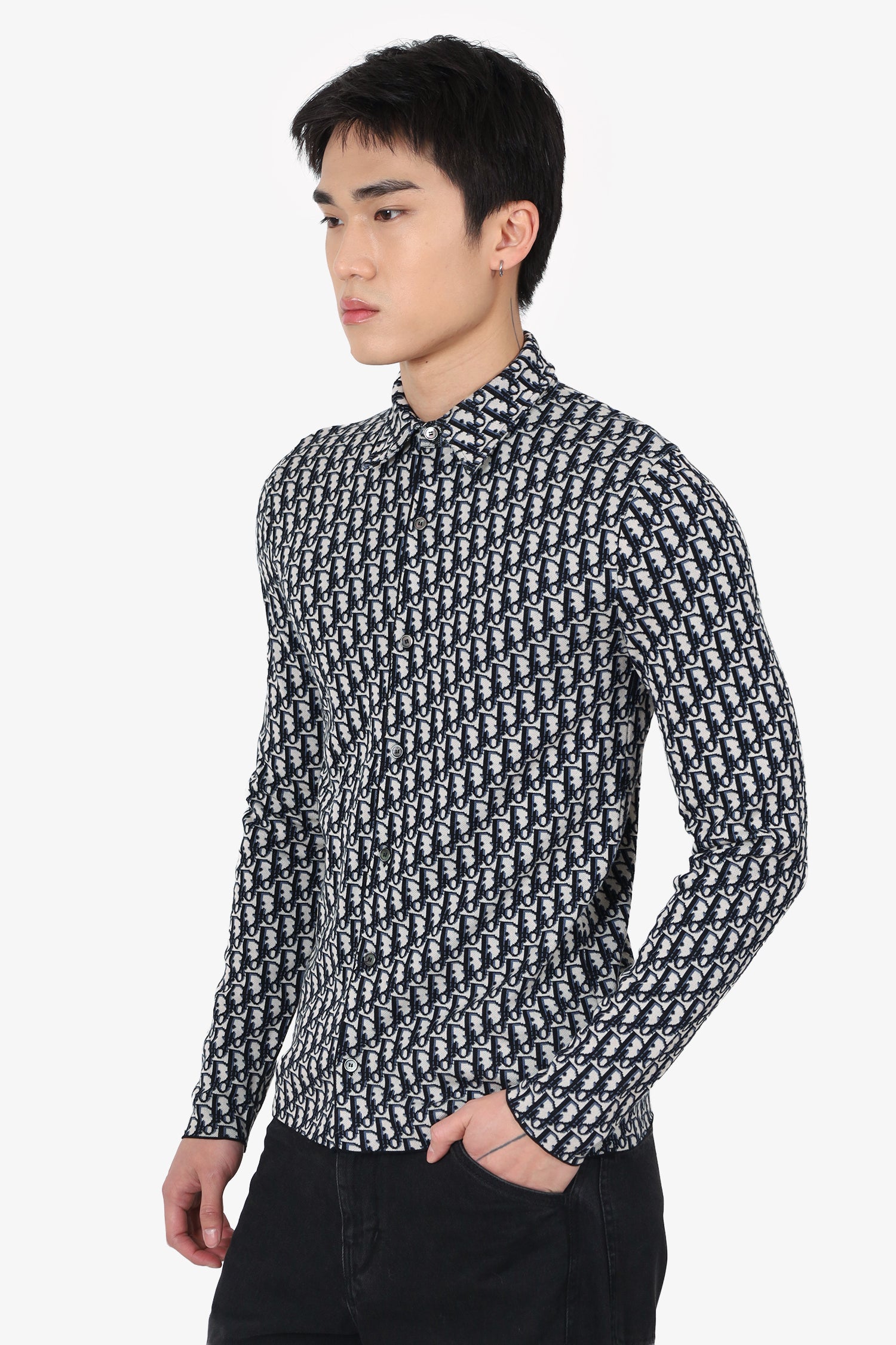 Refresh availabilityDior Cream/Navy Knit Oblique Monogram Long Sleeve Button Down Shirt. Pull-on. Collared-neckline. Front button-up closure. Tonal stitching.