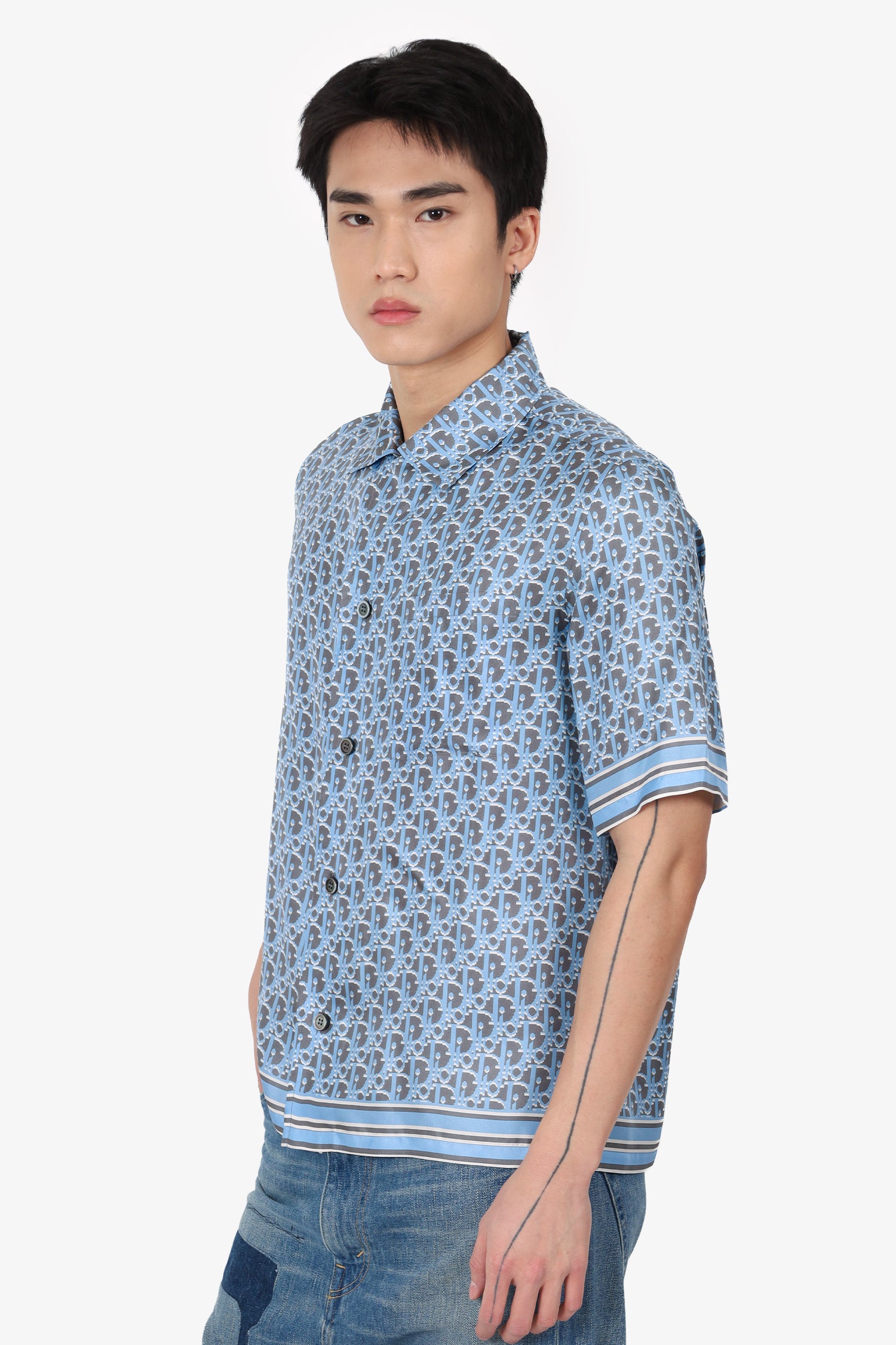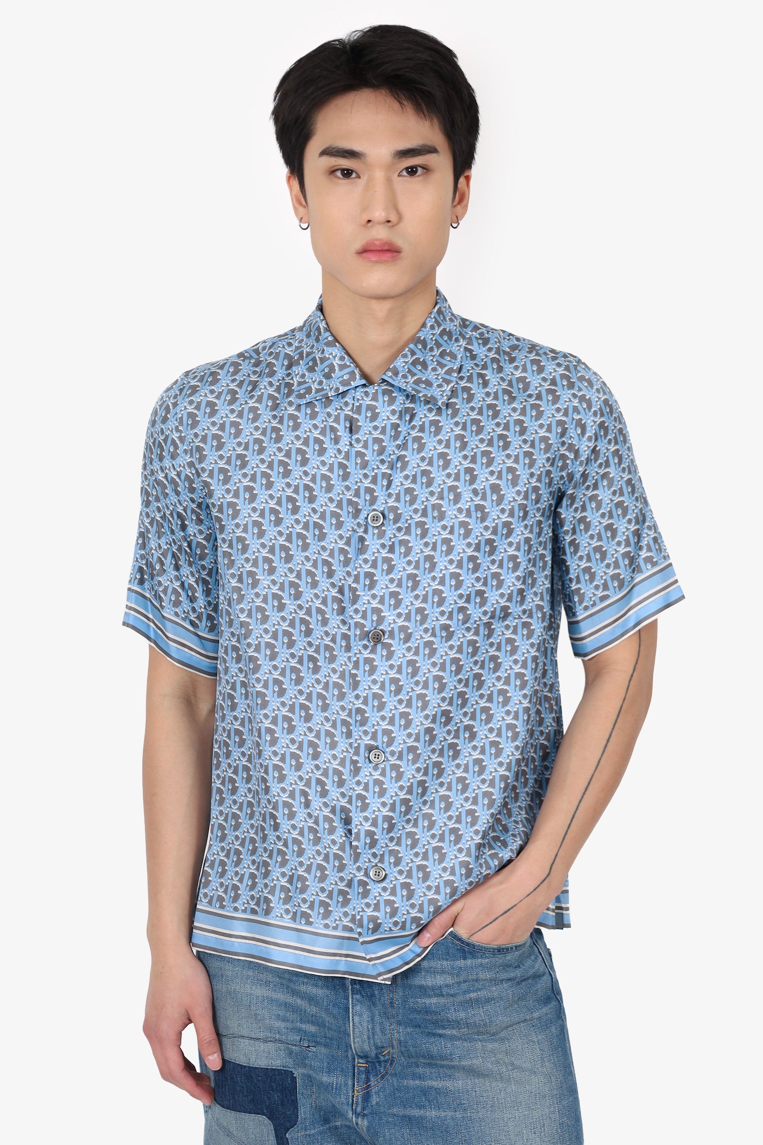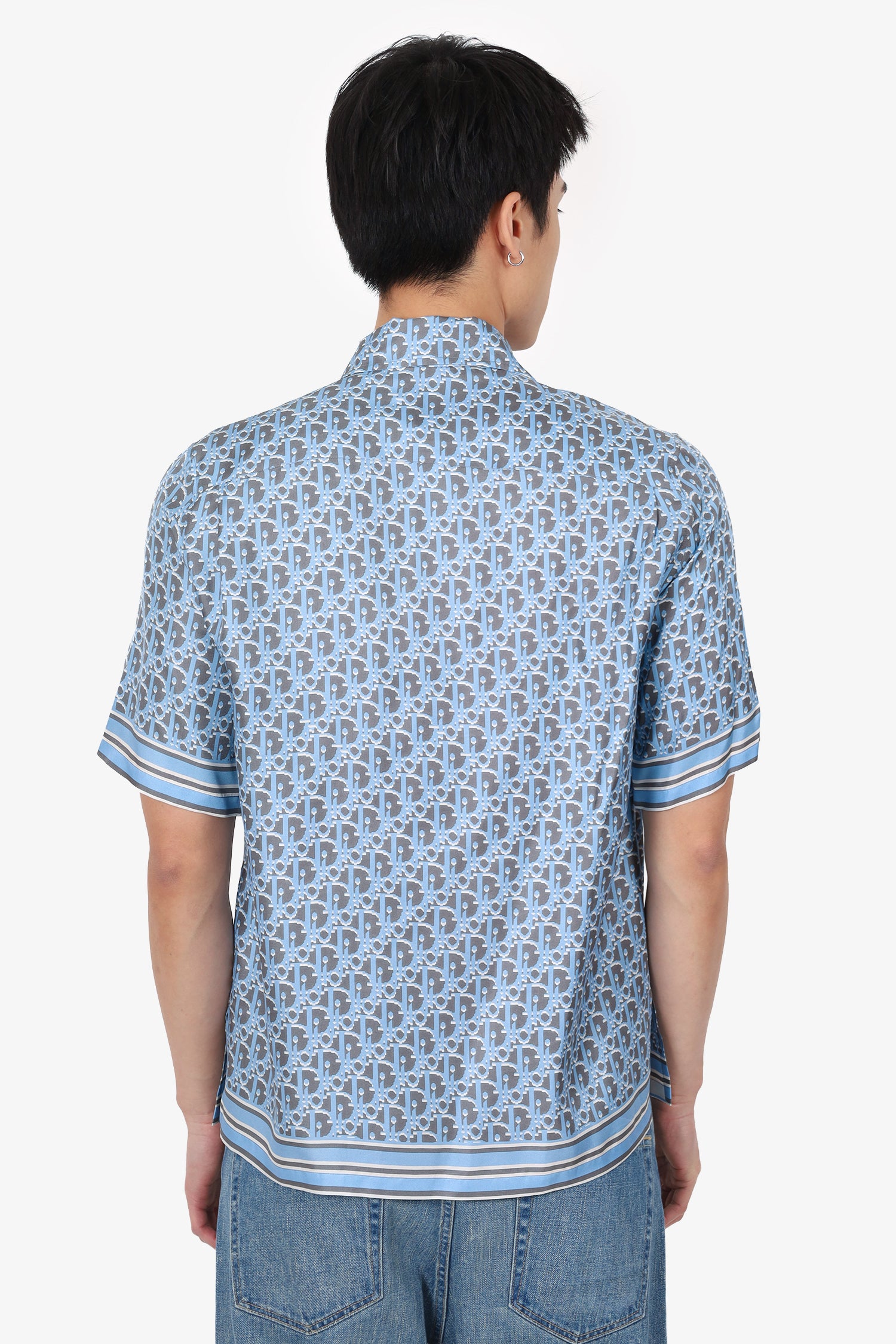 Refresh availabilityDior Grey/Blue Silk Oblique Printed Short Sleeve Shirt. Pull-on. Collared-neckline. Front button-up closure. Tonal stitching.