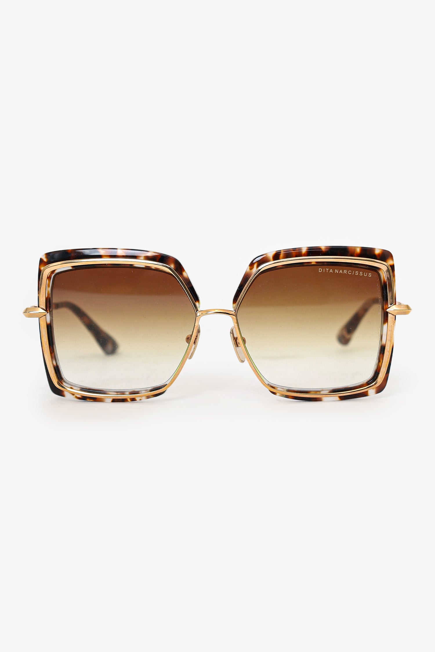 Refresh availabilityDita Narcissus Tortoise Shell Oversized Sunglasses. Adjustable nose pads. Gold-tone hardware.