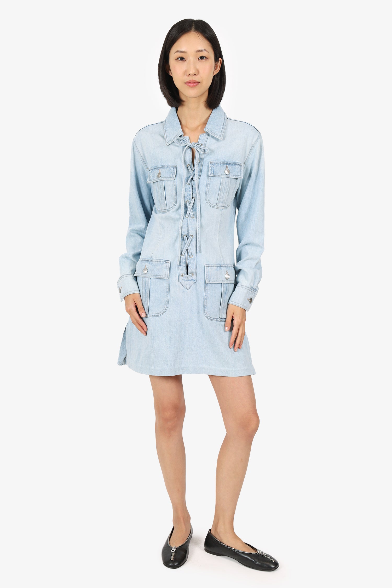 Refresh availabilityDL1961 Blue Denim Lace-up Long Sleeve Mini Dress. Slip-on. Collared-neckline. Front lace-up closure. Sleeve cuffs with button-up closure. 4 exterior flap pockets with button-up closure. Contrast stitching. Silver-tone hardware.