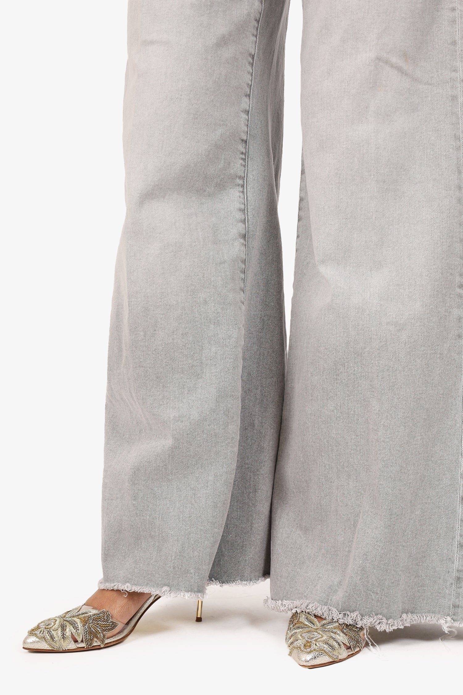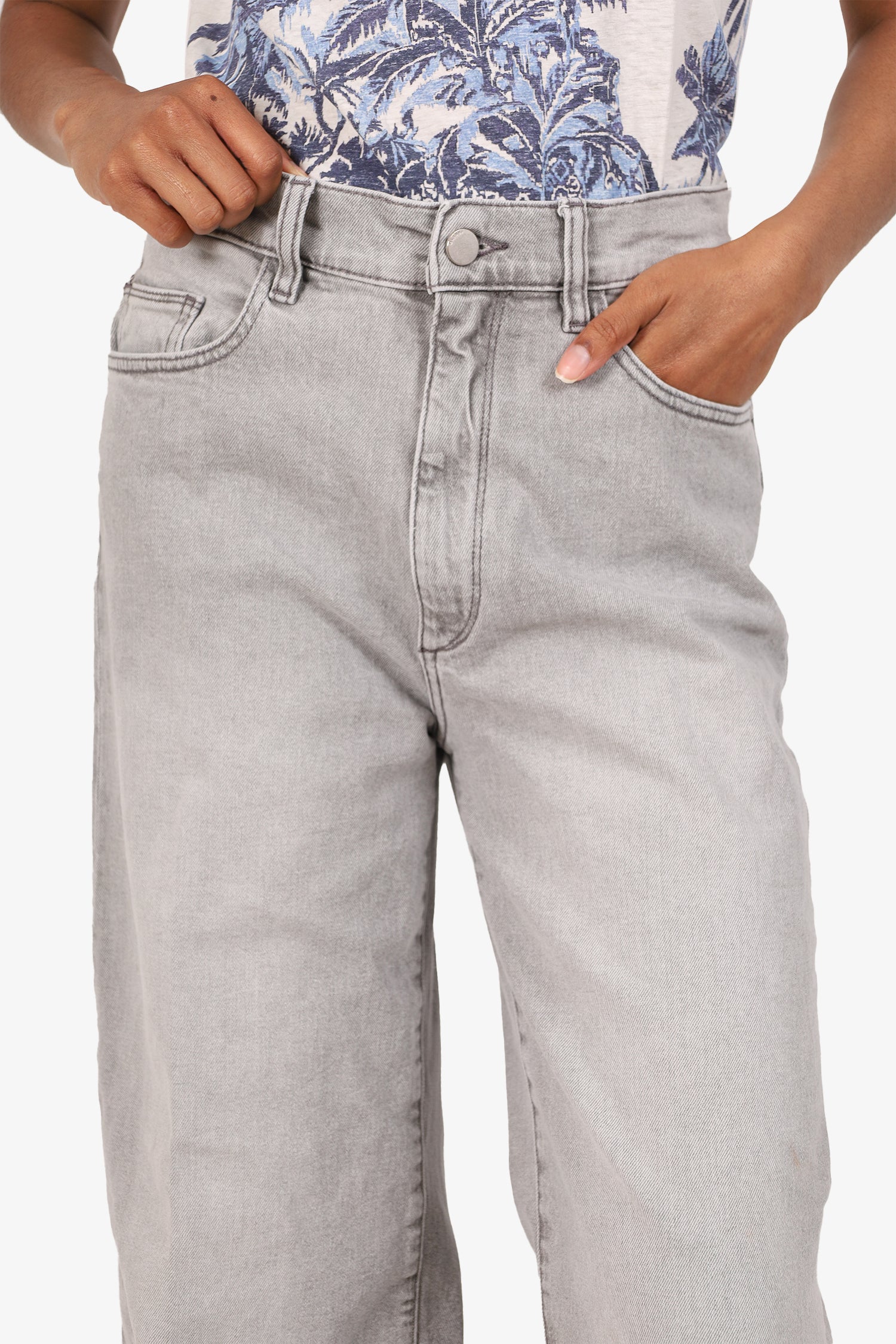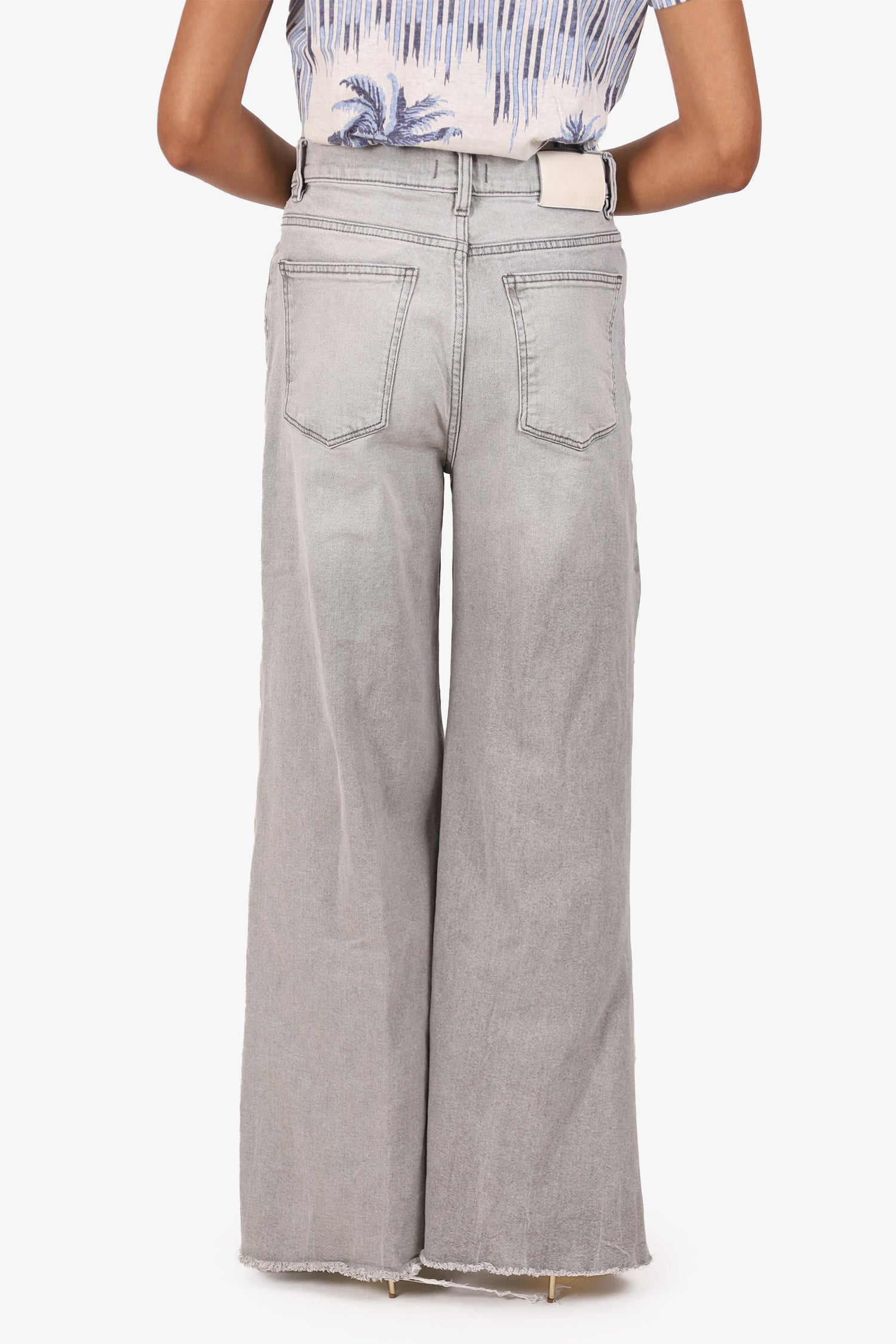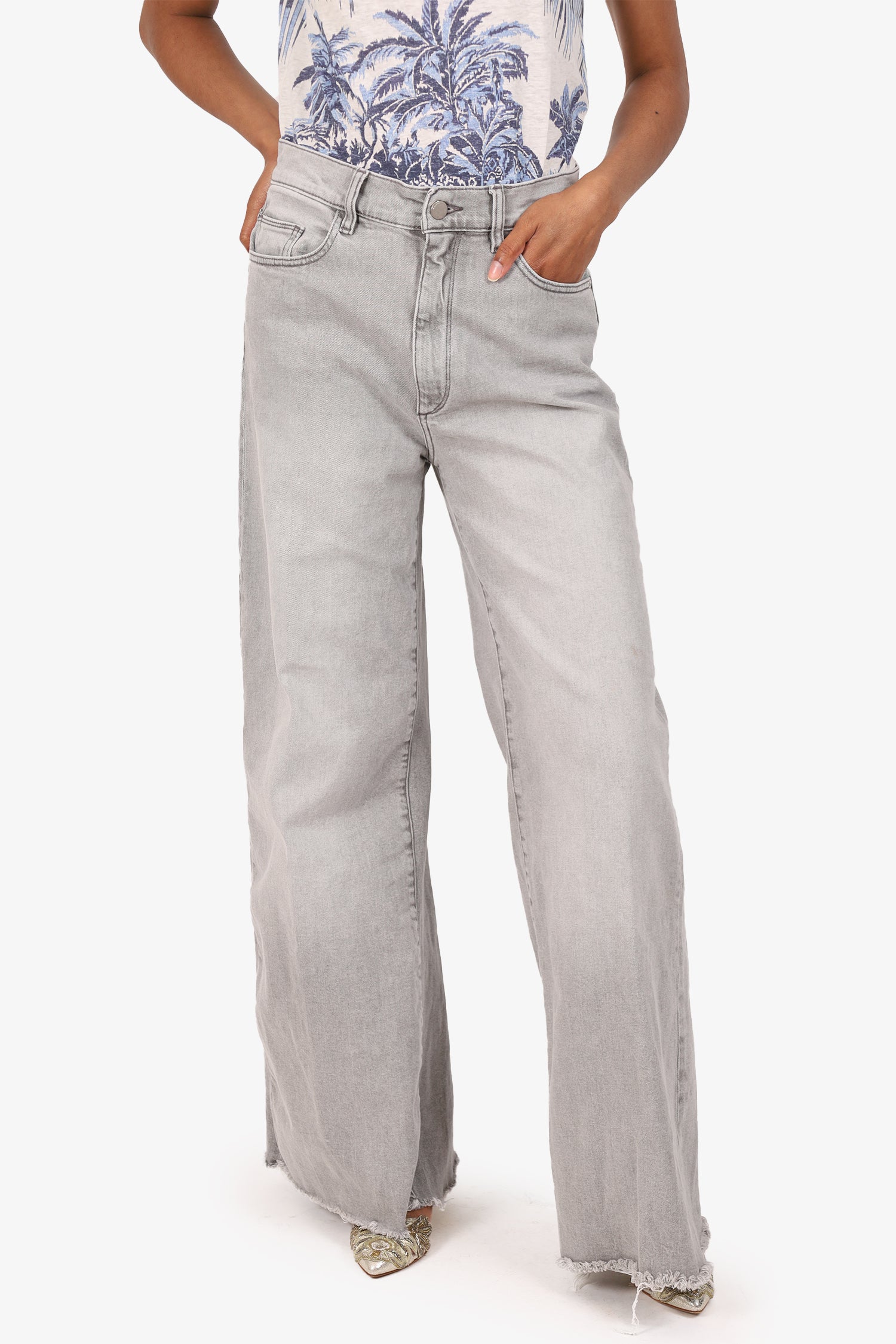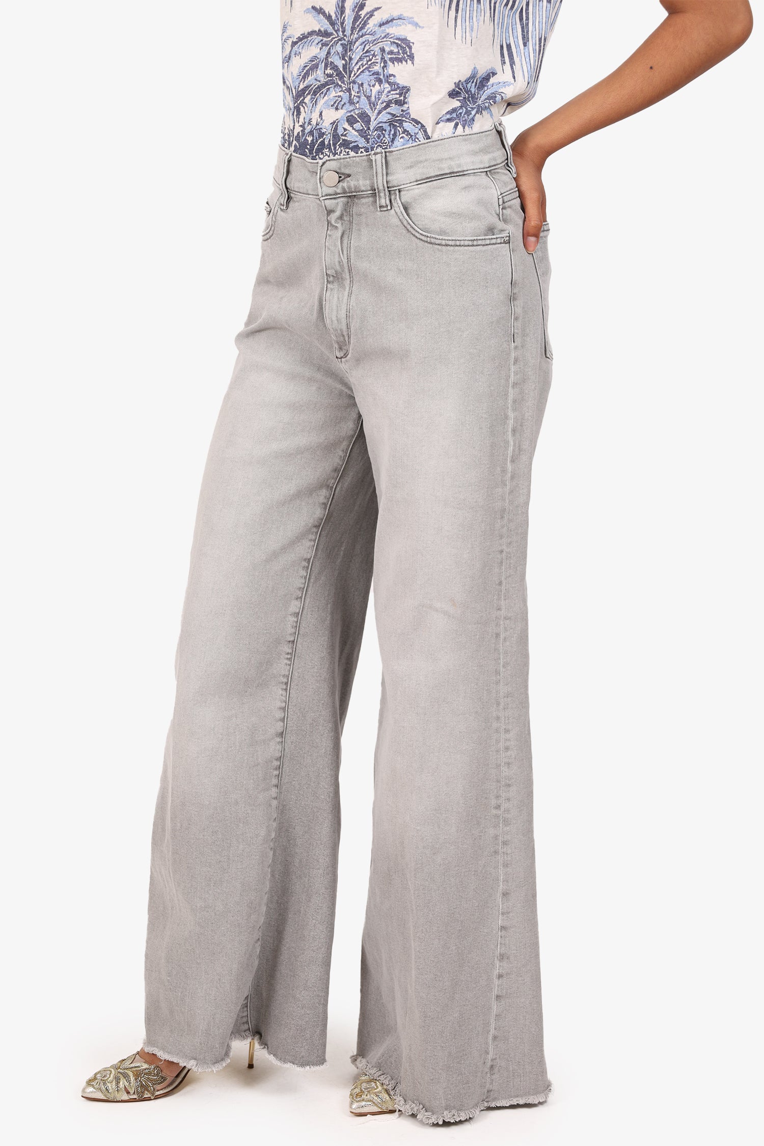 Refresh availabilityDL1961 Grey Denim Hepburn Wide Leg Jeans. Pull-on. Front zip with button closure. Waistband belt loops. 5 exterior pockets; 2 front side slip and 1 mini compartment, 2 rear slip. Raw bottom hem. Silver-tone hardware. Tonal stitching.