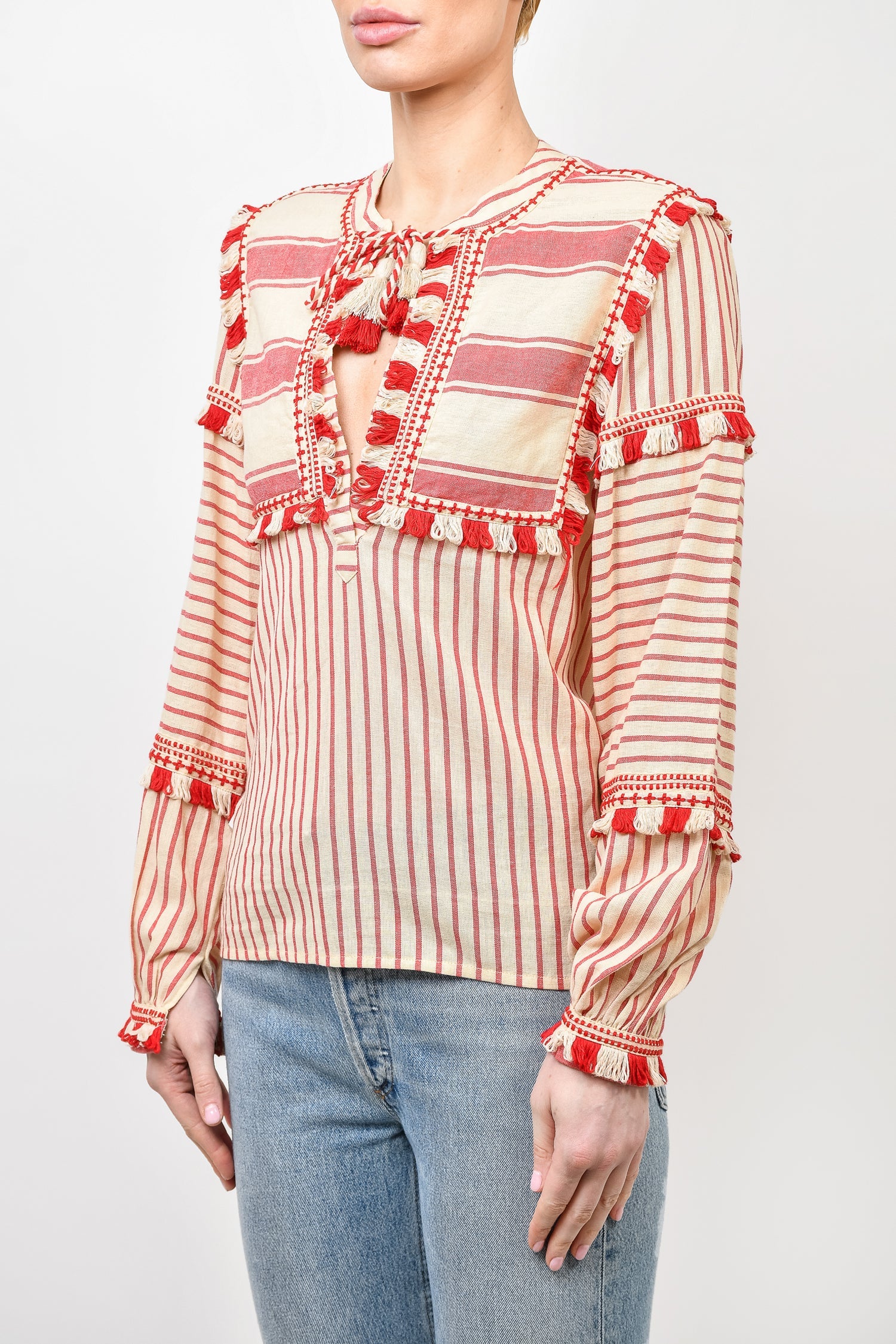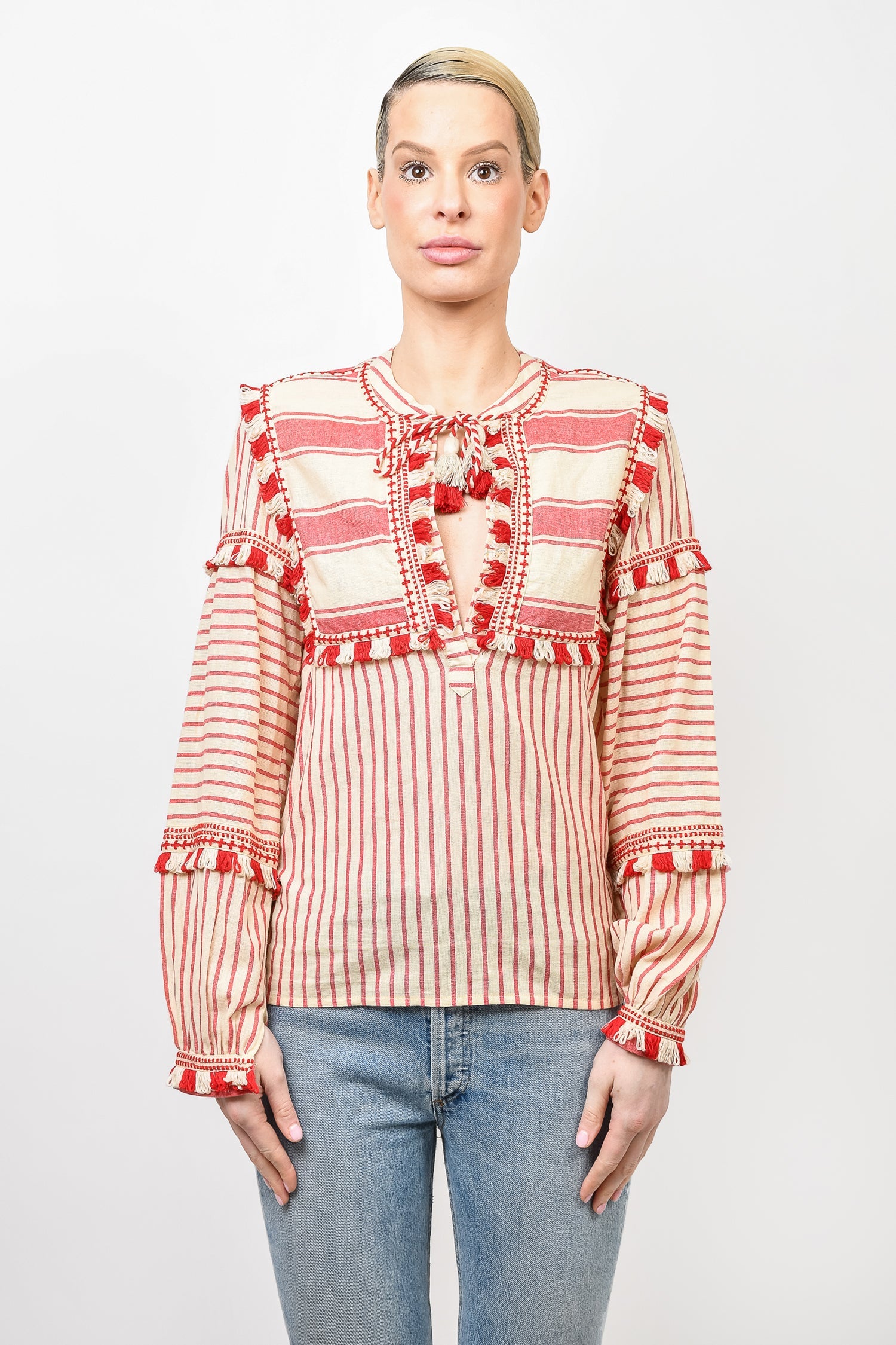 Refresh availabilityDodo Bar Or Cream/Red Striped Cotton Blouse. V neck. Tie at neckline with tassels. Tonal stitching.