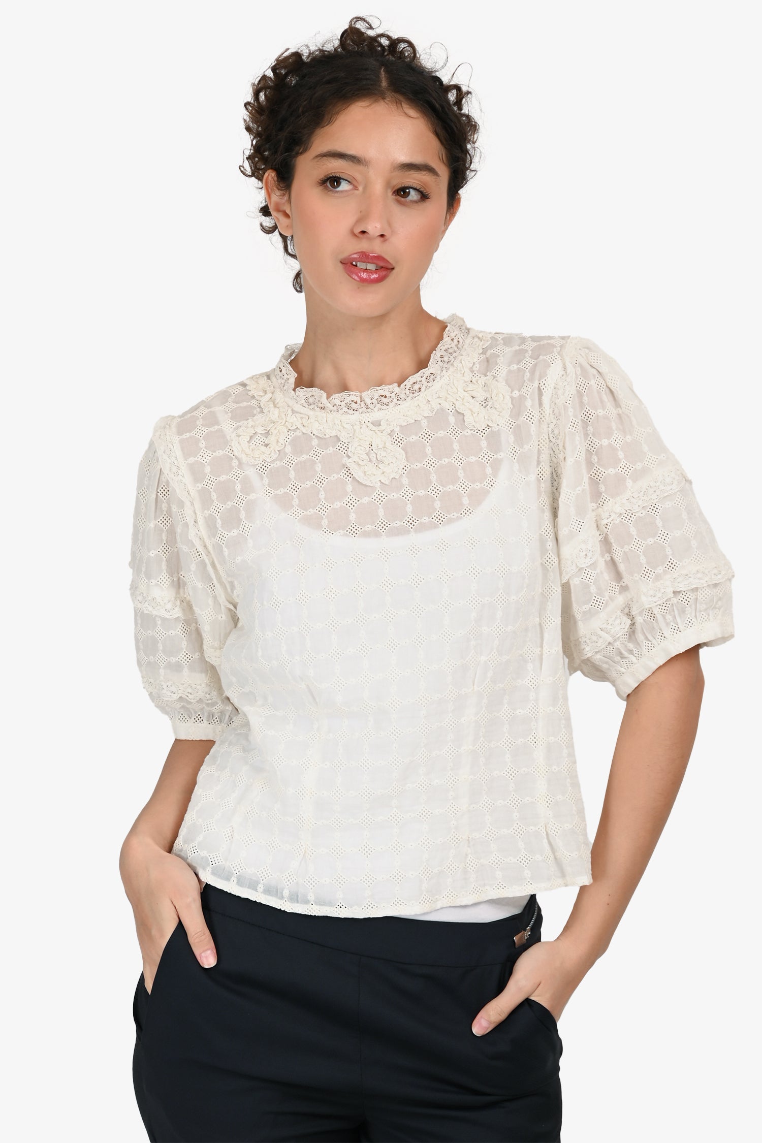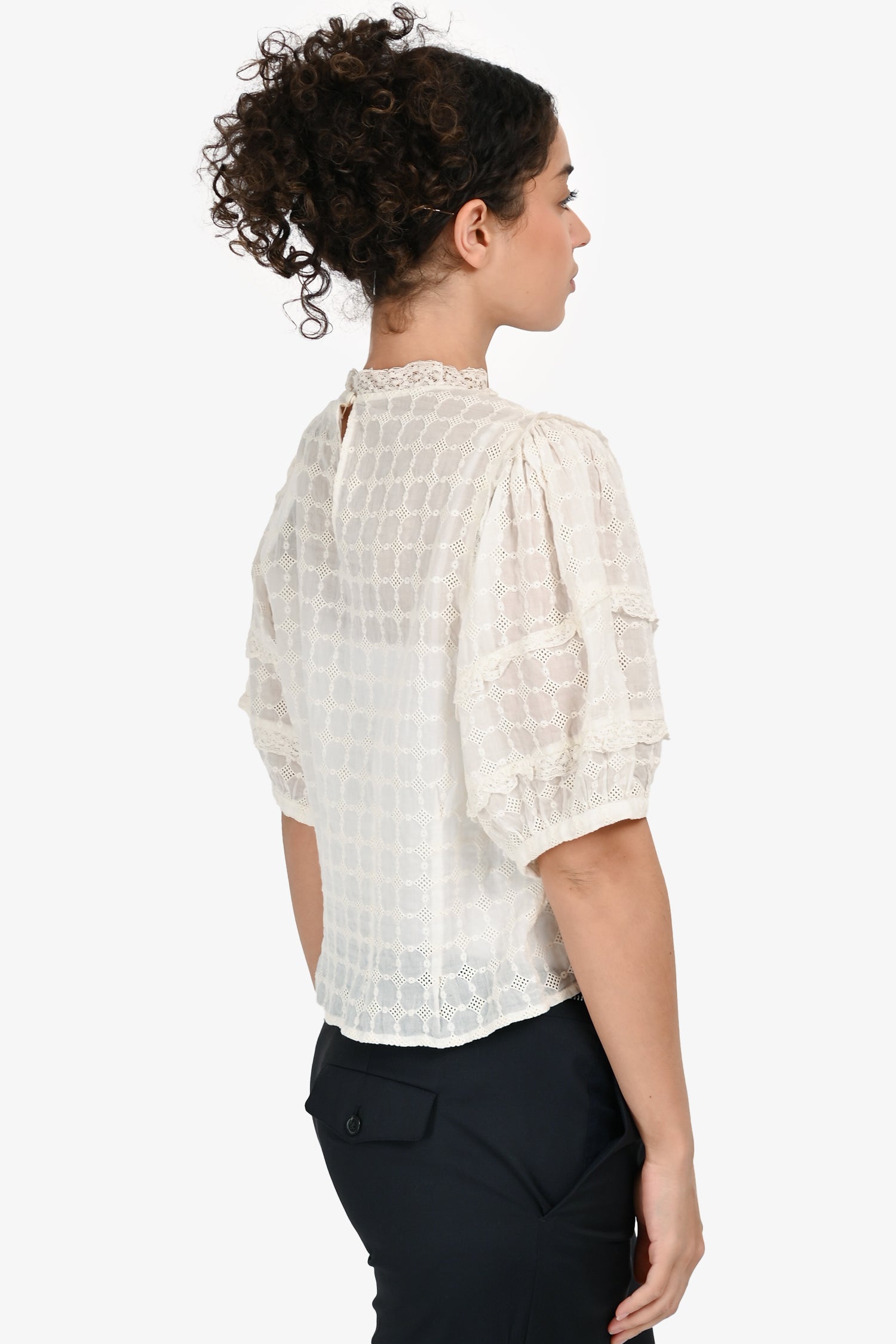 Refresh availabilityDoen White Cotton 'Edie' Top. Pull-on. Raised collar with rear button closure. Tonal stitching.