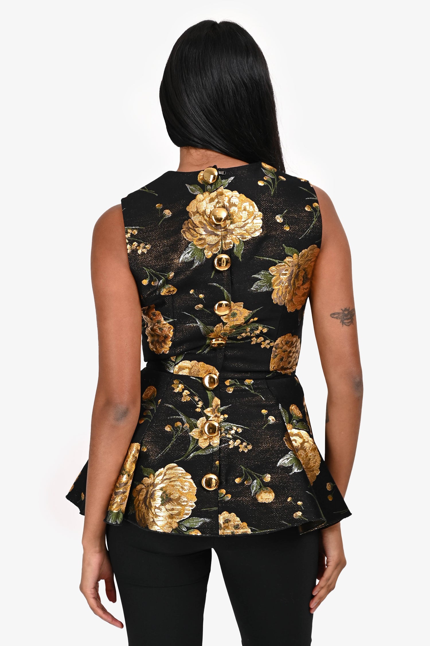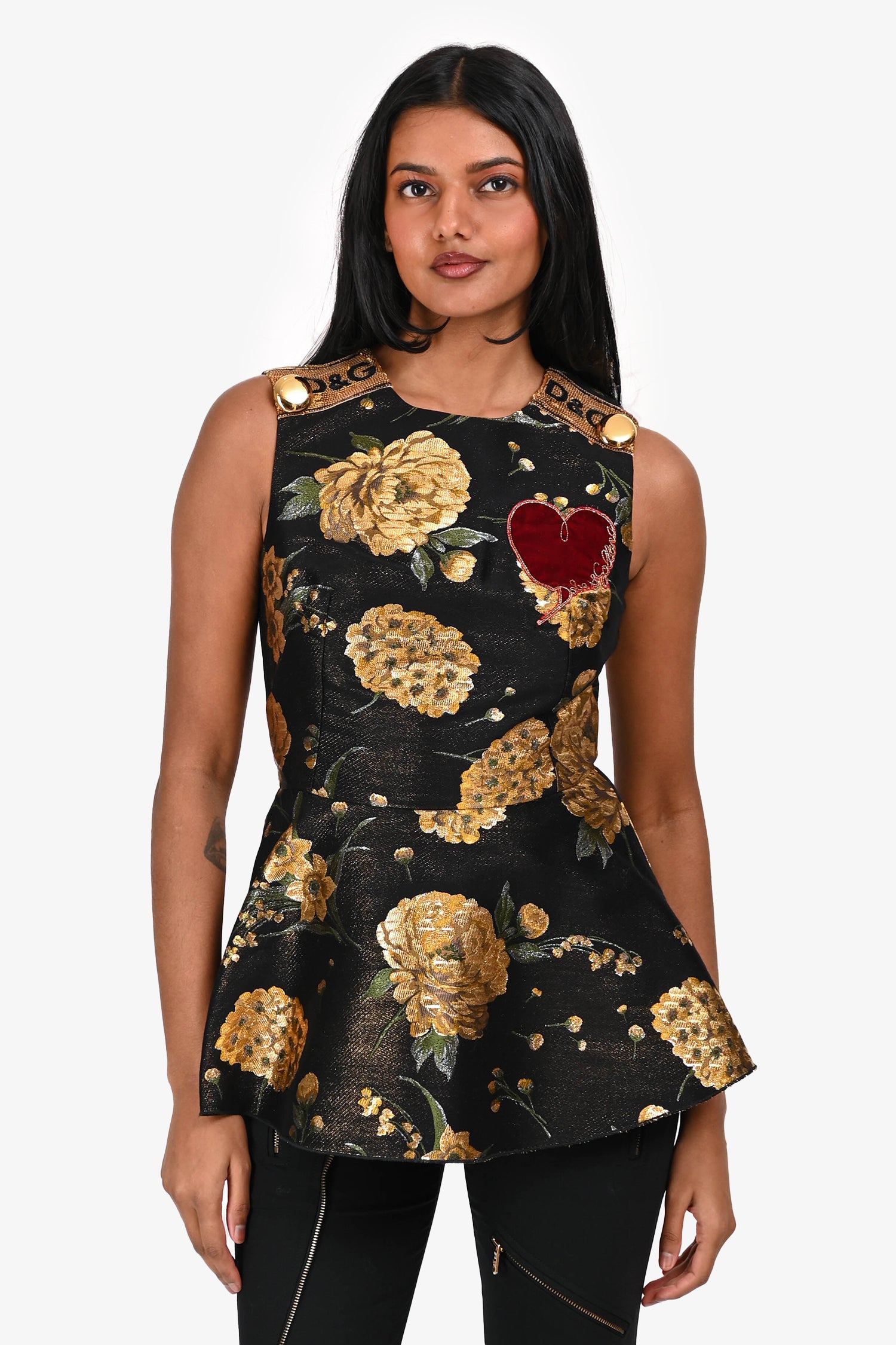 Refresh availabilityDolce & Gabbana 2017 Black/Gold Silk Jacquard Peplum Top. Pull-on. Round neckline. Rear zip closure. Lined interior. Tonal stitching.