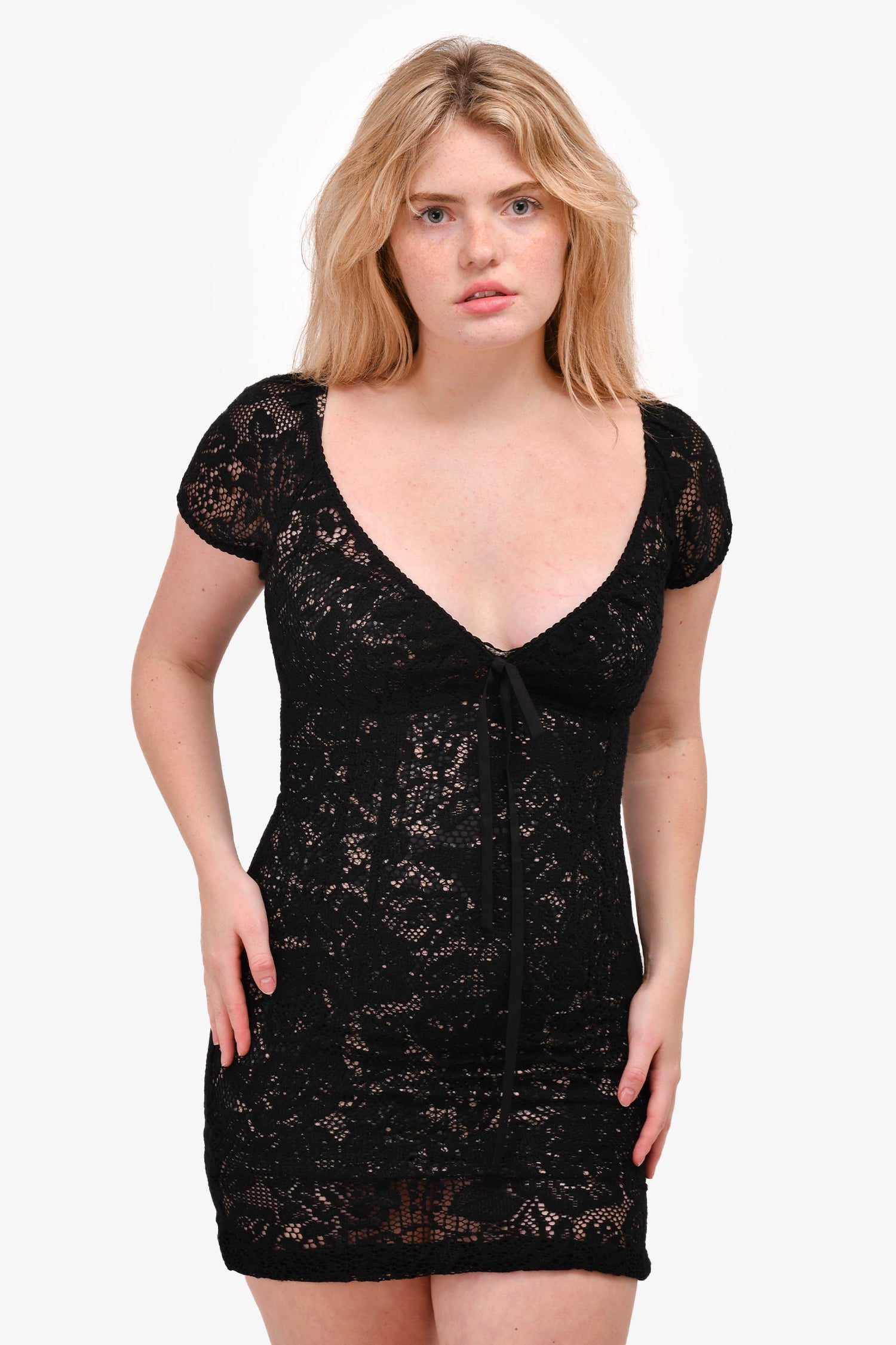 Refresh availabilityDolce & Gabbana Black Eyelet Overlay Bow Detail Midi Dress. V-neckline. Eyelet lace overlay. Printed lace slip. Bow at the front. Back zipper closure on both the slip and overlay. Tonal stitching.