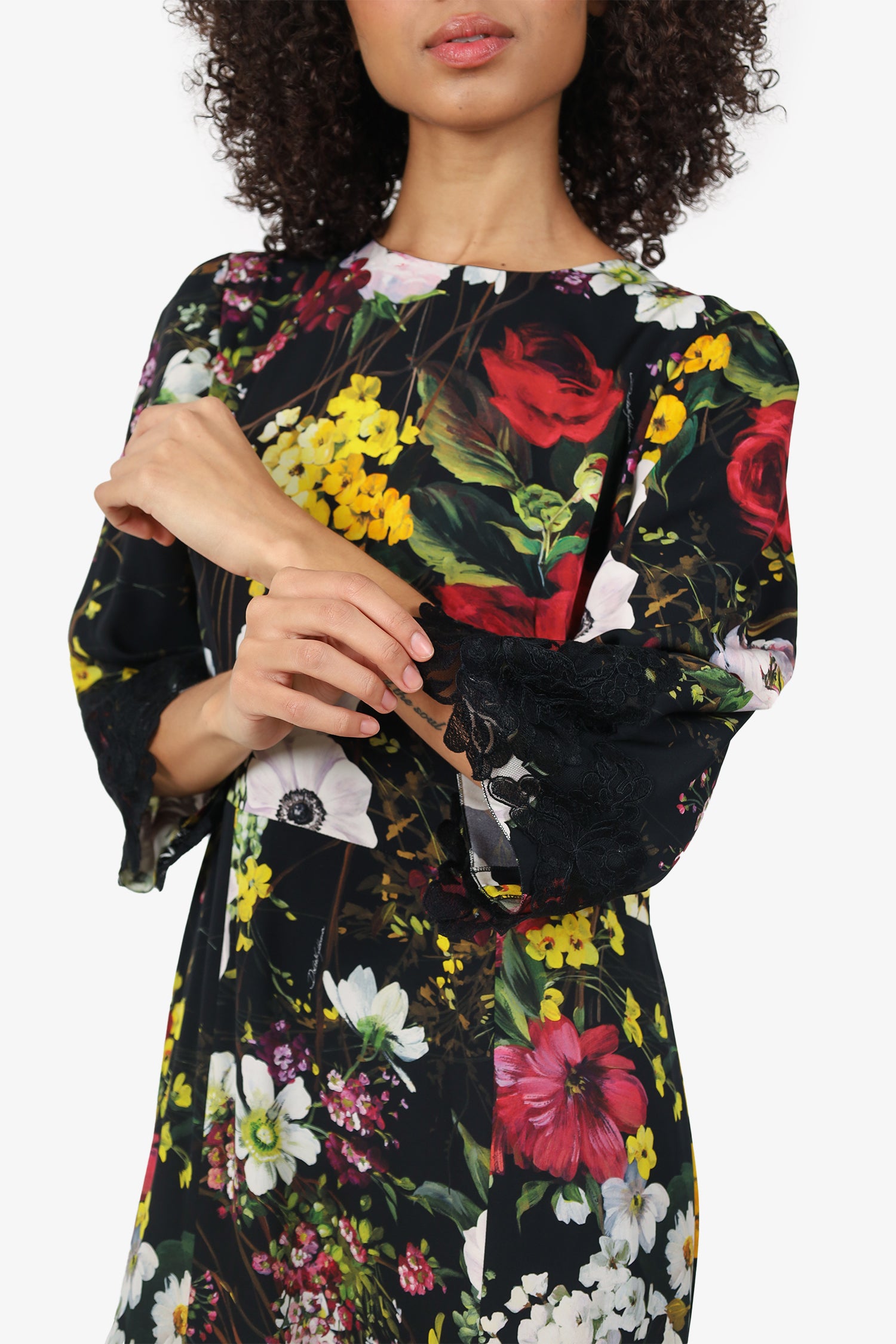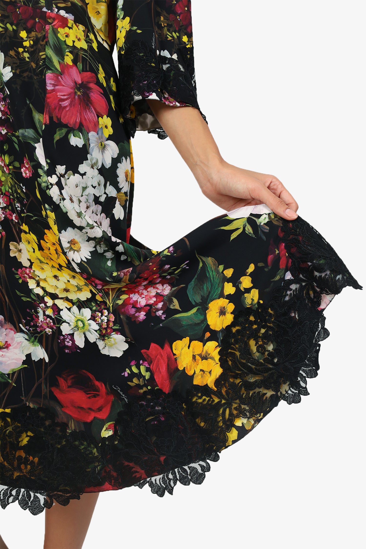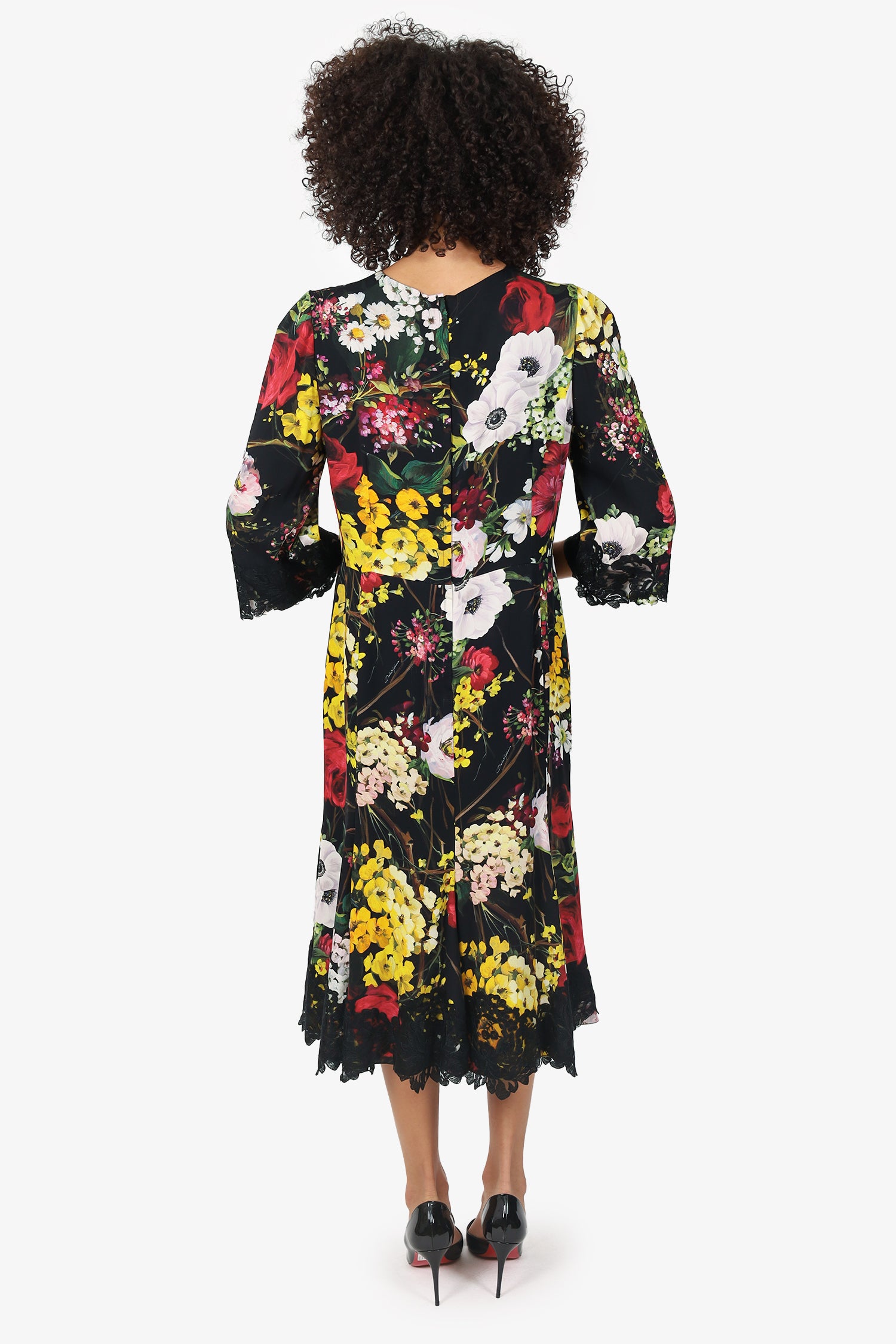 Refresh availabilityDolce & Gabbana Black Floral Print Silk Lace Trim Midi Dress. Pull-on. Round neckline. Rear zip and hook closure. Lined interior. Gunmetal-tone hardware. Tonal stitching.