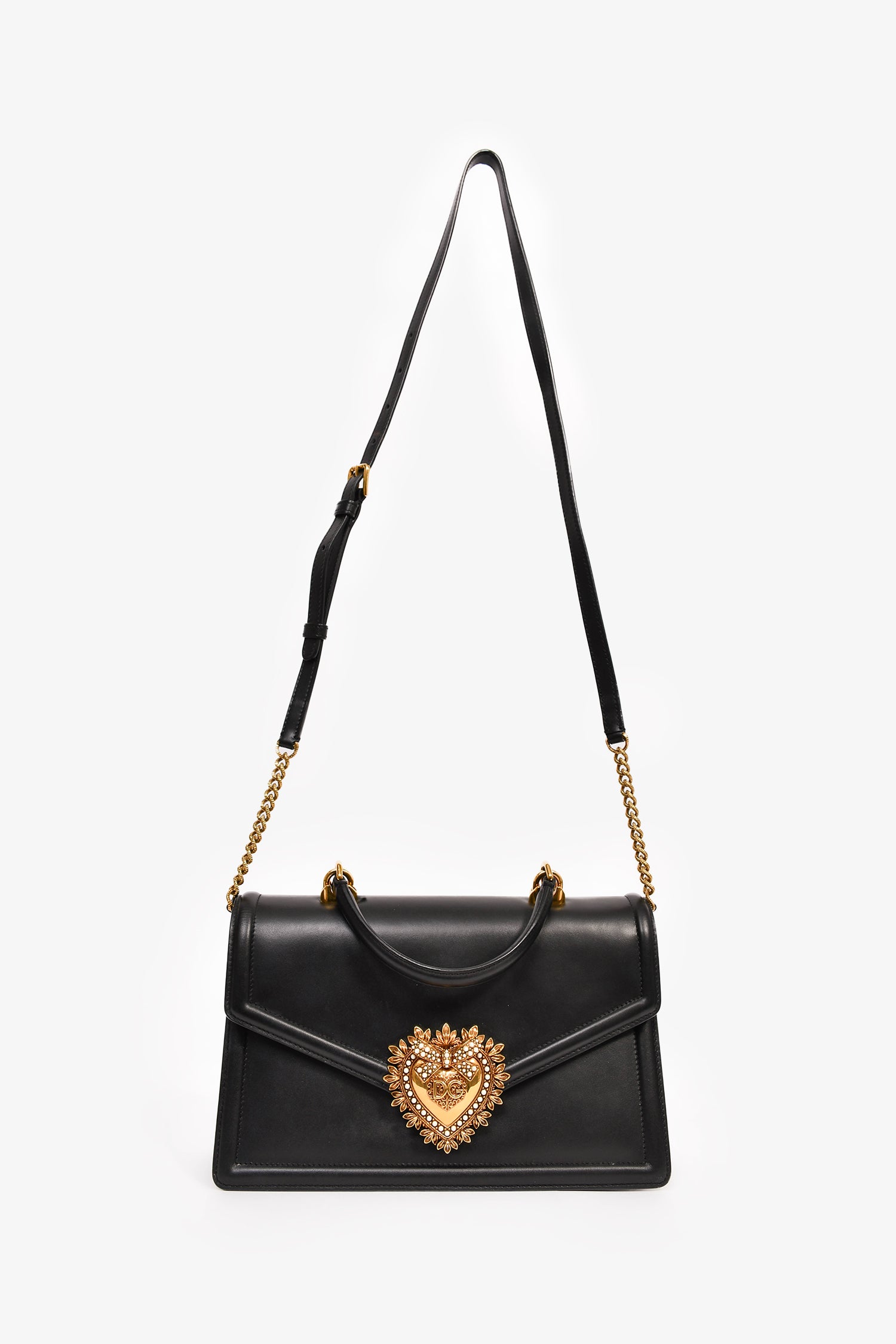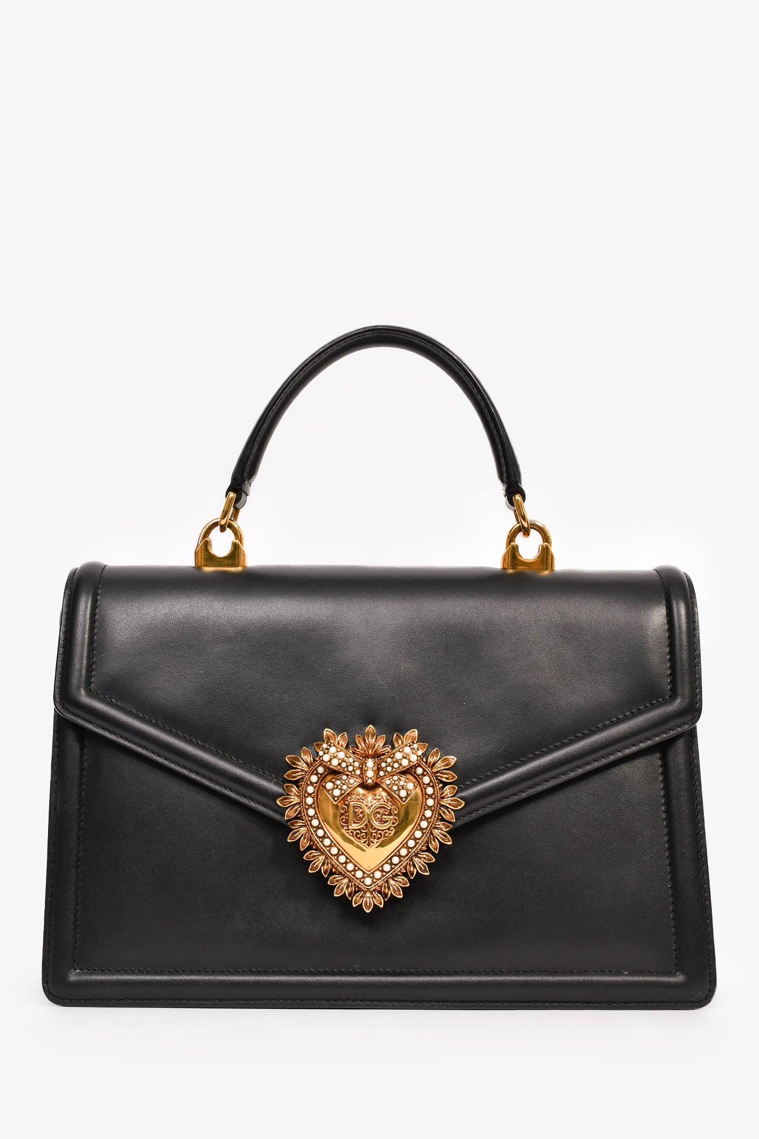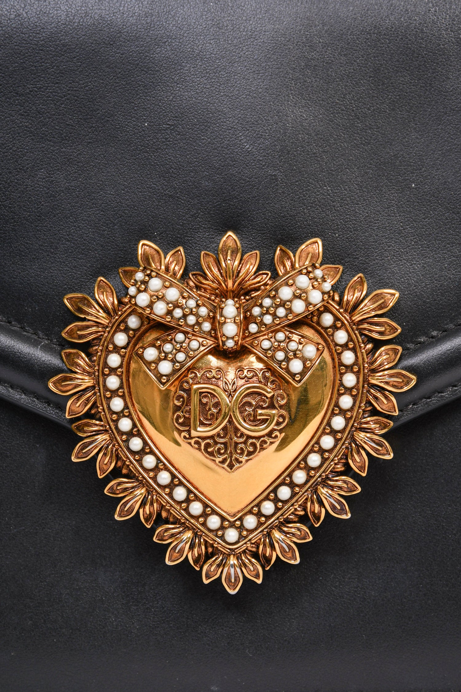 Refresh availabilityDolce & Gabbana Black Leather 'Devotion' Bag. Gold-tone hardware. Faux pearl embellishment. Fold-over flap with a push-open closure. Rolled top handle. Attachable shoulder and adjustable strap. 3 interior compartments, 1 card slot, and 1 zipped pocket. Tonal stitching.