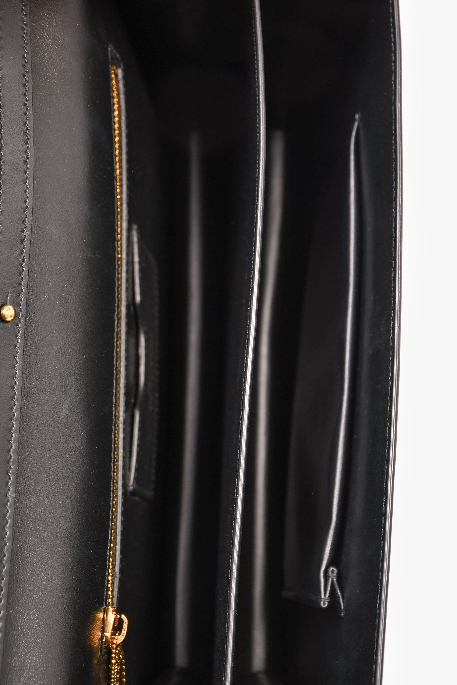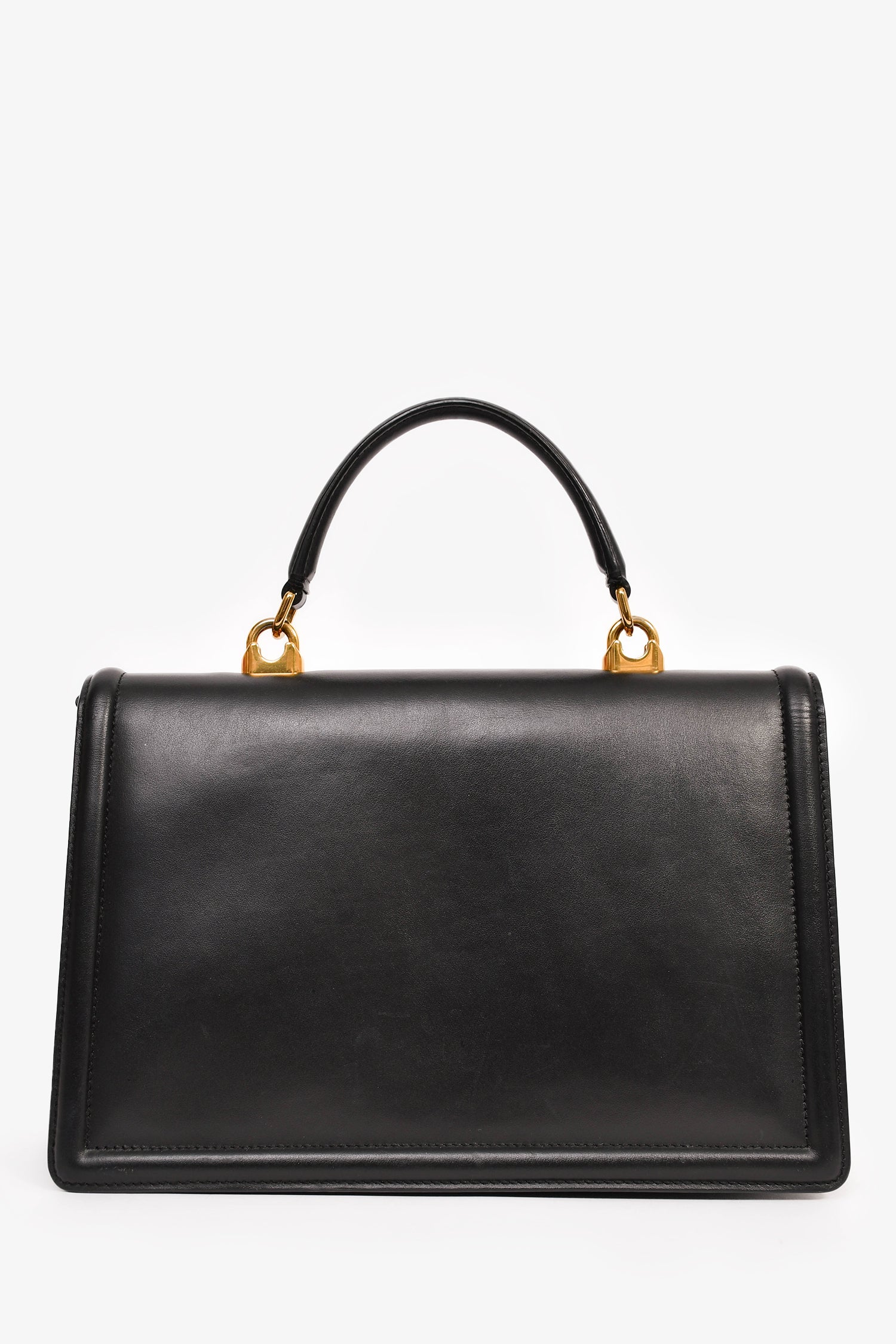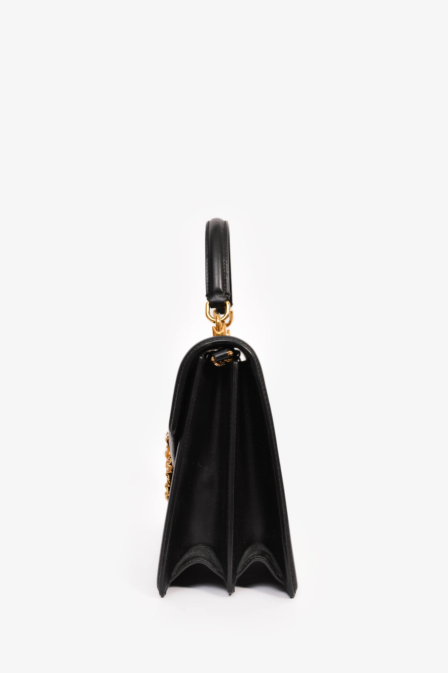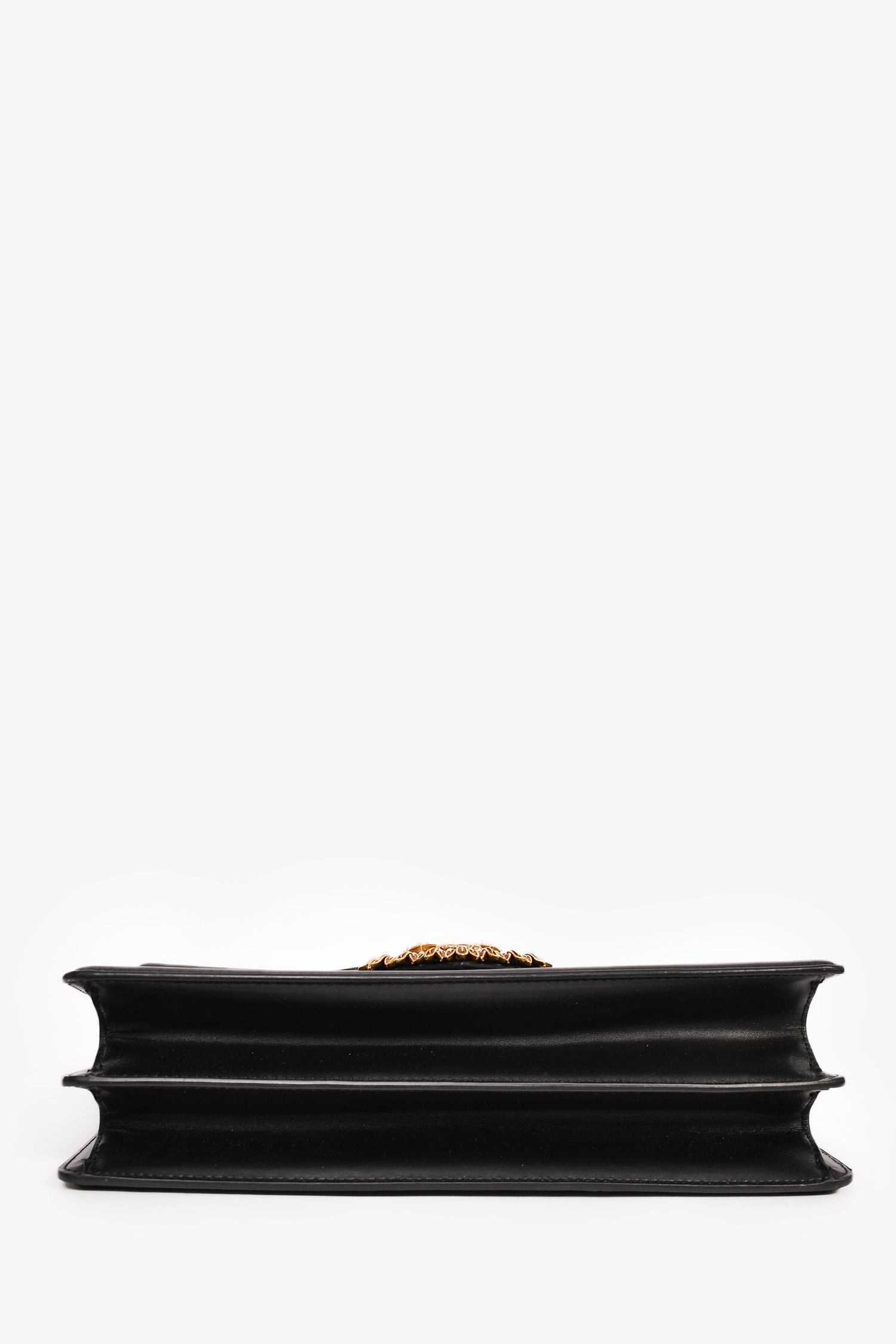 Refresh availabilityDolce & Gabbana Black Leather 'Devotion' Bag. Gold-tone hardware. Faux pearl embellishment. Fold-over flap with a push-open closure. Rolled top handle. Attachable shoulder and adjustable strap. 3 interior compartments, 1 card slot, and 1 zipped pocket. Tonal stitching.