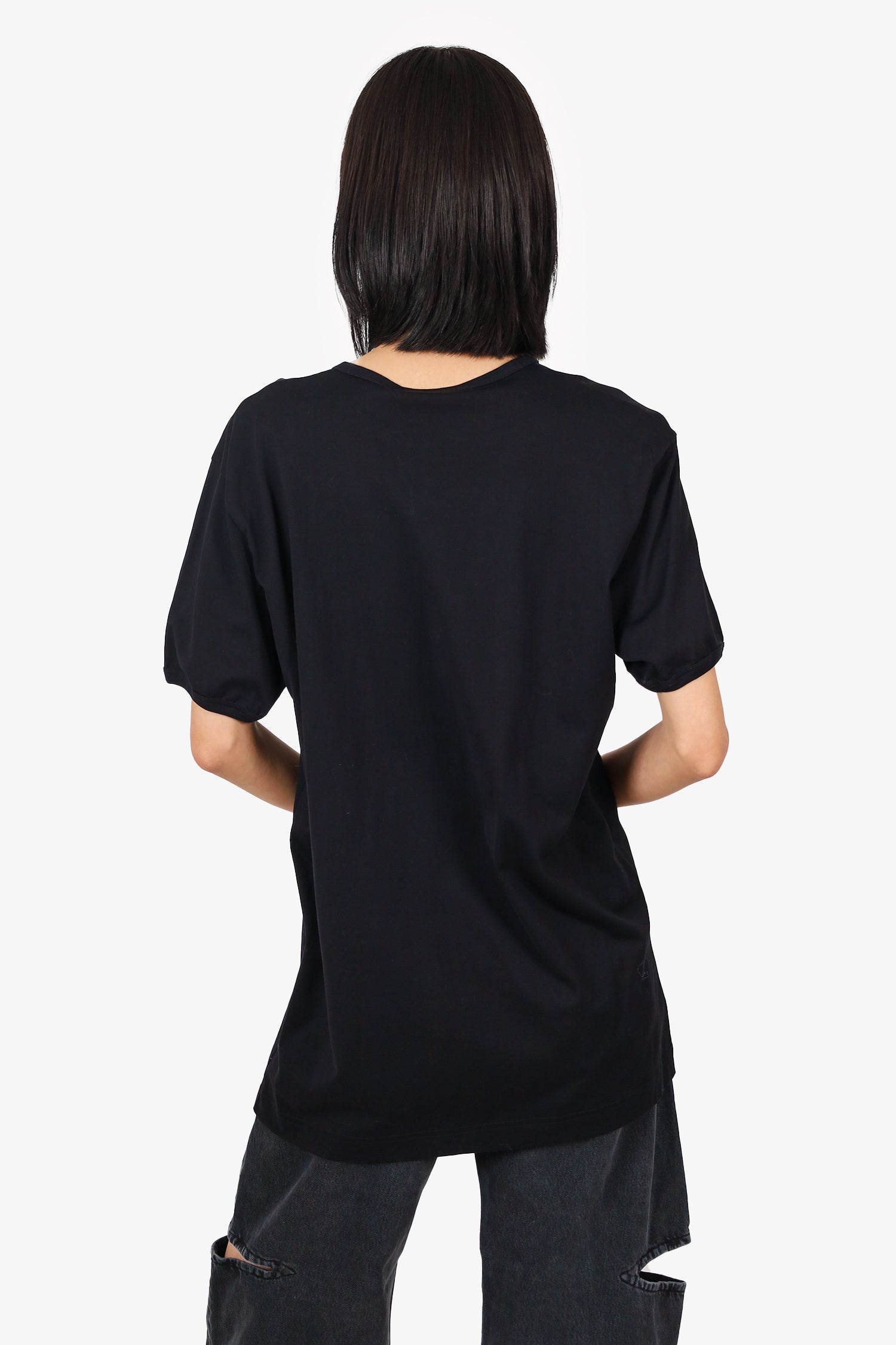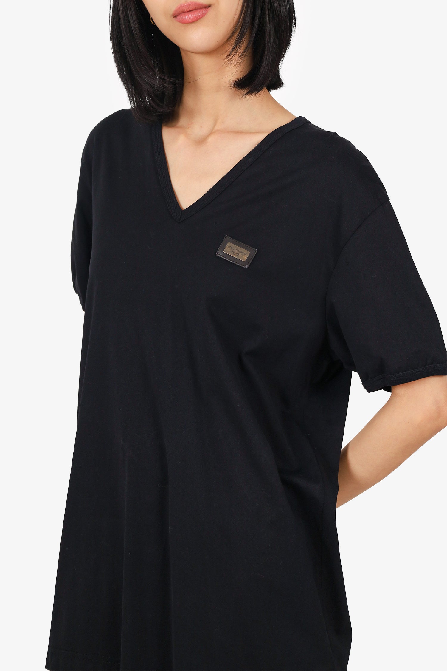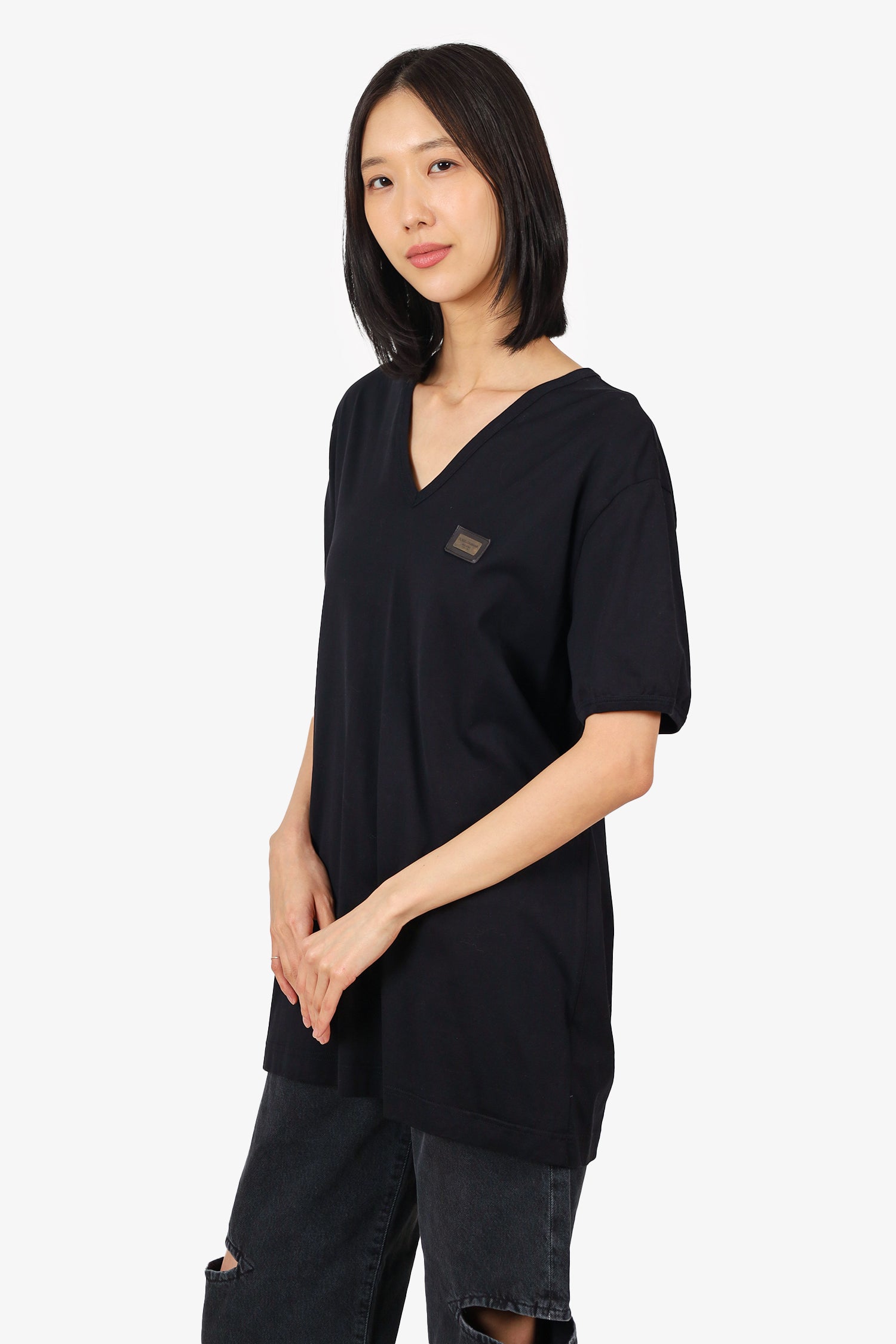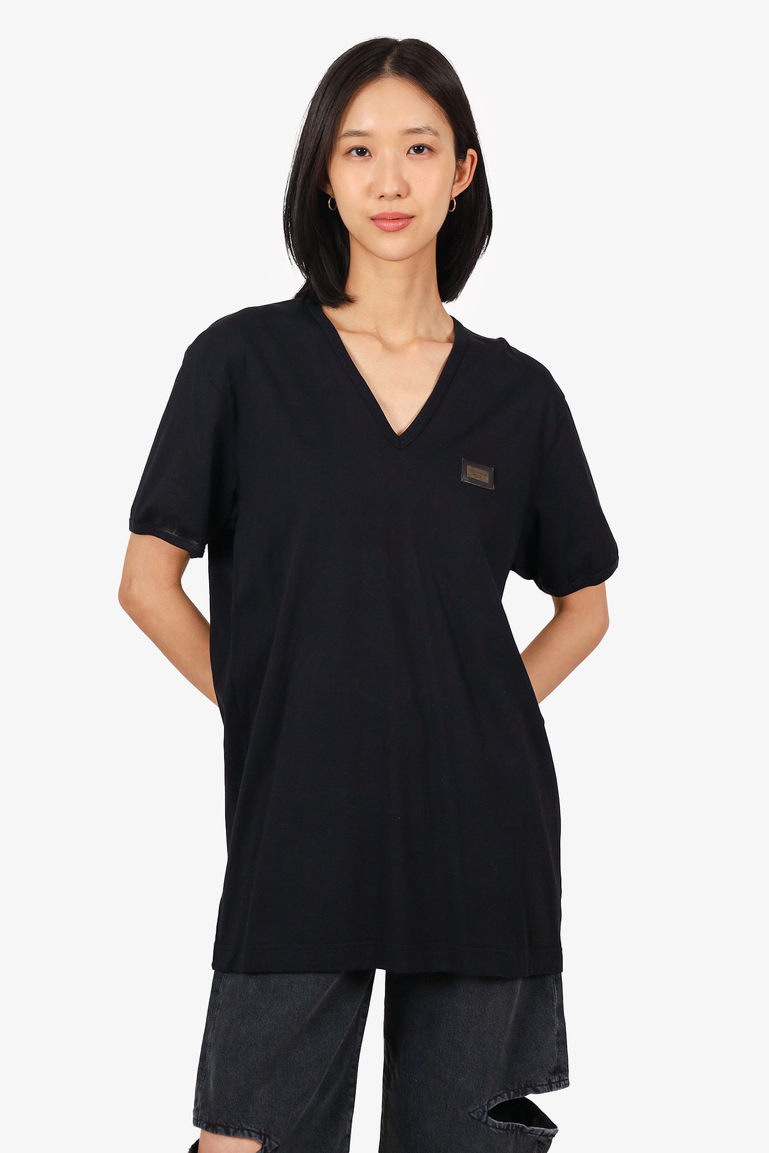 Refresh availabilityDolce & Gabbana Black Logo Patch V-Neck T-shirt. Pull-on. V-neckline. Front left logo patch. Tonal stitching.