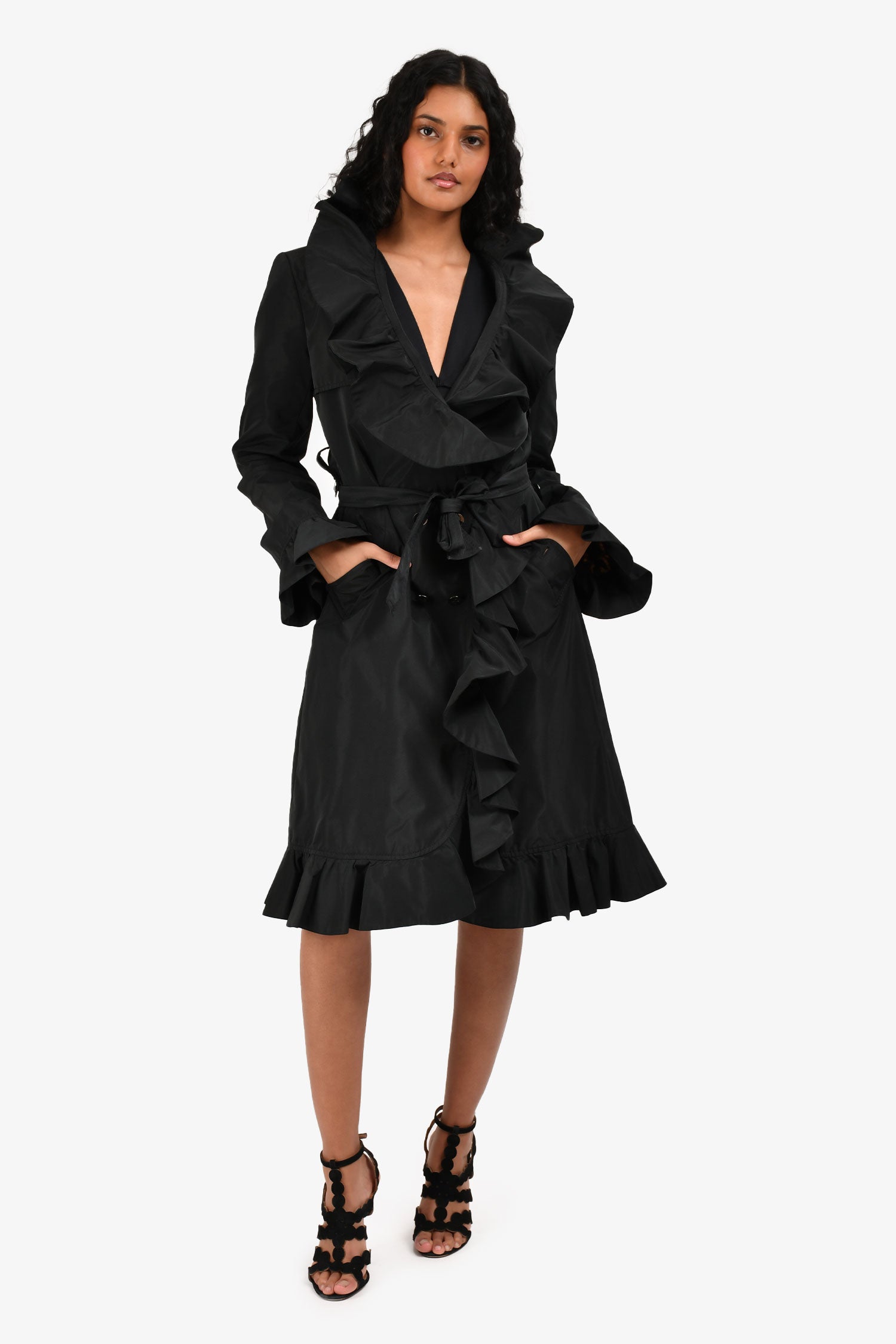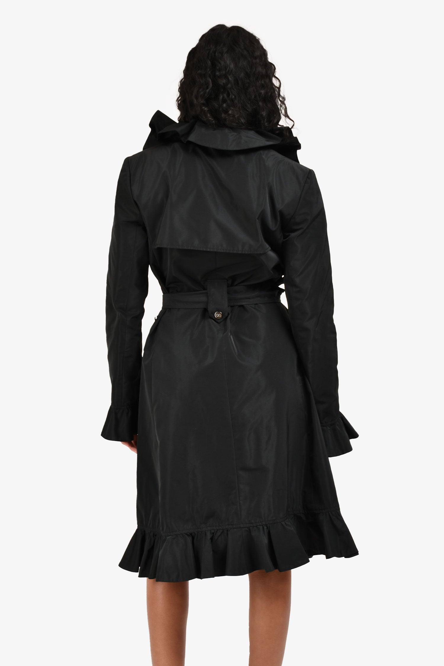 Refresh availabilityDolce & Gabbana Black Nylon Ruffle Trench Coat. Front button-up closure. Two side pockets with single button closure. Fully lined. Detachable waist belt. Tonal stitching.