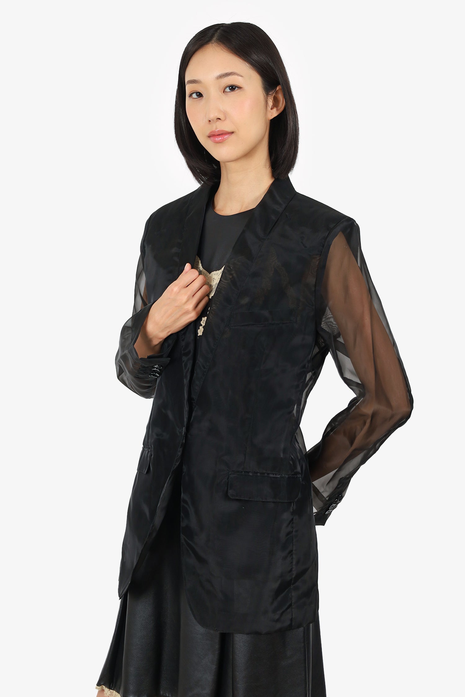 Refresh availabilityDolce & Gabbana Black Organza Single Breasted Blazer. Pull-on. V-neckline. Front button-up closure. Sleeve cuffs with button-up closure. 3 exterior pockets; 2 flap and 1 slip. Single rear vent. Shoulder pads. See-through body. Tonal stitching.