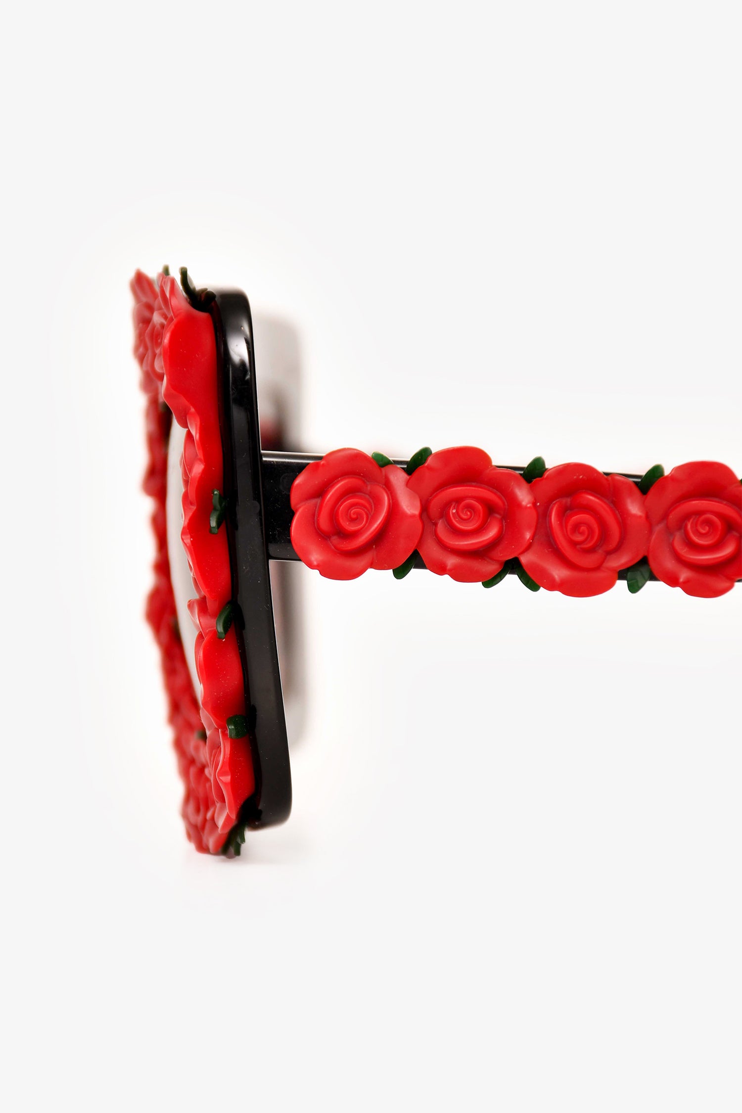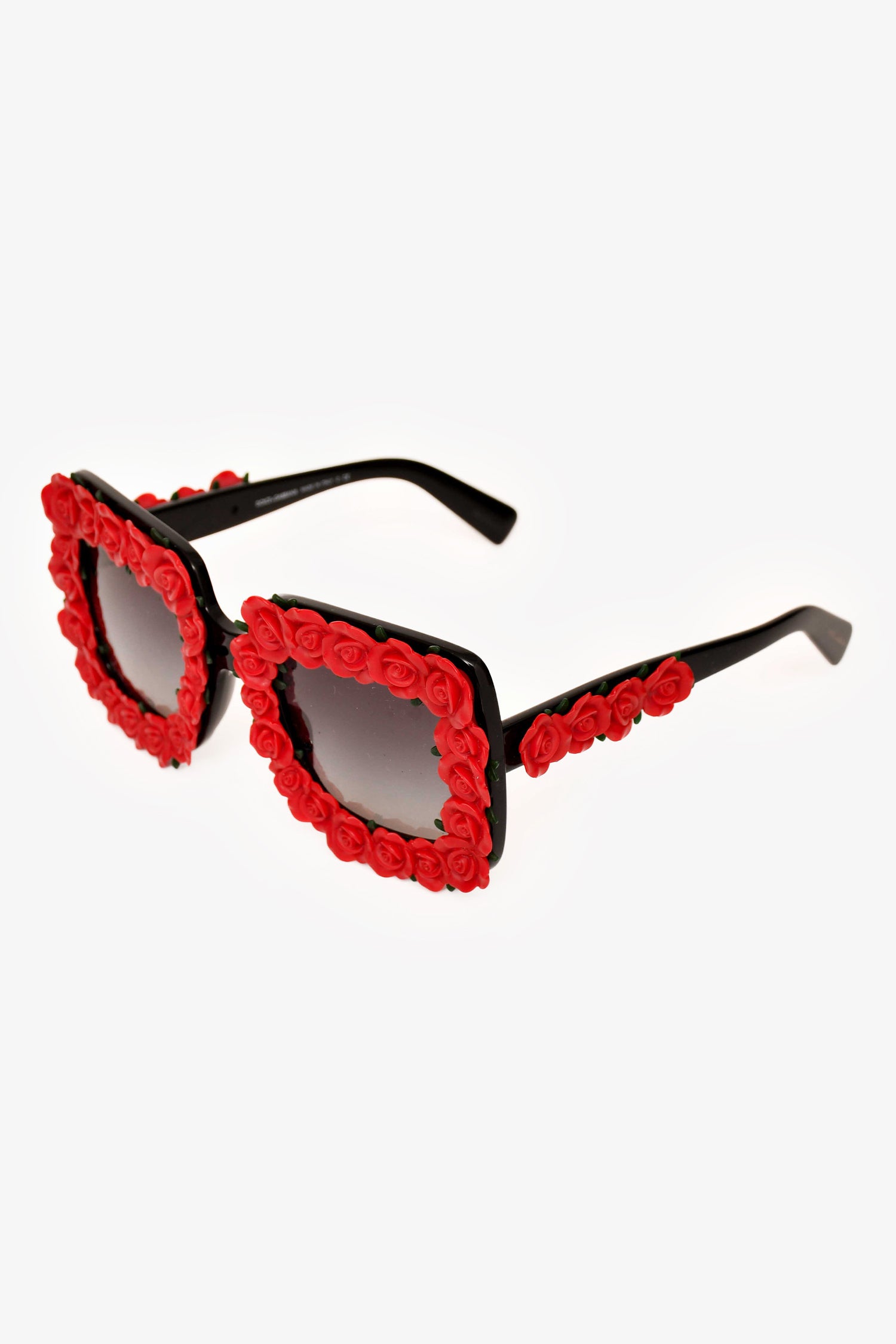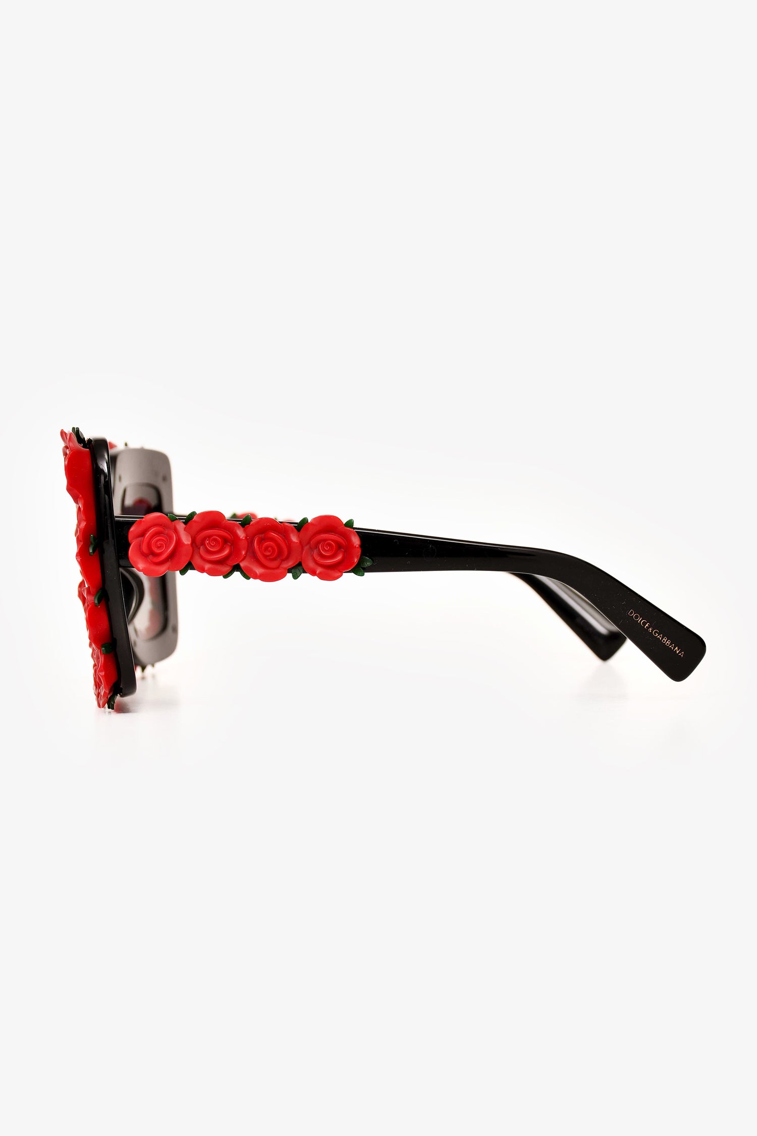 Refresh availabilityDolce & Gabbana Black/Red Rose Embellished Square Sunglasses. Rose embellishments on frame and arms.