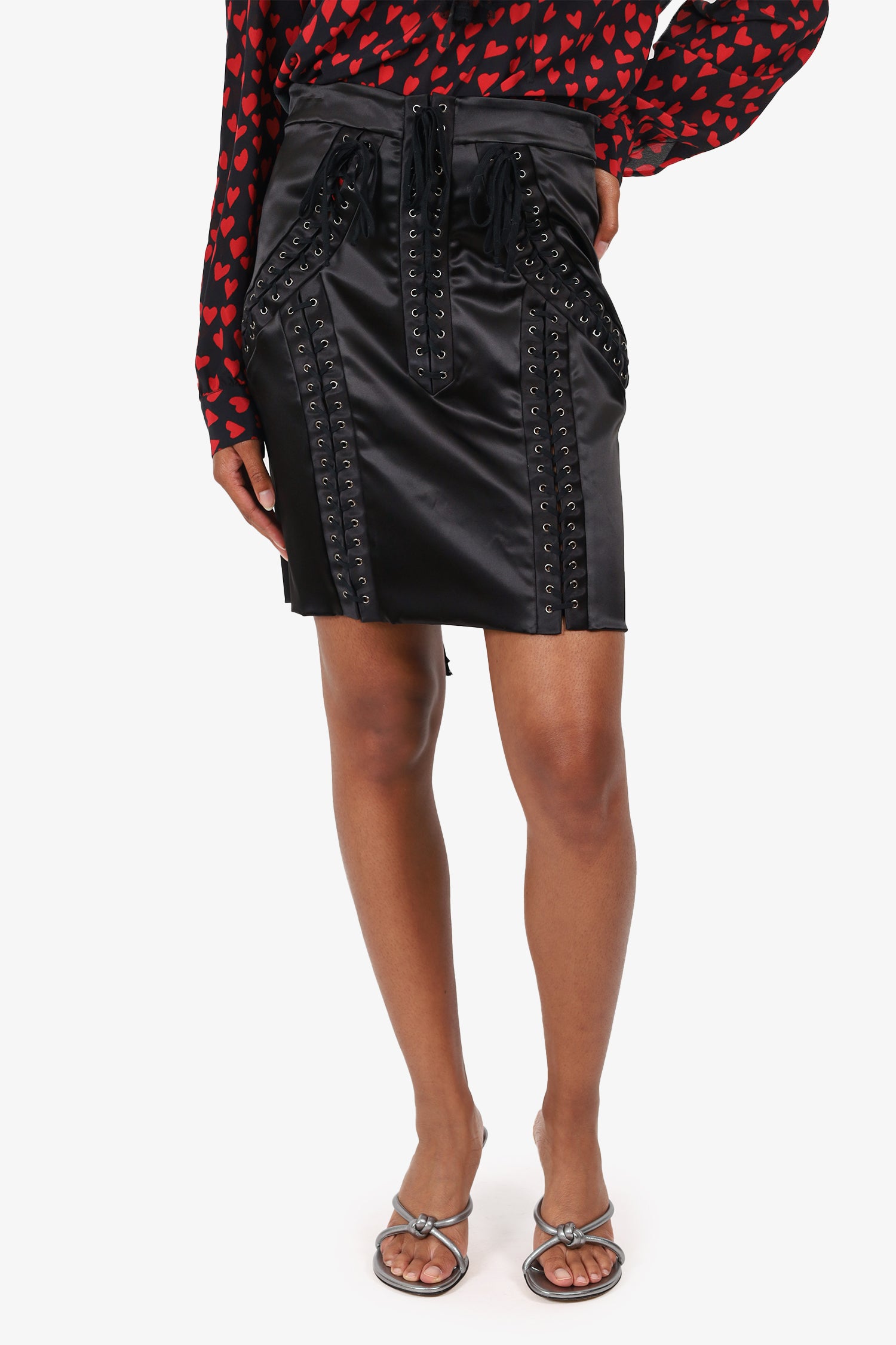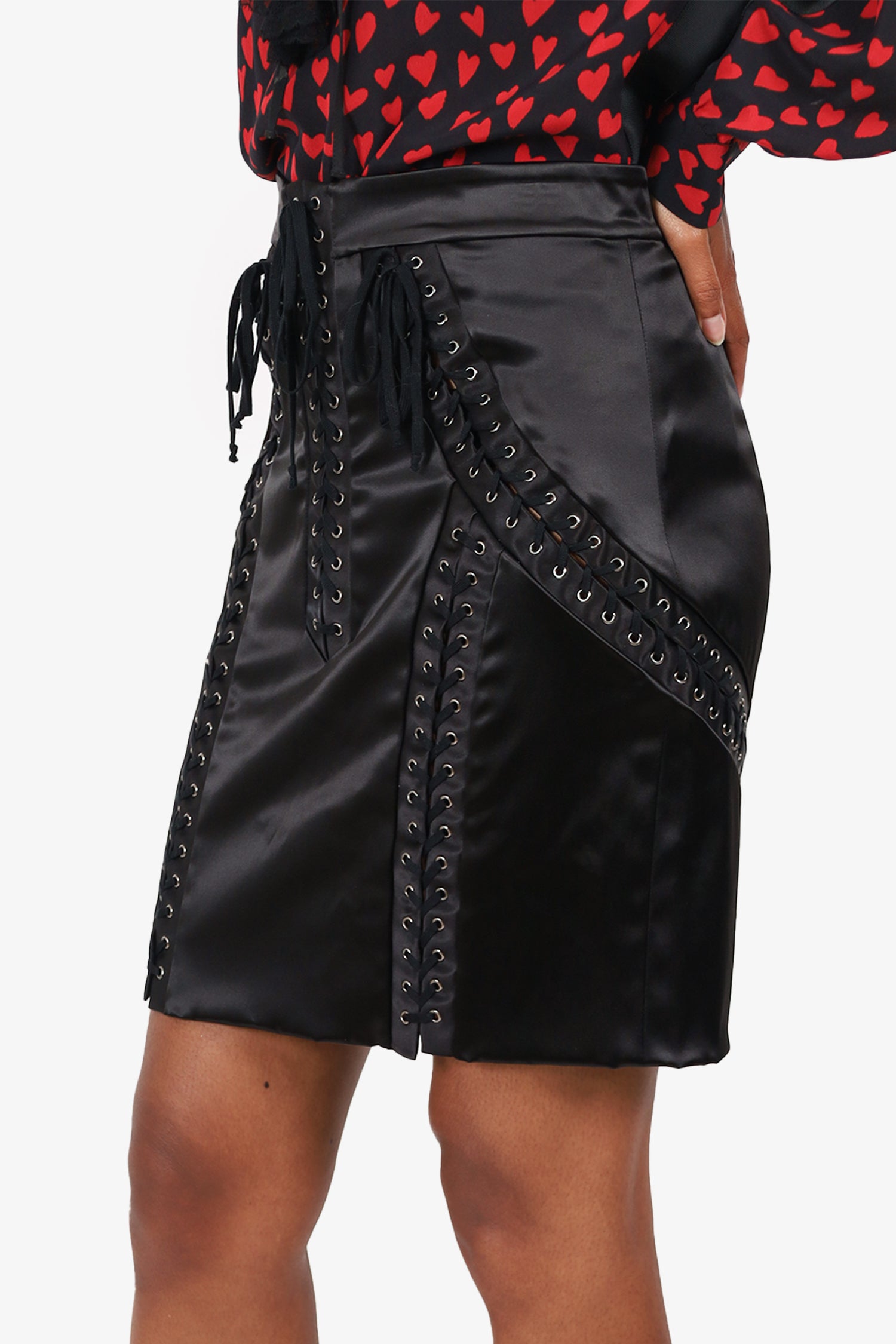 Refresh availabilityDolce & Gabbana Black Satin Lace Up Skirt. Slip-on. Rear zip closure. Front lace-up closure. Unlined. Tonal stitching.