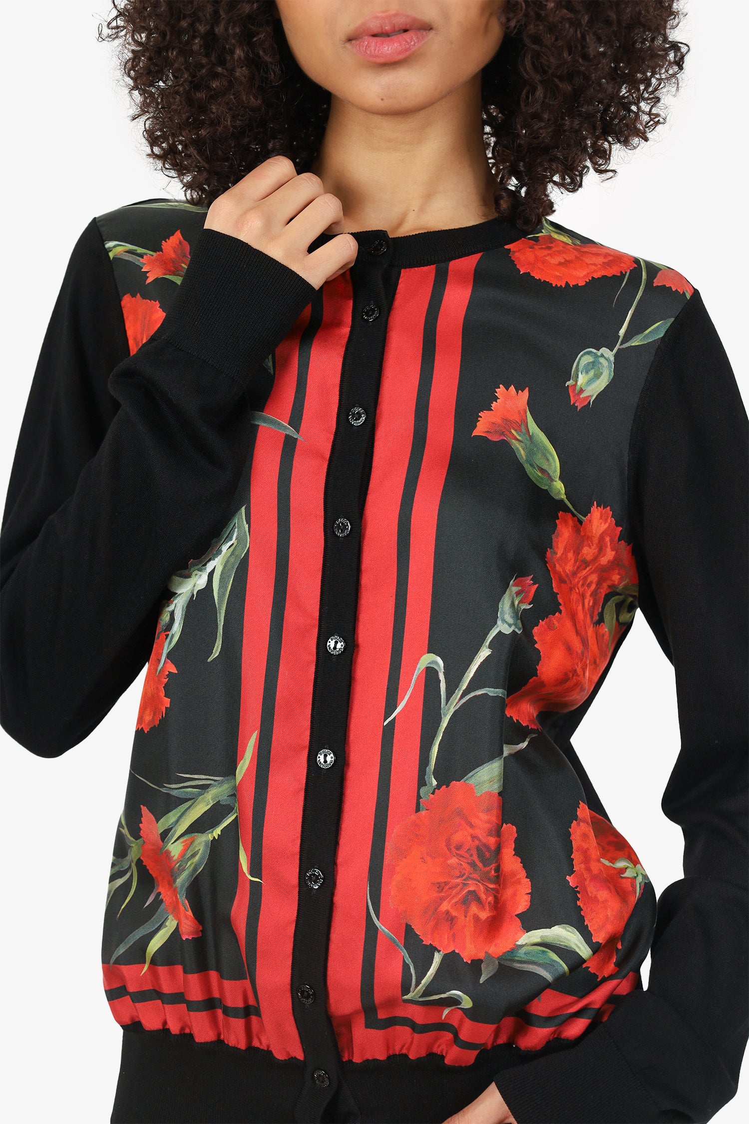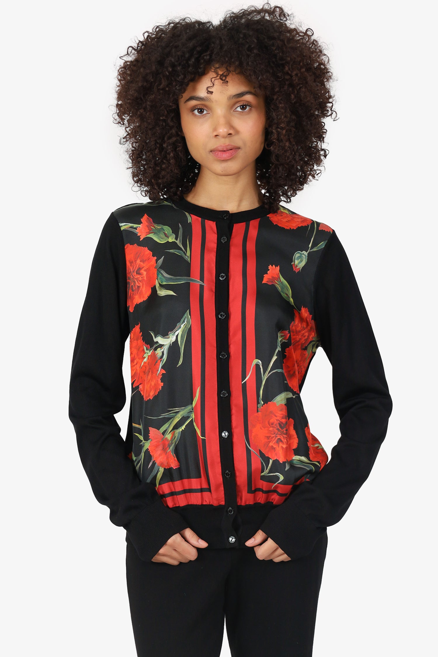 Refresh availabilityDolce & Gabbana Black Silk Floral Print Cardigan. Pull-on. Round neckline. Front button-up closure. Tonal stitching.