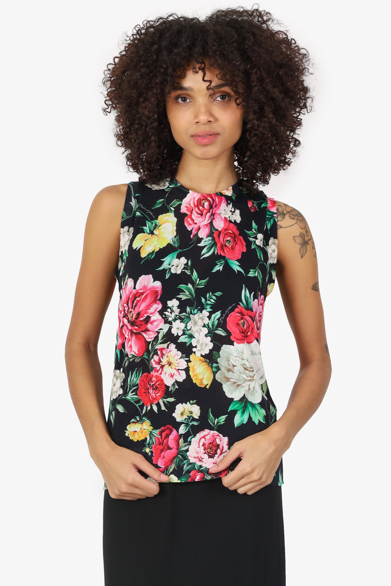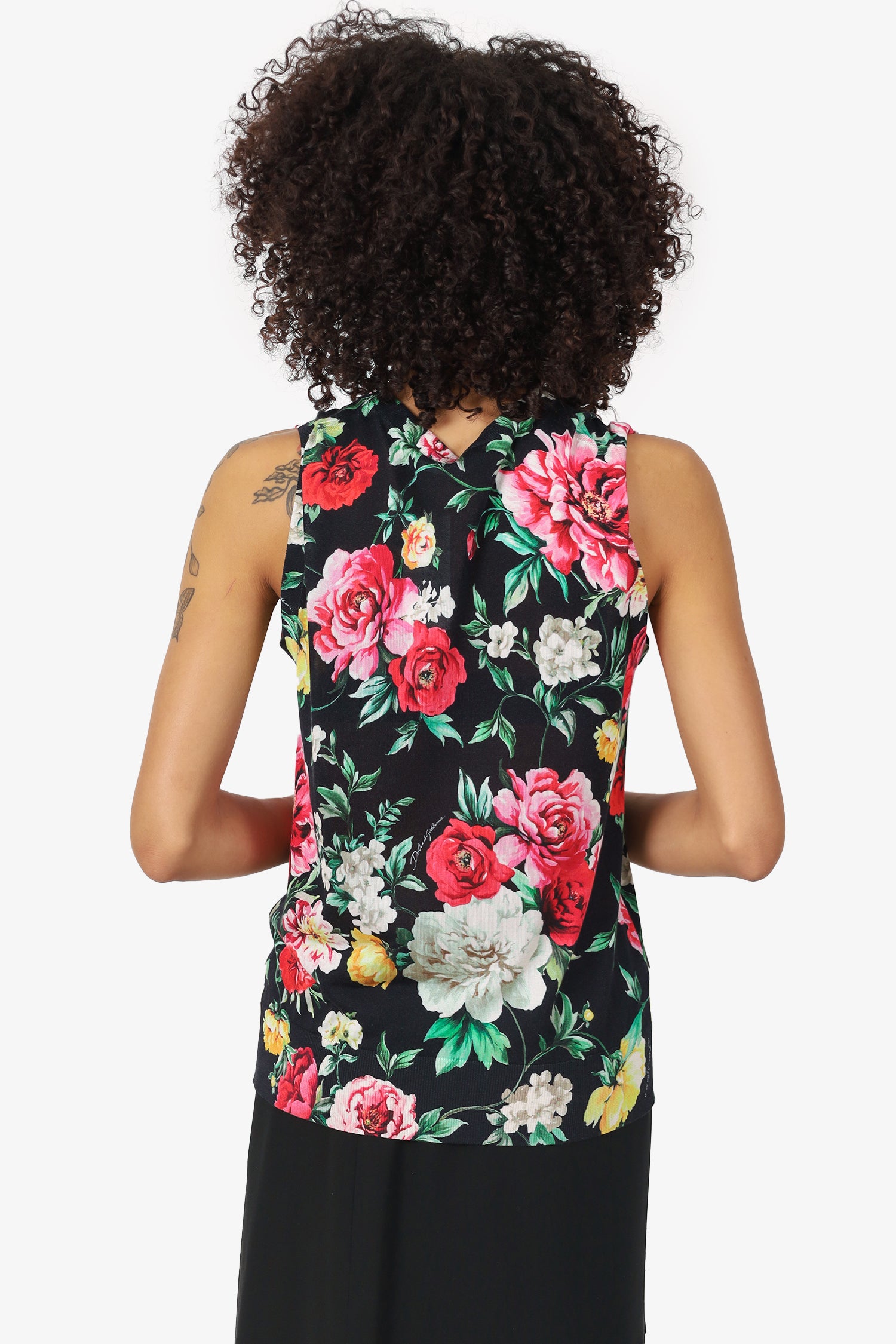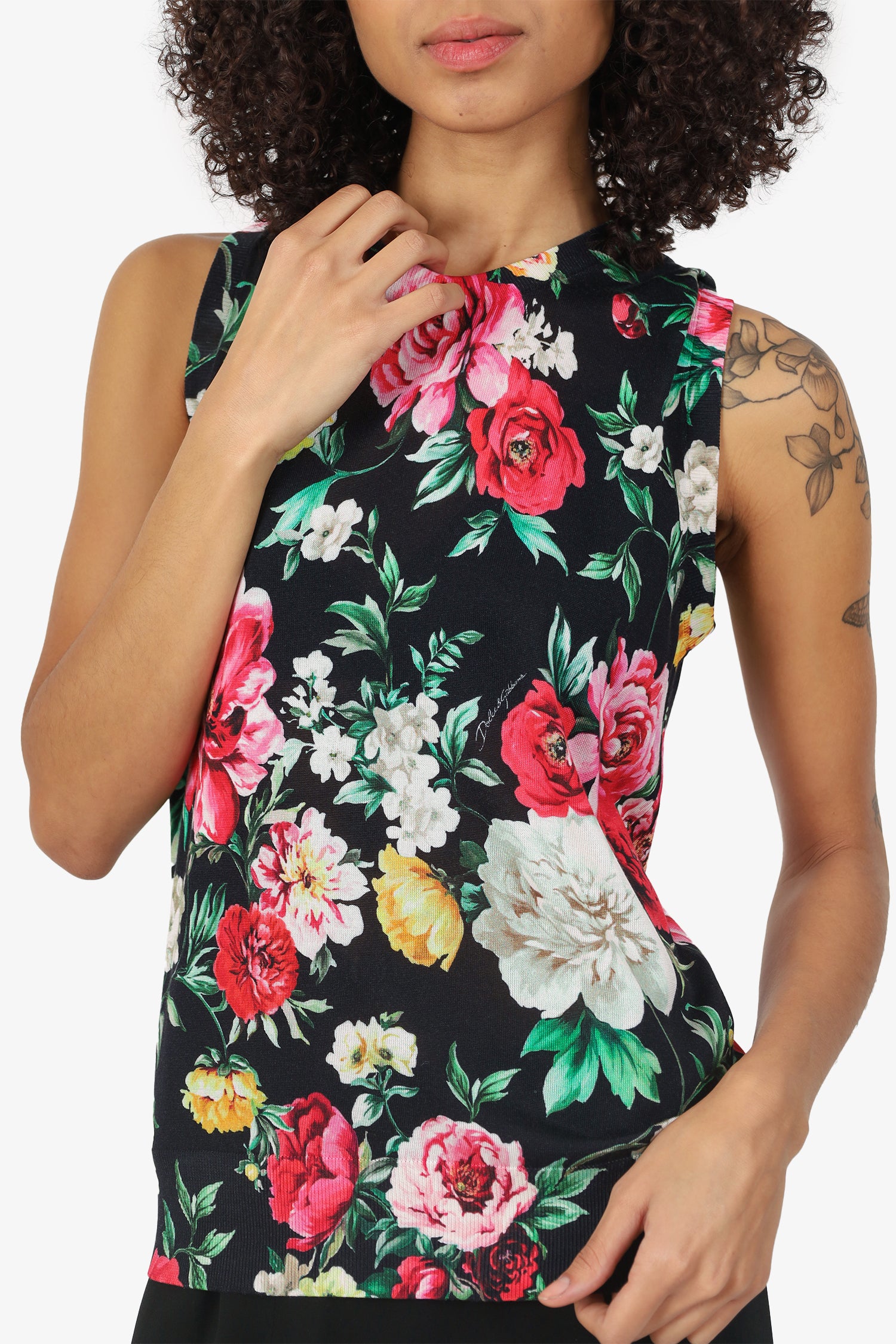 Refresh availabilityDolce & Gabbana Black Silk Floral Print Knitted Sleeveless Sweater. Pull-on. Round neckline. Tonal stitching.