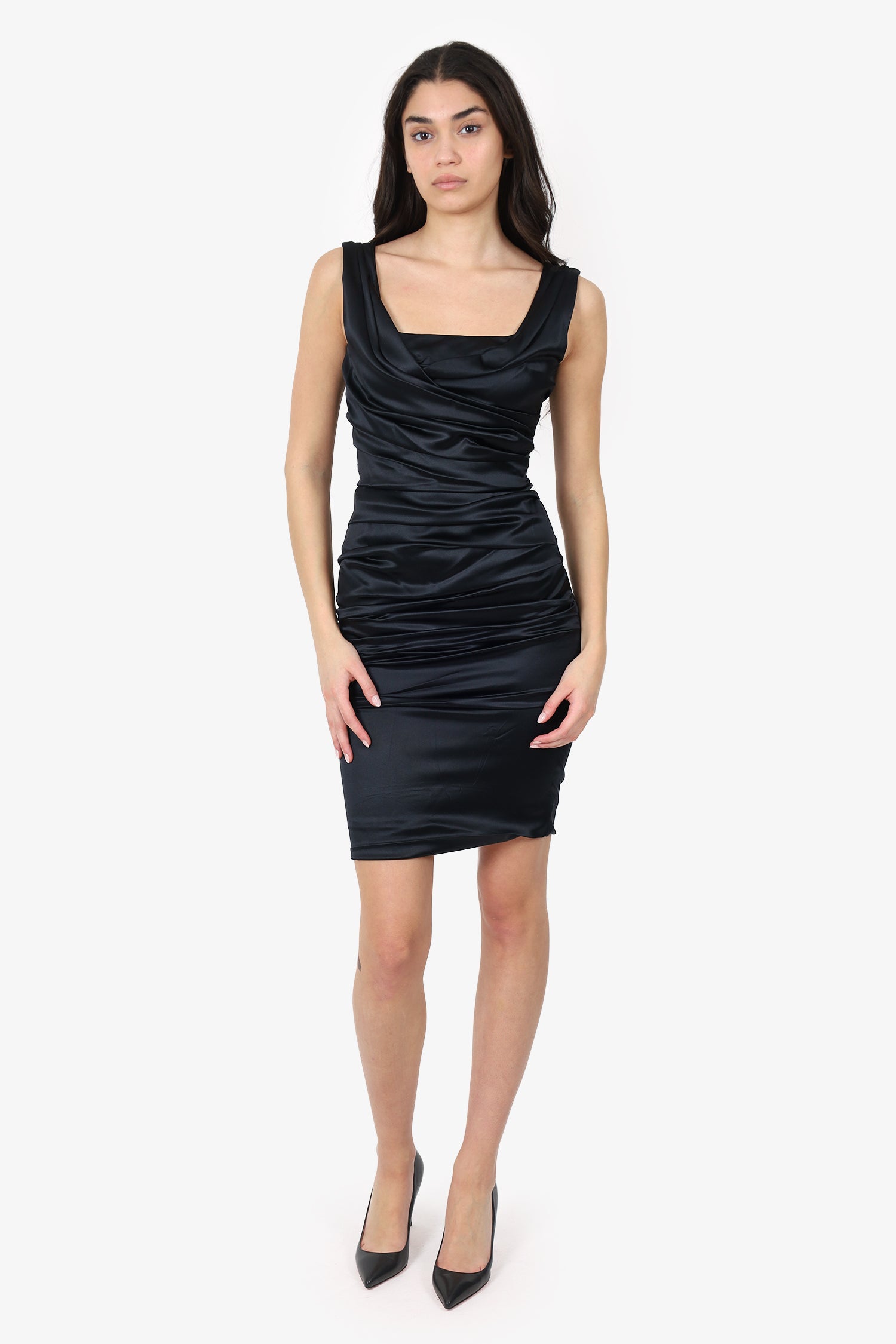 Refresh availabilityDolce & Gabbana Black Silk Satin Ruched Knee Length Dress. Slip-on. Square neckline. Rear zip closure. Silver-tone hardware. Tonal stitching.