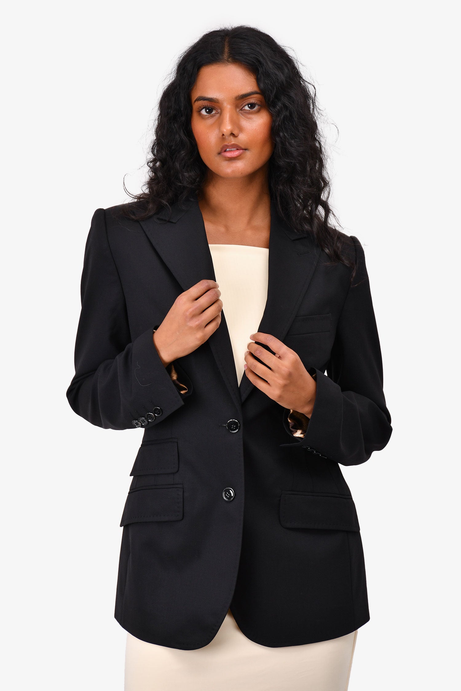 Refresh availabilityDolce & Gabbana Black Virgin Wool Blazer. V-neck. Front button-up closure. Front pockets. Leopard print lining. Padded shoulders.