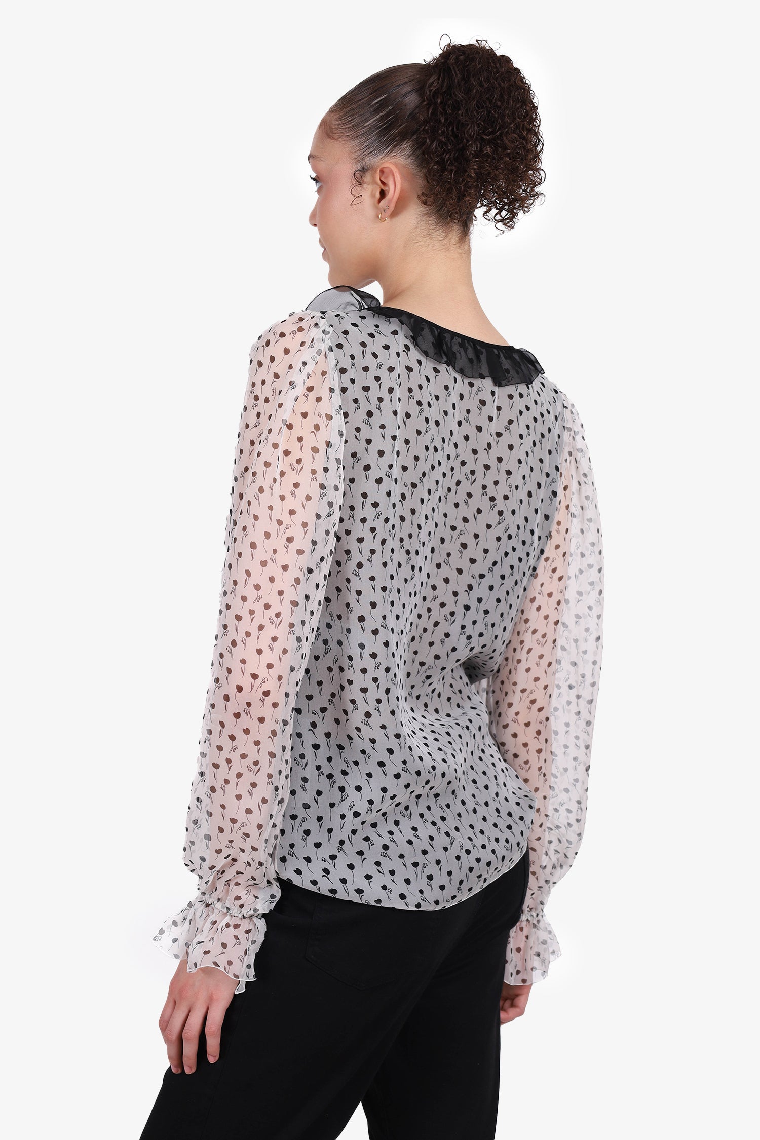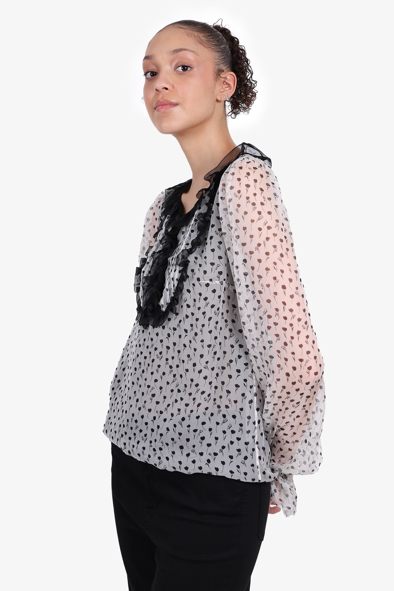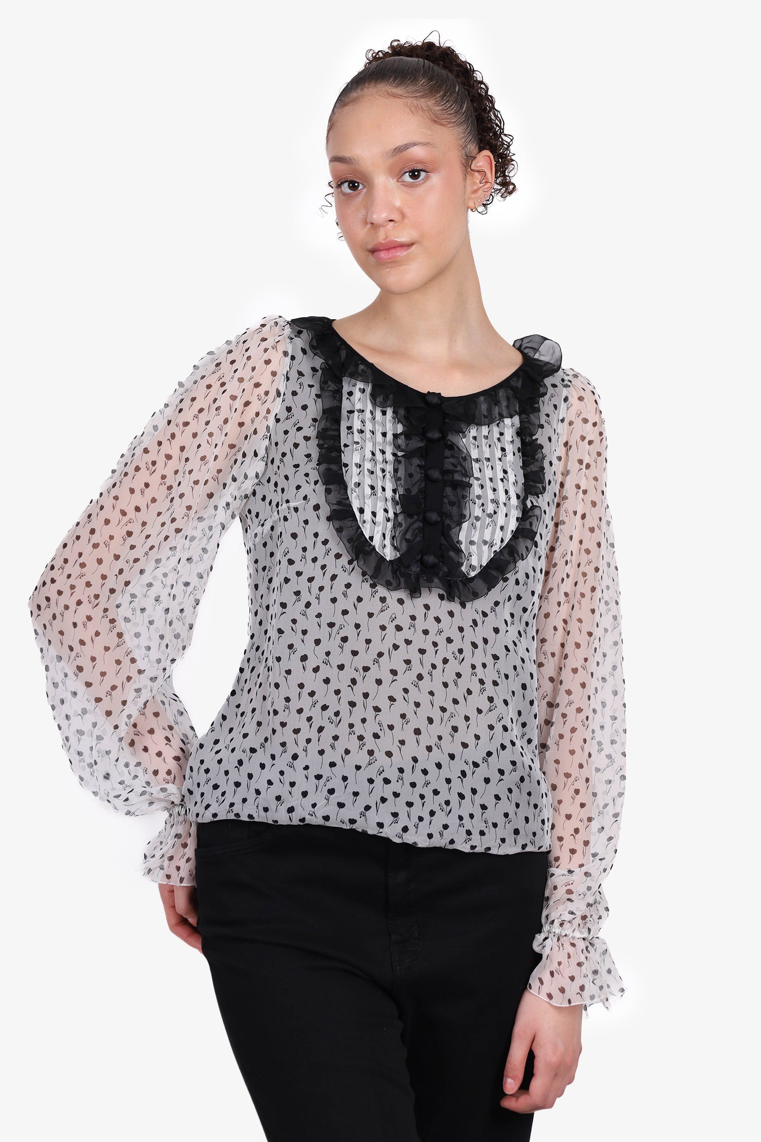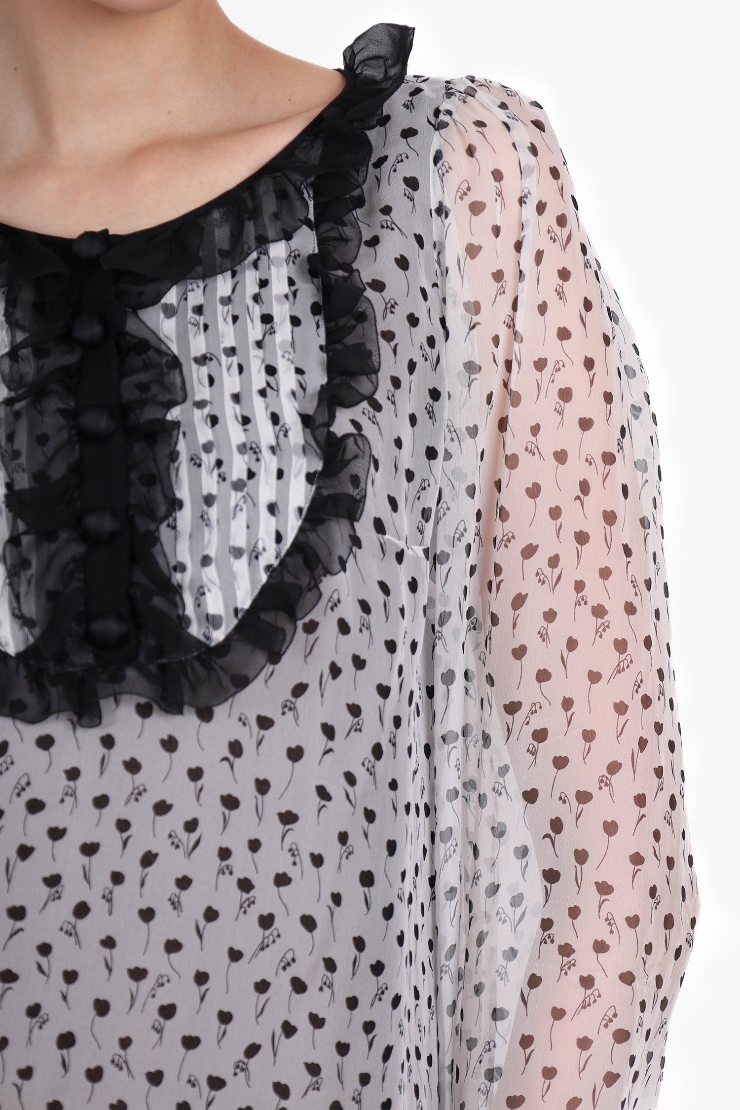 Refresh availabilityDolce & Gabbana Black/White Long-Sleeve Silk Floral Blouse with Ruffles. Round neckline. Pull-on. Tonal stitching.