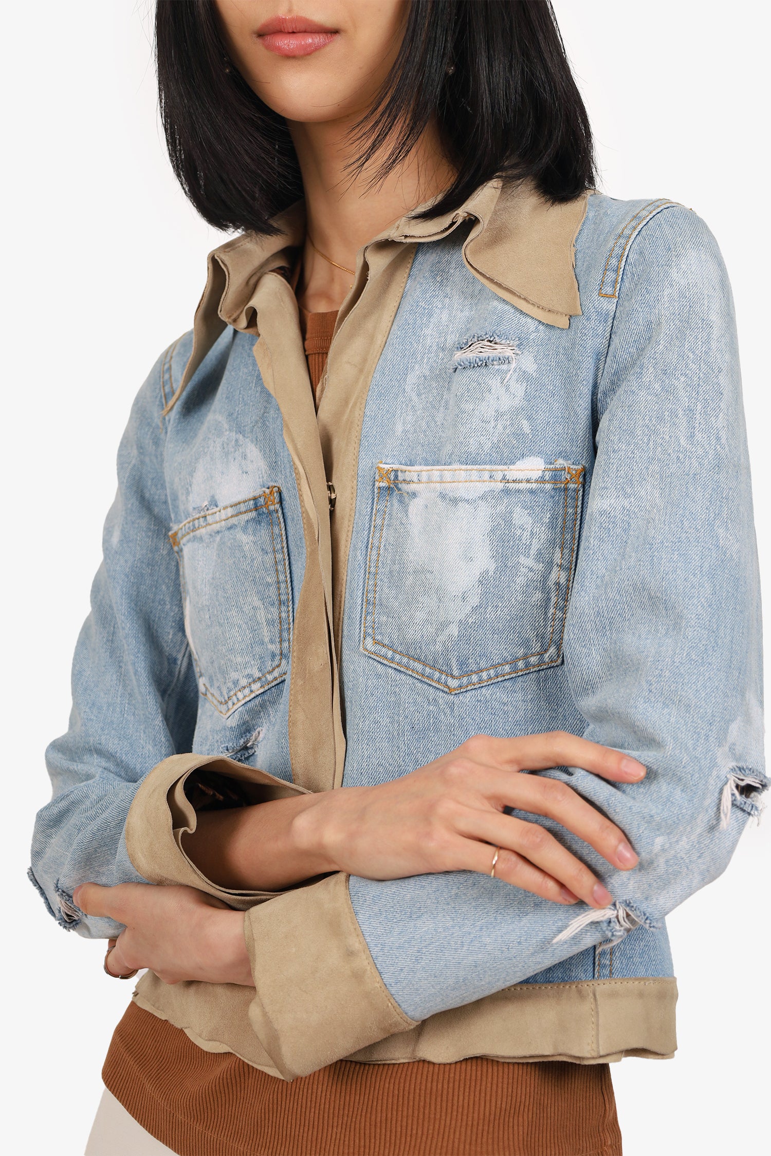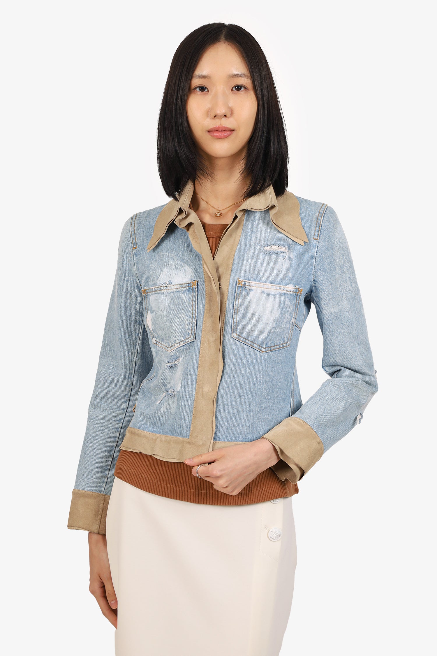 Refresh availabilityDolce & Gabbana Blue/Beige Distressed Denim Jacket. Collared neckline. Front snap-button closure. Suede sleeve cuffs, collar, bottom hem and button-line. 2 front exterior slip pockets. Leopard print-lined interior. Copper-toned hardware. Contrast stitching.