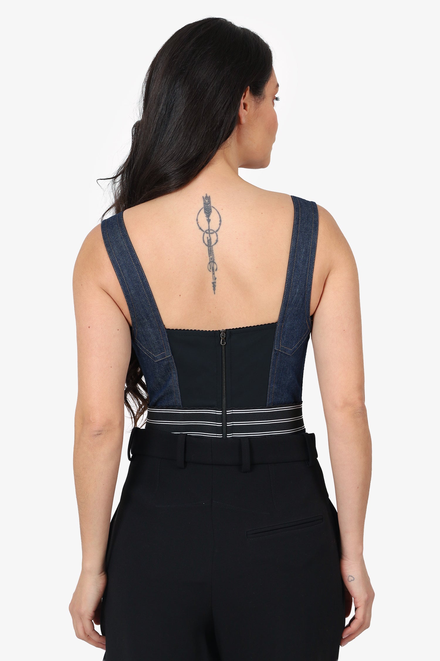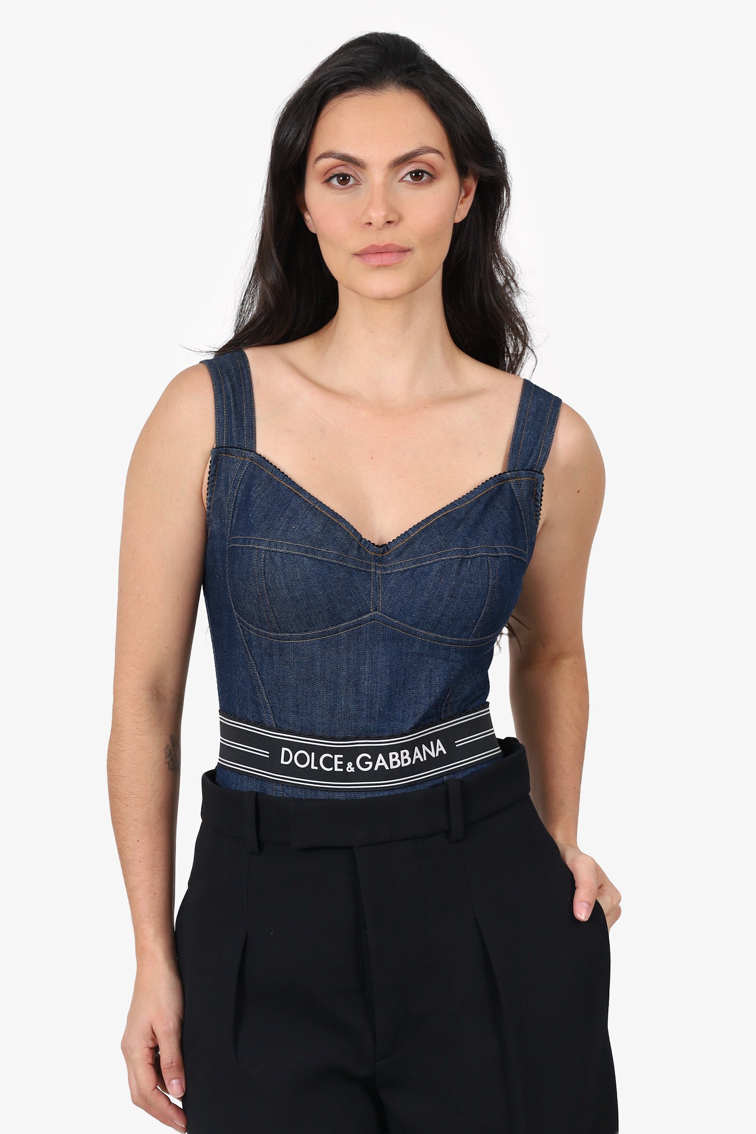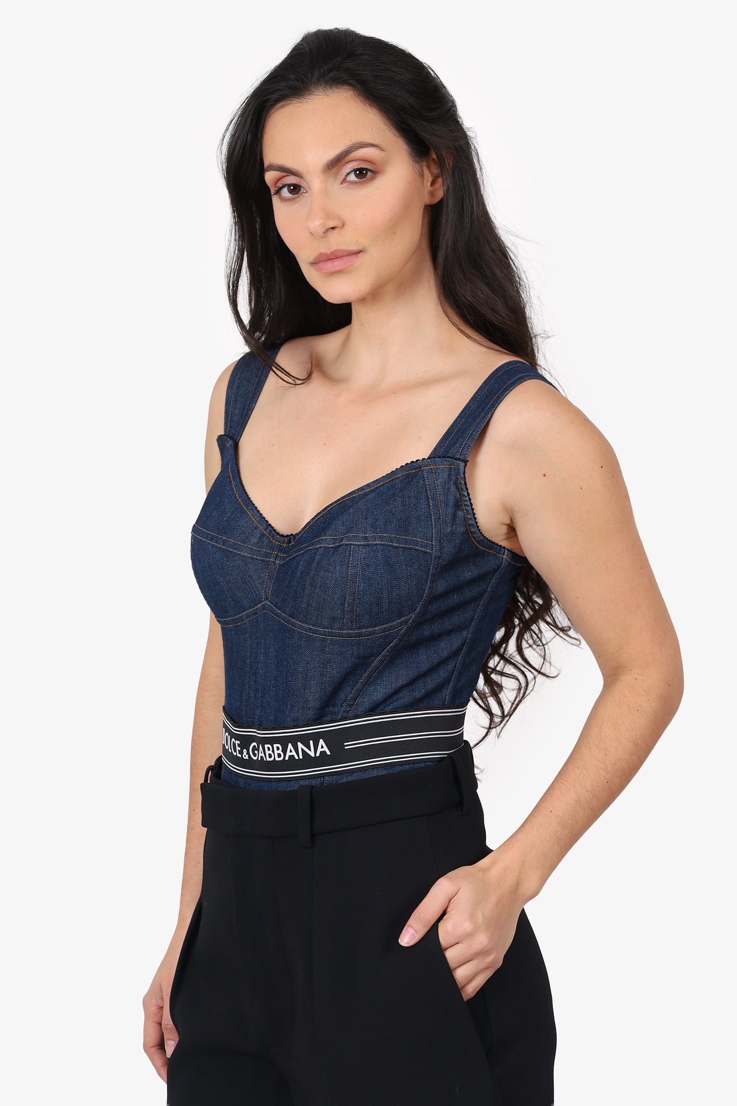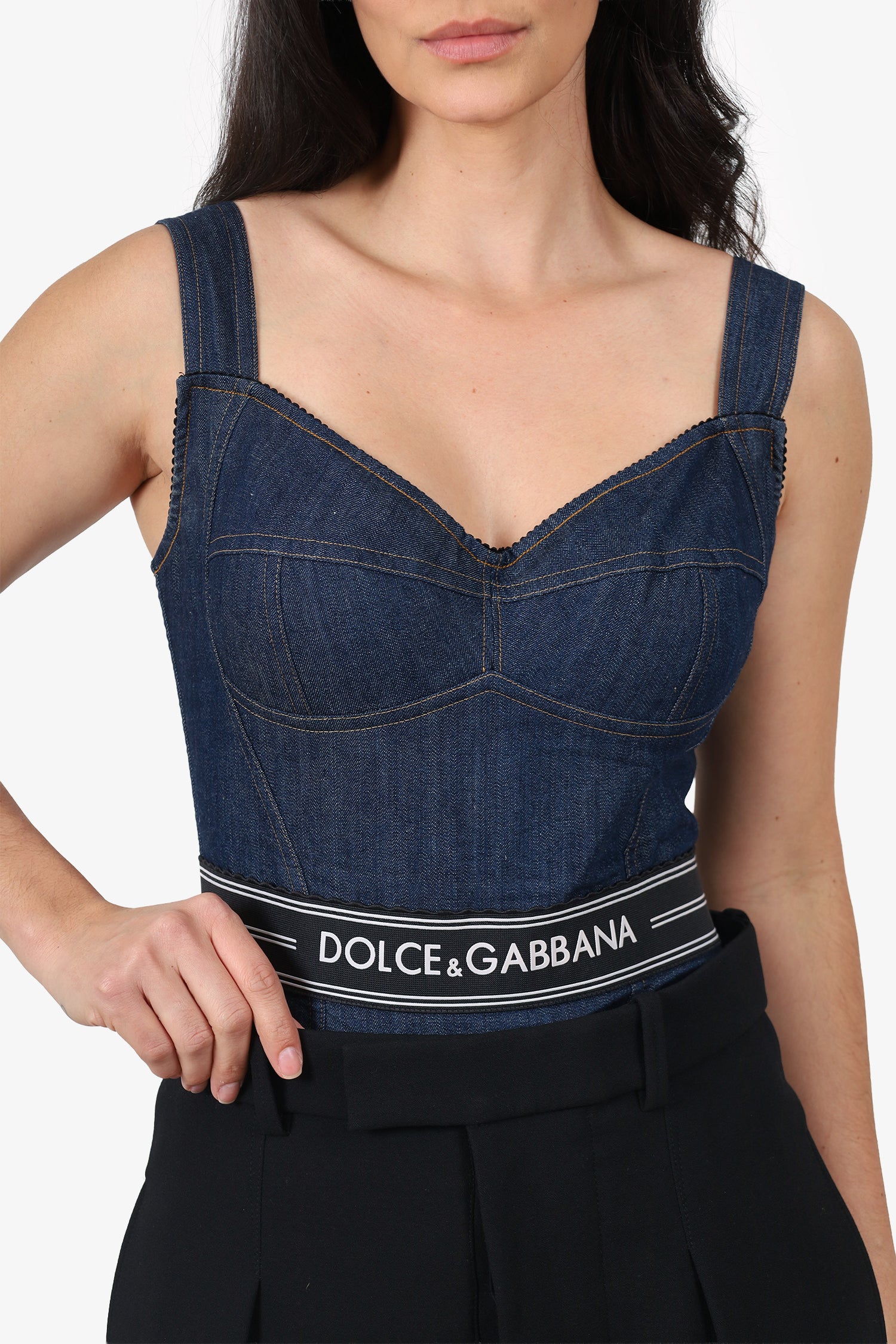 Refresh availabilityDolce & Gabbana Blue Denim Logo Body. Slip-on. Bustier neckline. Rear zip closure. Bottom hook closure. Built-in boning. Contrast stitching.