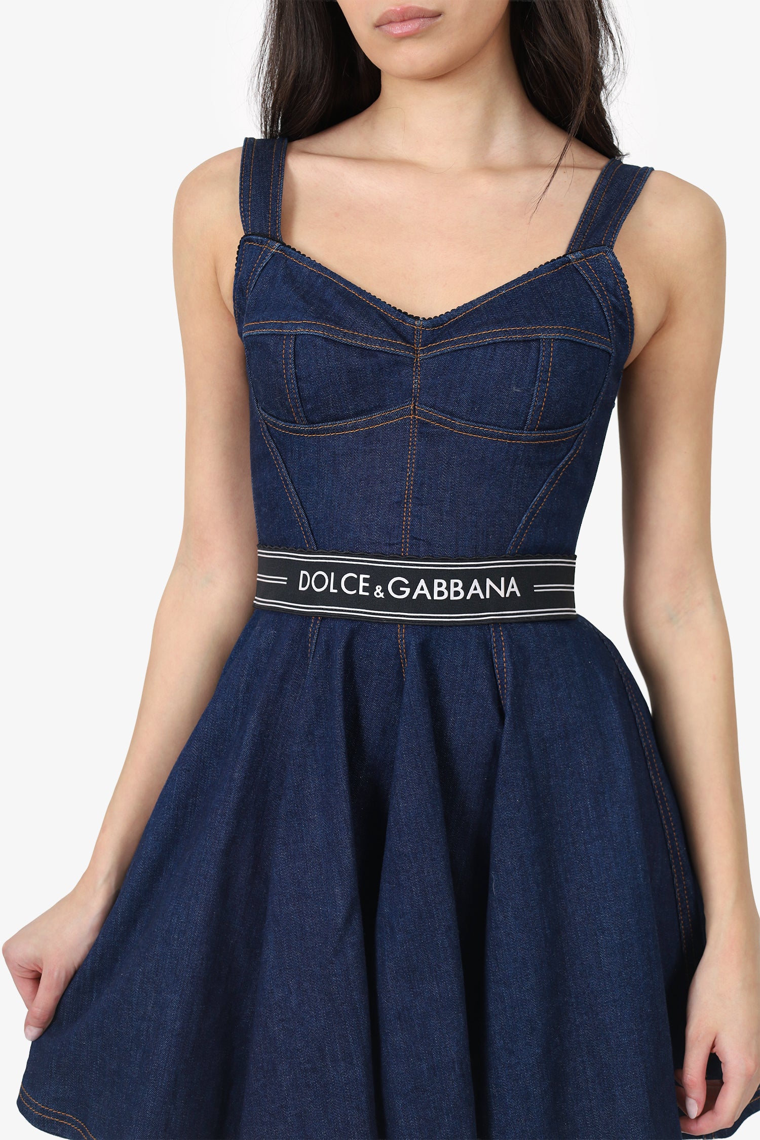 Refresh availabilityDolce & Gabbana Blue Denim Logo Corset Mini Dress. Slip-on. Sweetheart neckline. Rear zip with hook-up closure. Silver-tone hardware. Contrast and tonal stitching.