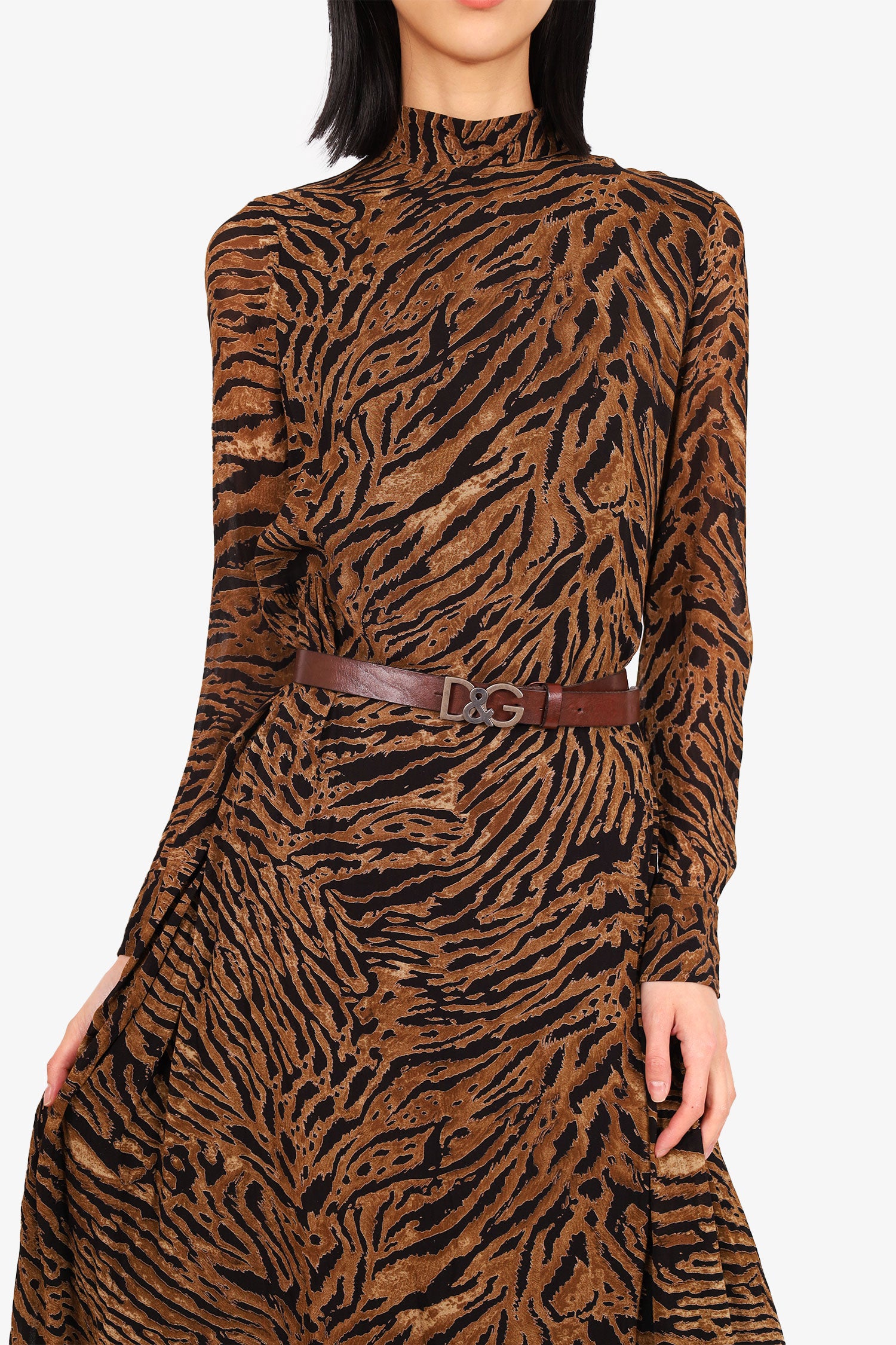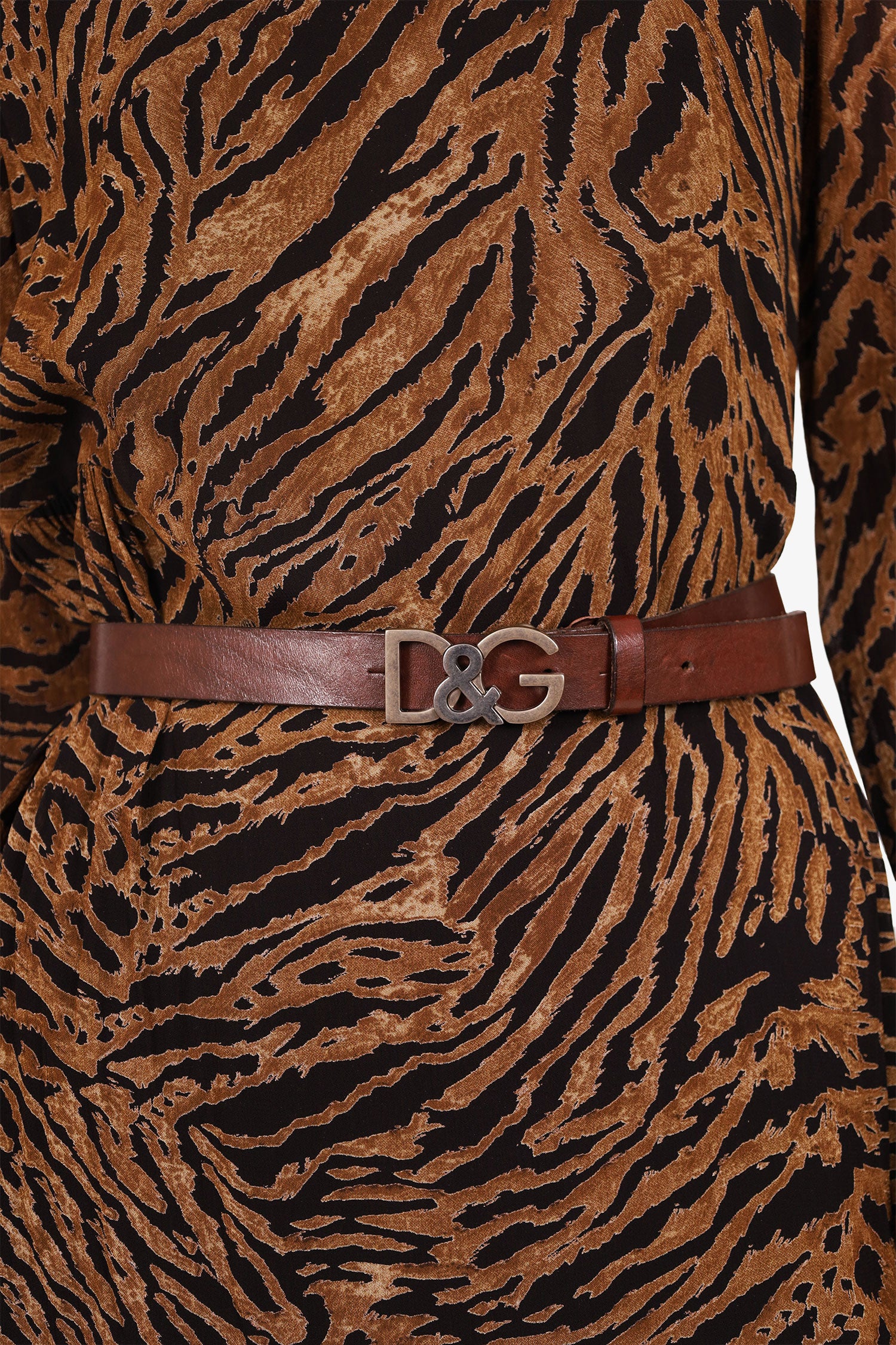 Refresh availabilityDolce & Gabbana Brown Leather DG Buckle Belt. Adjustable pull-through buckle closure. Silver-tone hardware. Tonal stitching.