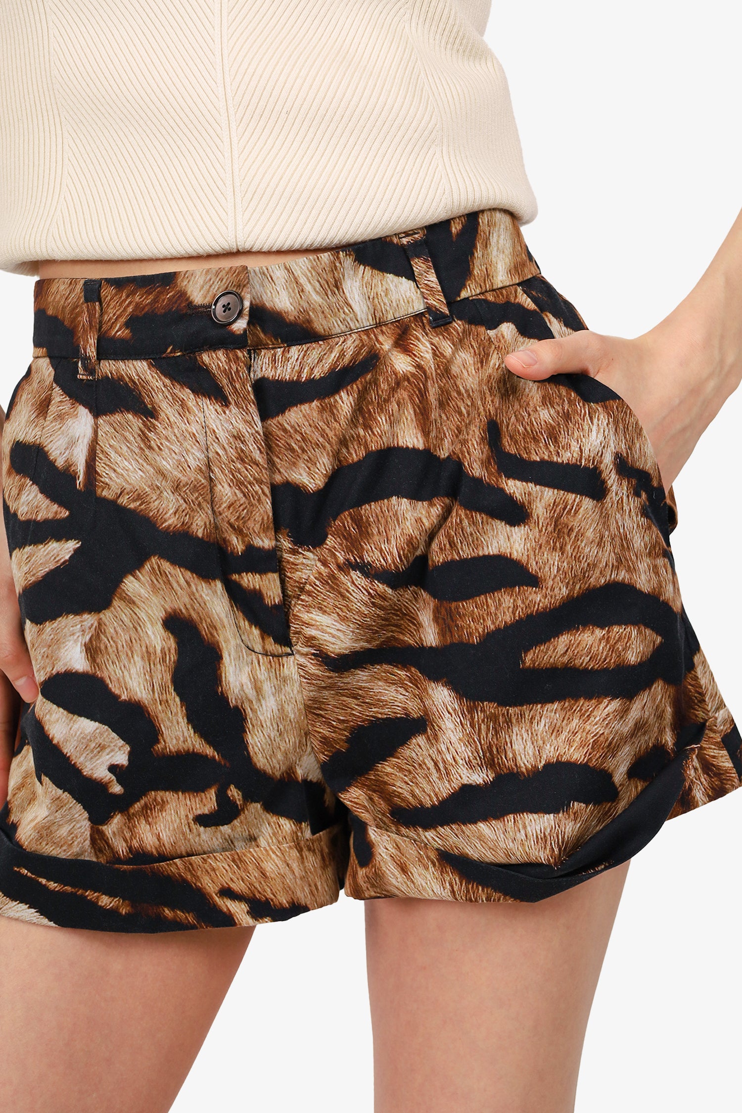 Refresh availabilityDolce & Gabbana Brown Tiger Print High Waisted Shorts. Slip-on. Front zip with button-up closure. 2 front exterior side slip pockets. Cuffed bottom hem. Tonal stitching.