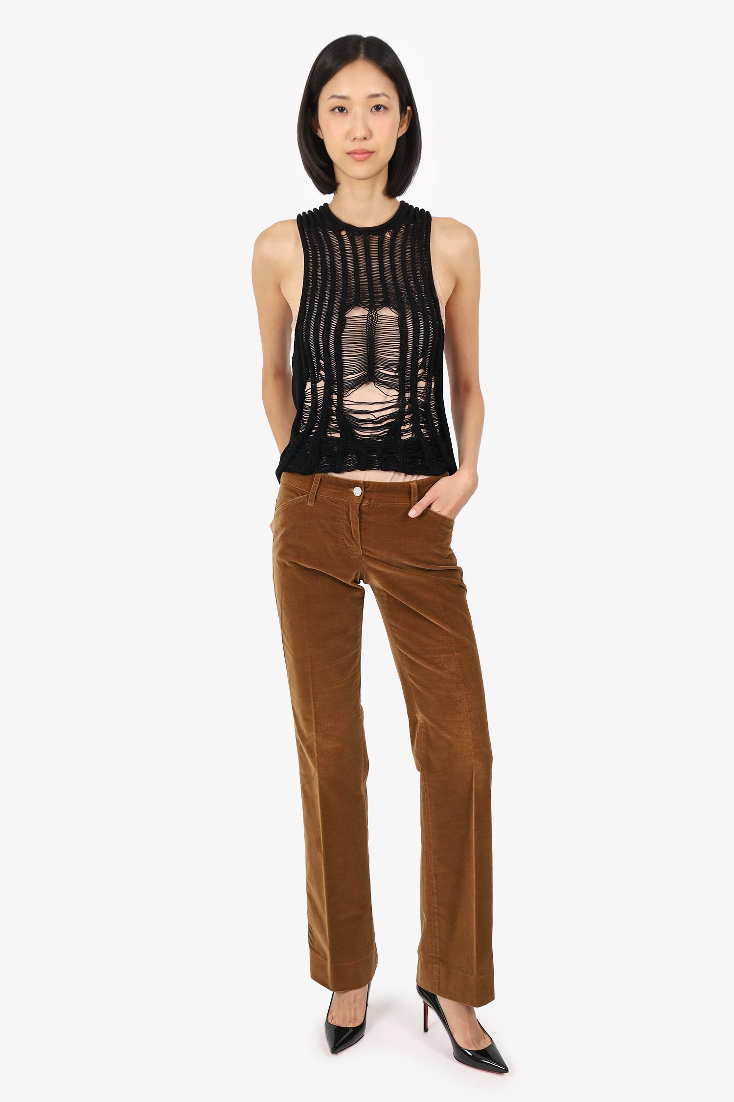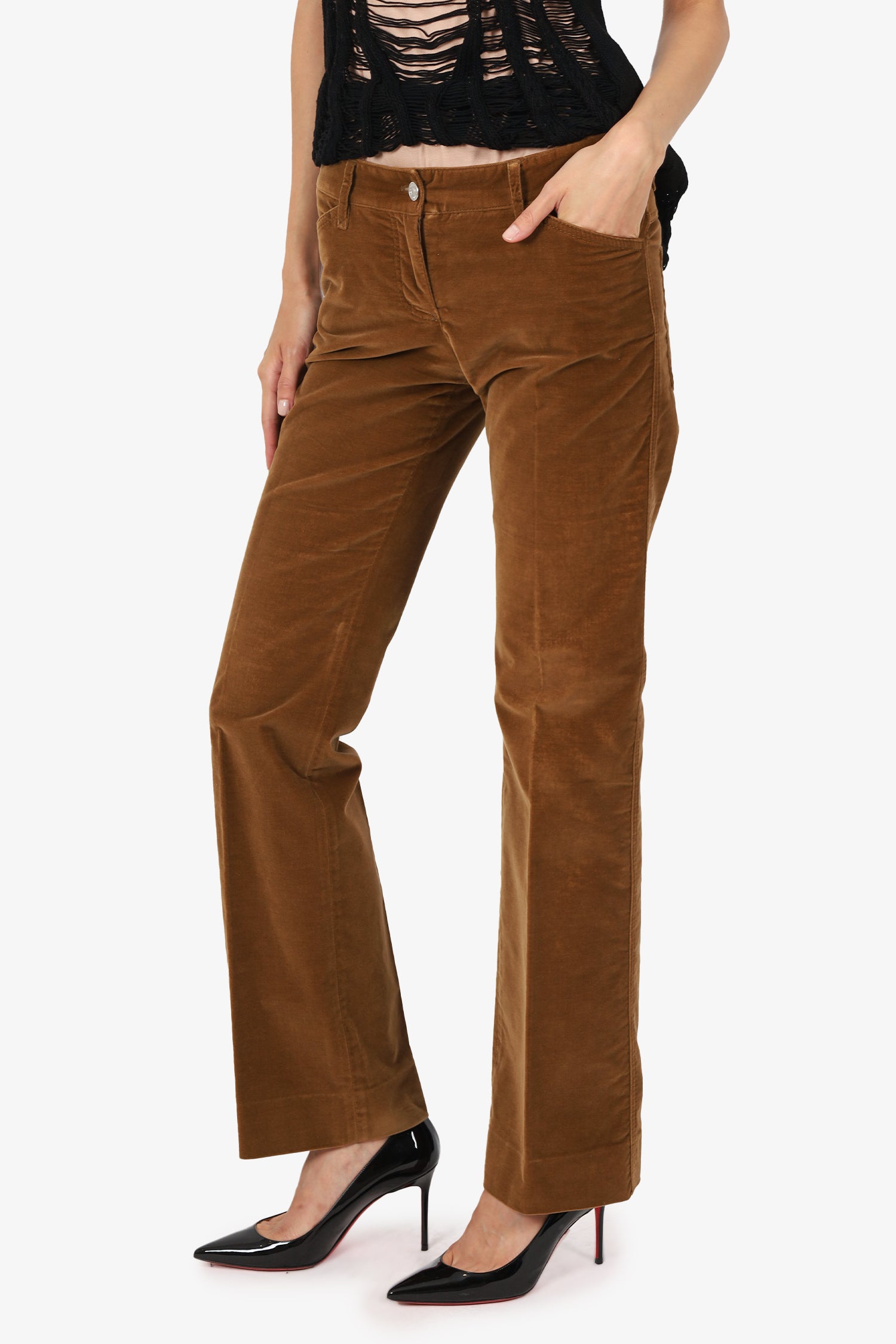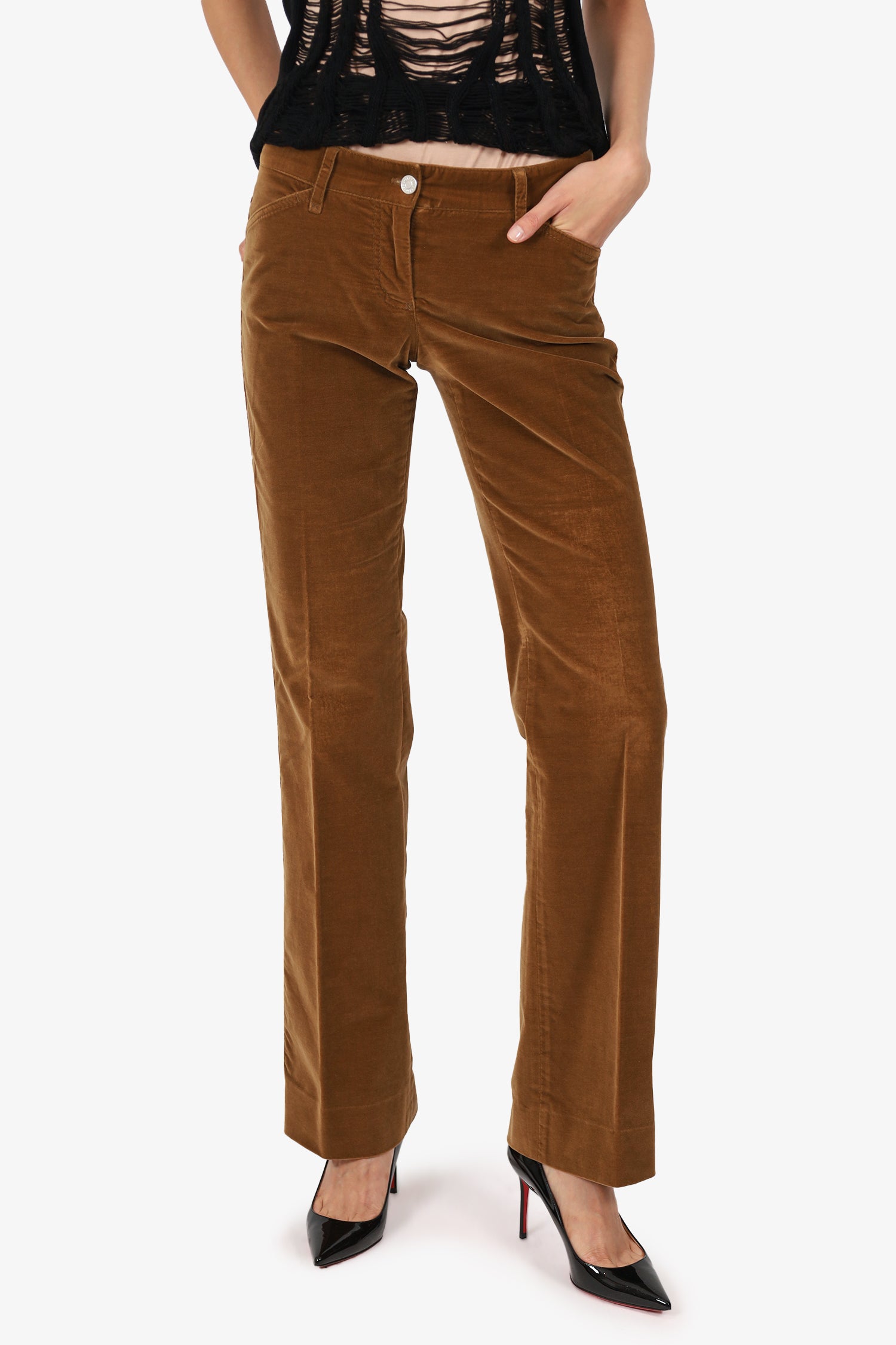 Refresh availabilityDolce & Gabbana Brown Velvet Straight Leg Trousers. Slip-on. Front zip with button closure. Waistband belt loops. 5 exterior pockets; 2 front side slip and 1 mini compartment, 2 rear slip. Logo patch at rear waistband. Silver and gold-tone hardware. Tonal stitching.