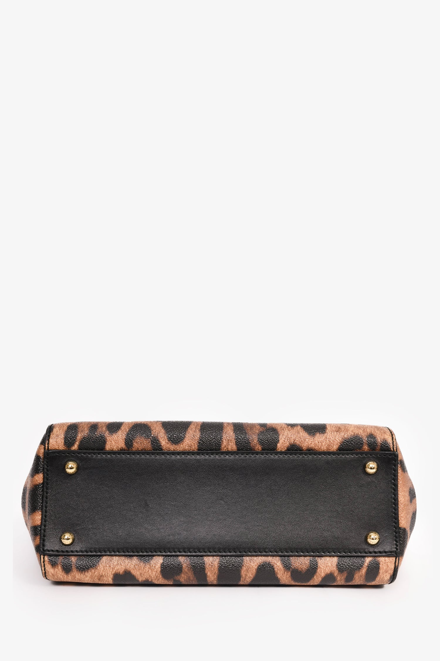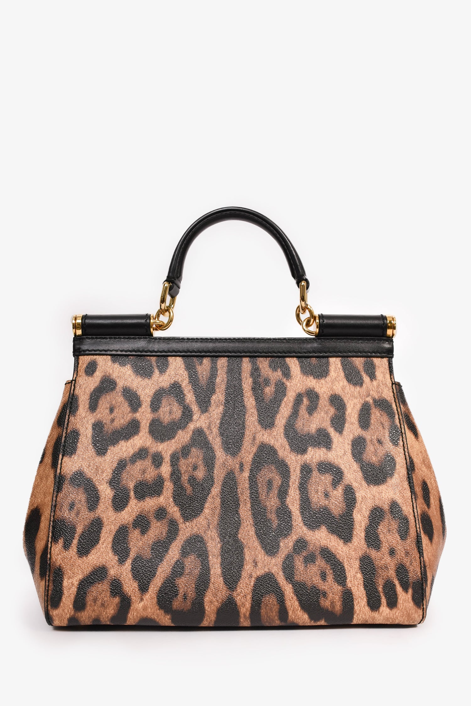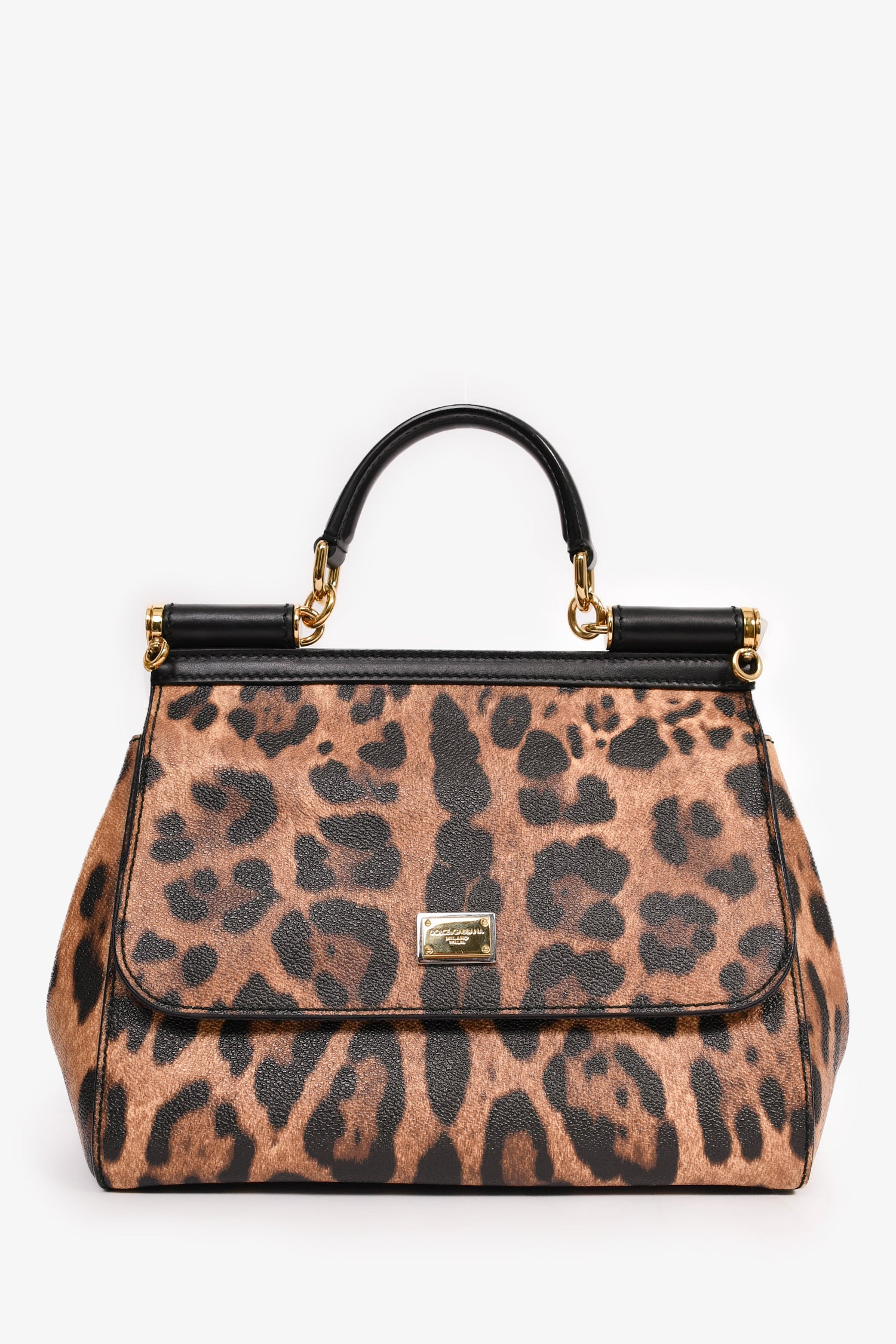 Refresh availabilityDolce & Gabbana Leopard Print Sicily Top Handle Bag with Strap. Front fold-over flap with magnetic button closure. Black interior. Three interior wall pockets; two slip and one with zip closure. Removable handheld interior mini mirror. Detachable and adjustable strap. Protective metal bottom. Gold-tone hardware.